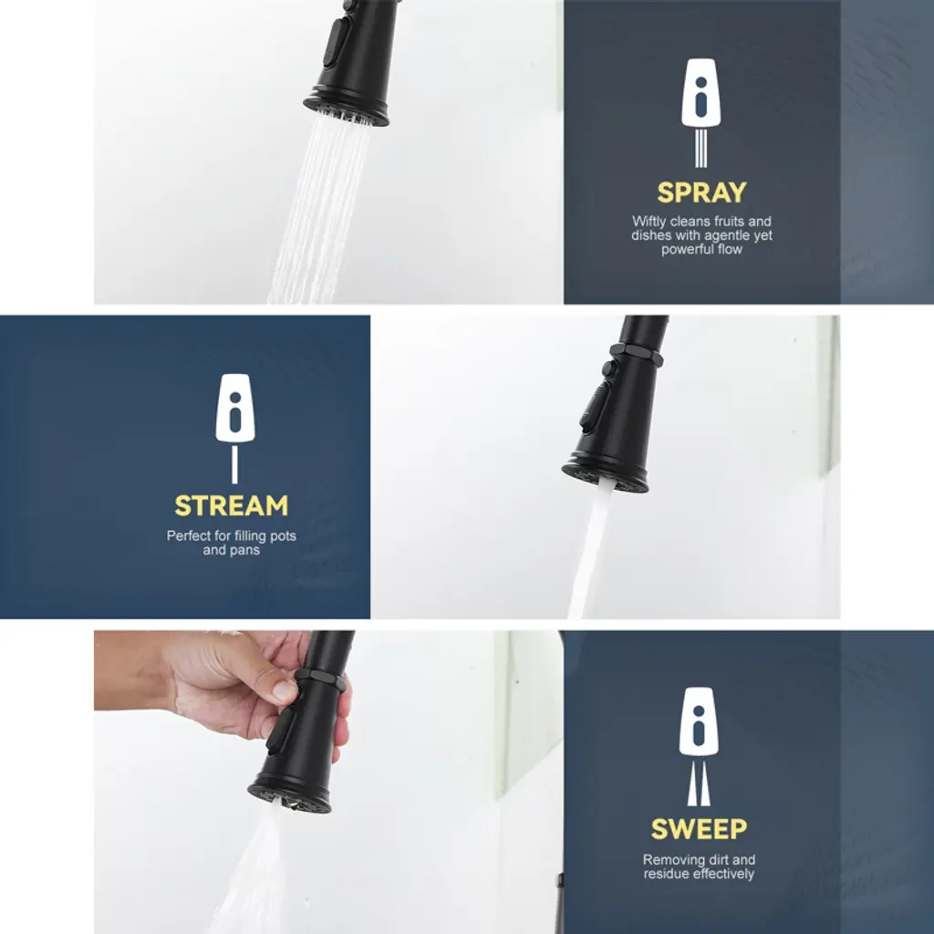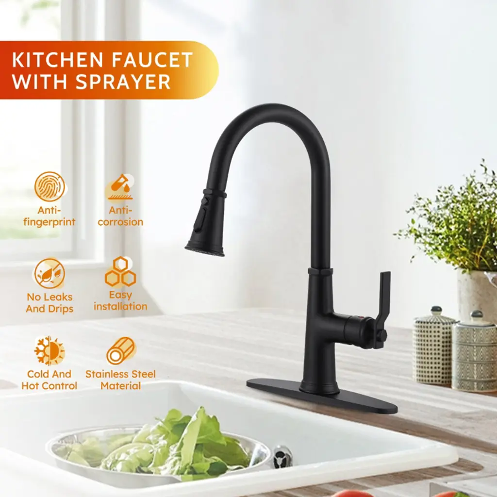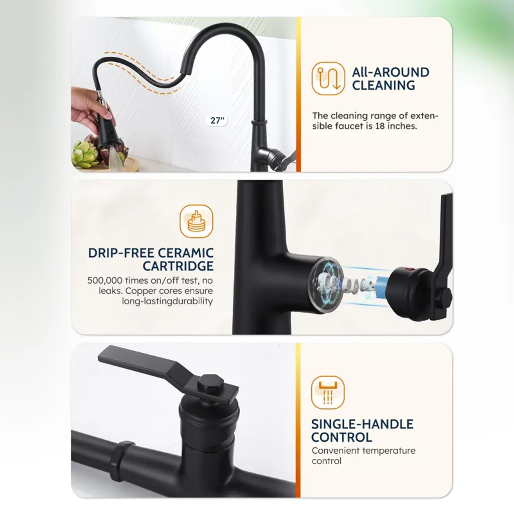 The flexible pull-down, water-saving and efficient, puts kitchen water at your fingertips This faucet is uniquely designed with a pull-down that extends up to 18 in. for easy cleaning of all corners of the sink. Equipped with a 3-mode sprayer with an efficient flow rate of up to 1.8 GPM.Made of 304 stainless steel, it is abrasion and scratch-resistant, with a modern look to add color to your kitchen. Drip-free ceramic cartridges are rigorously tested with precise single-handle control. Hot and cold adjustable, easy to install, complete accessories. Enjoy high-quality after-sales service and fast problem solving.