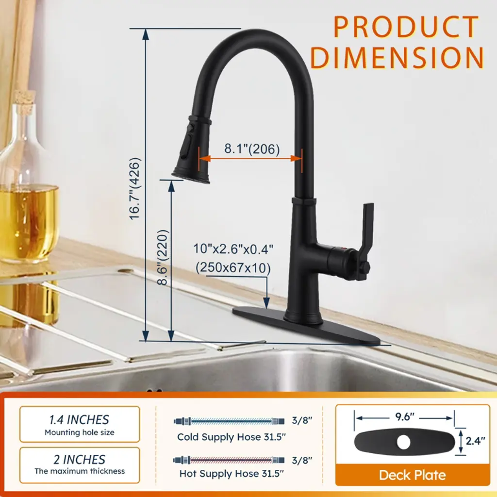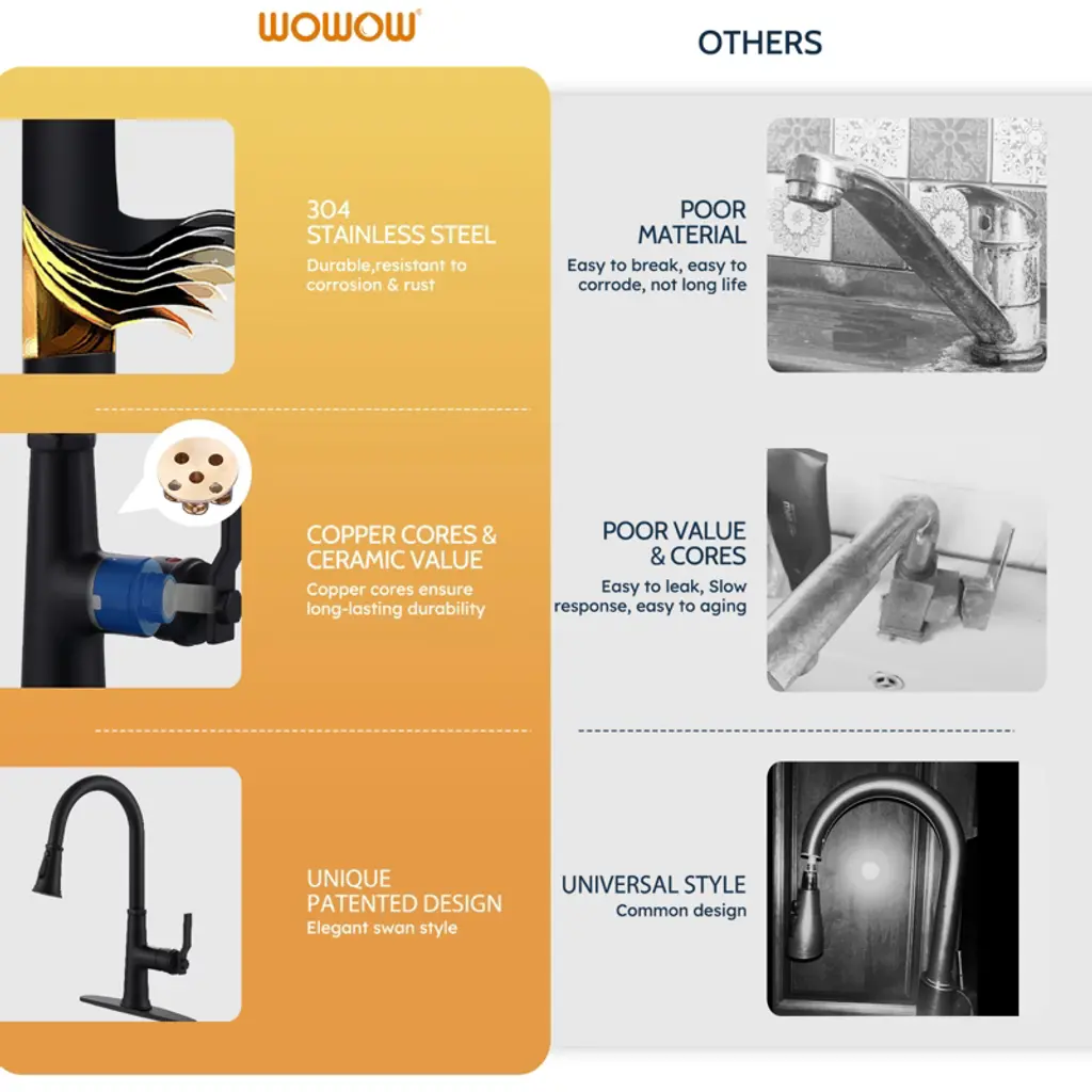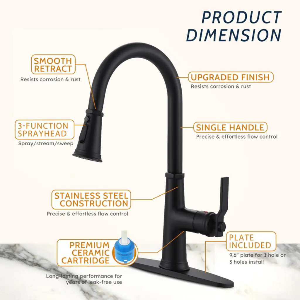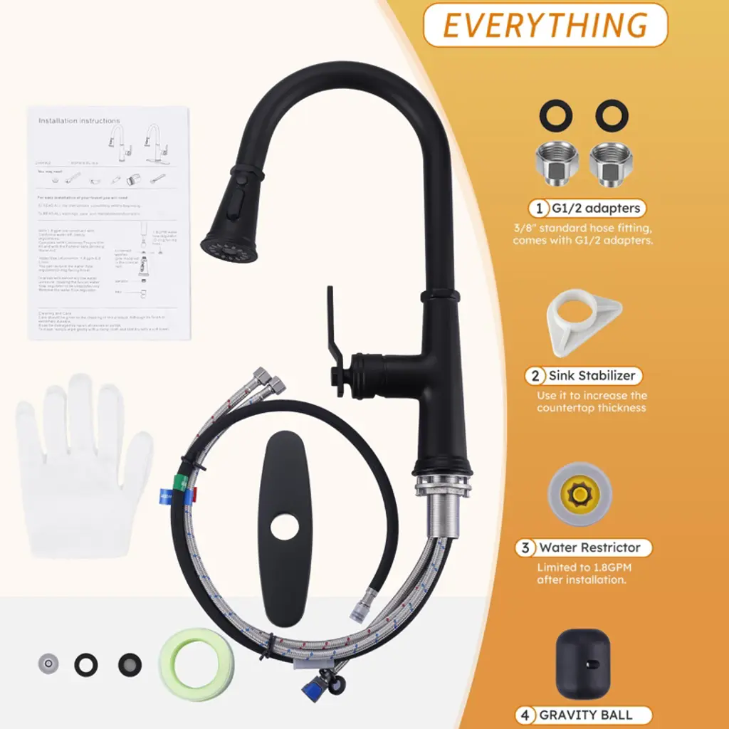 The flexible pull-down, water-saving and efficient, puts kitchen water at your fingertips This faucet is uniquely designed with a pull-down that extends up to 18 in. for easy cleaning of all corners of the sink. Equipped with a 3-mode sprayer with an efficient flow rate of up to 1.8 GPM.Made of 304 stainless steel, it is abrasion and scratch-resistant, with a modern look to add color to your kitchen. Drip-free ceramic cartridges are rigorously tested with precise single-handle control. Hot and cold adjustable, easy to install, complete accessories. Enjoy high-quality after-sales service and fast problem solving.