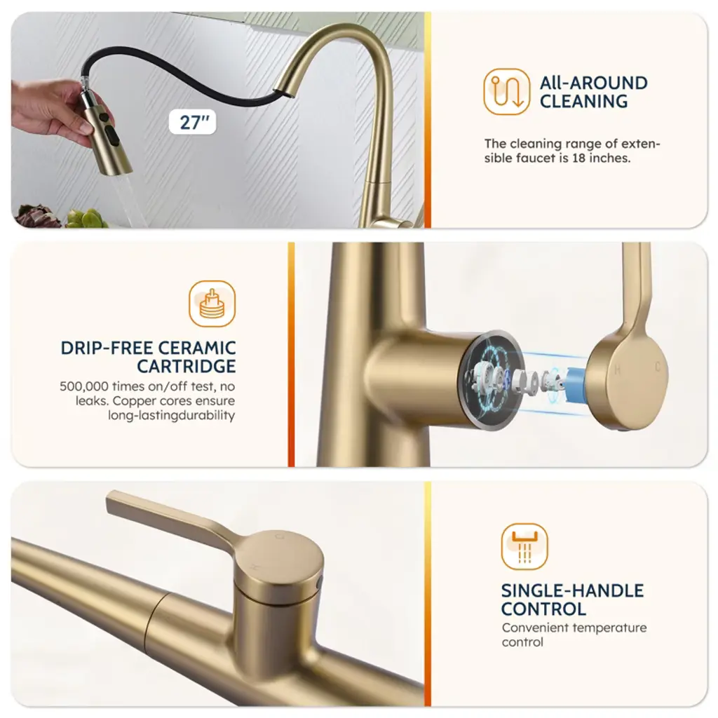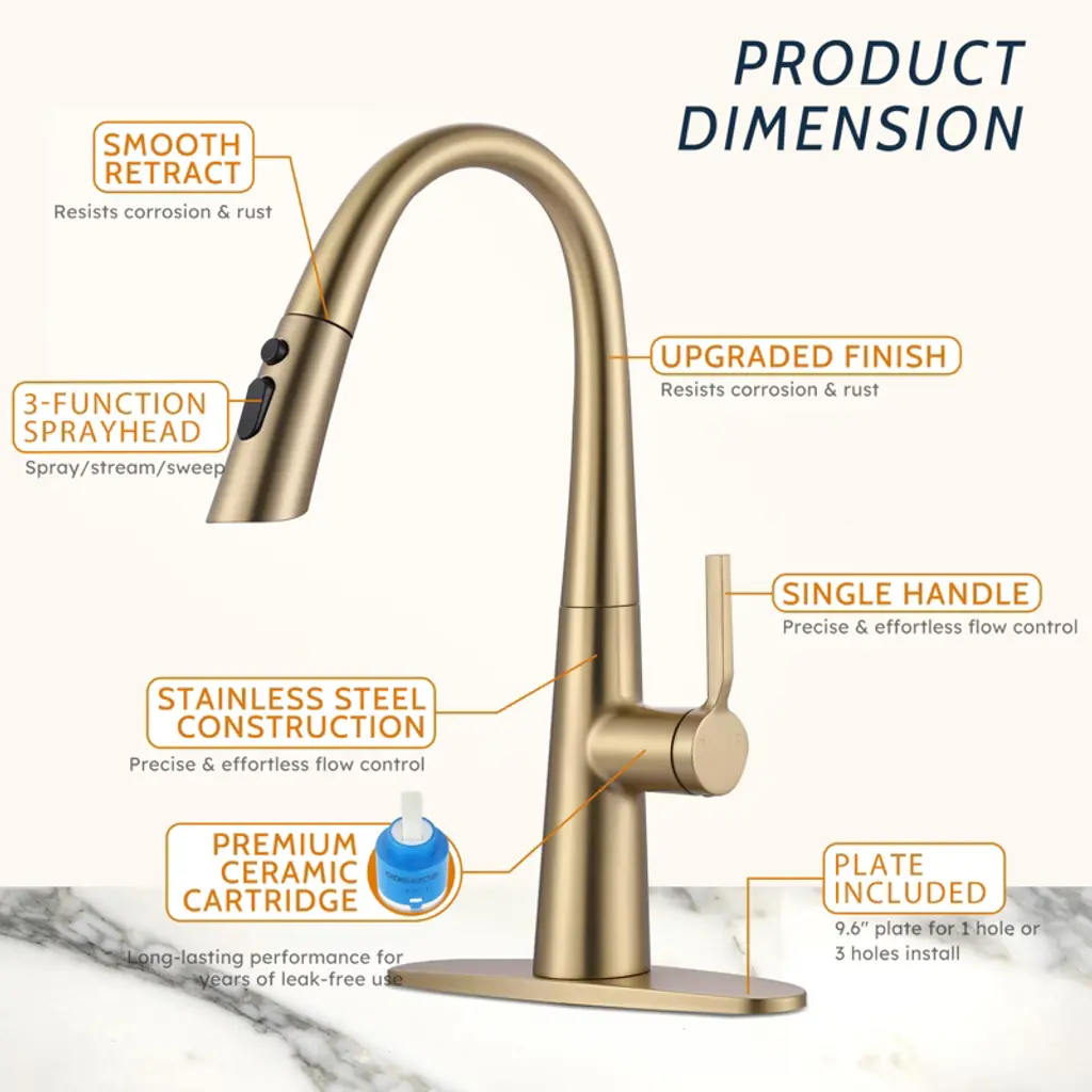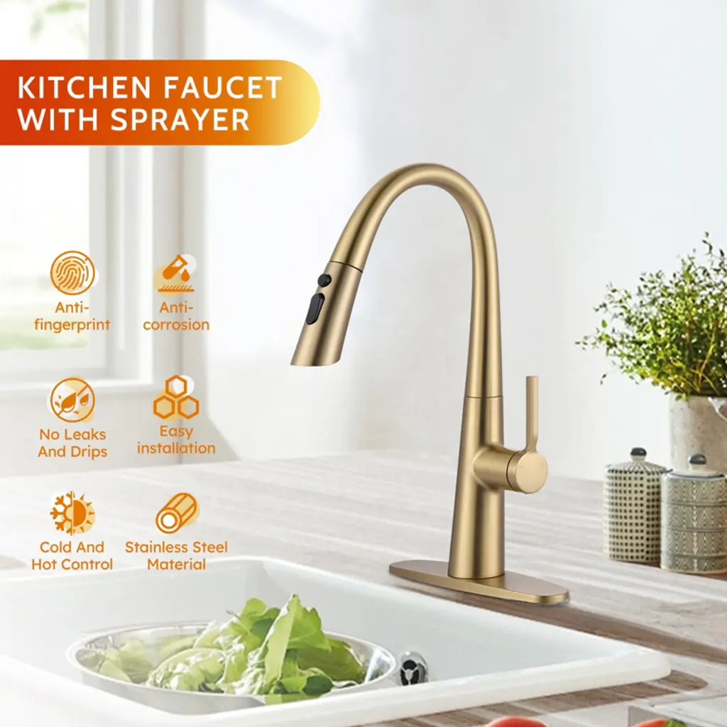 Single handle pull out faucet design integrate to control water temperature and flow volume easily,high arc 360 degree swivel spout supply full range washing access. The classic gravity ball design can automatically retract the sprayer, making the faucet easier to pull out and improving your cooking efficiency. 304 stainless steel assures the faucet is strong and puts your health first. The style is highly modern and elegant and works with any decorating style for your kitchen.