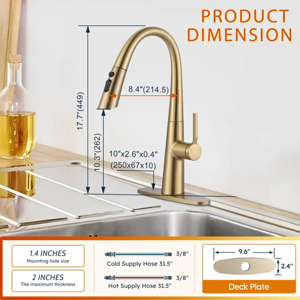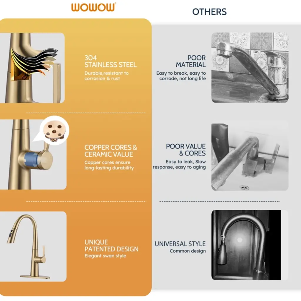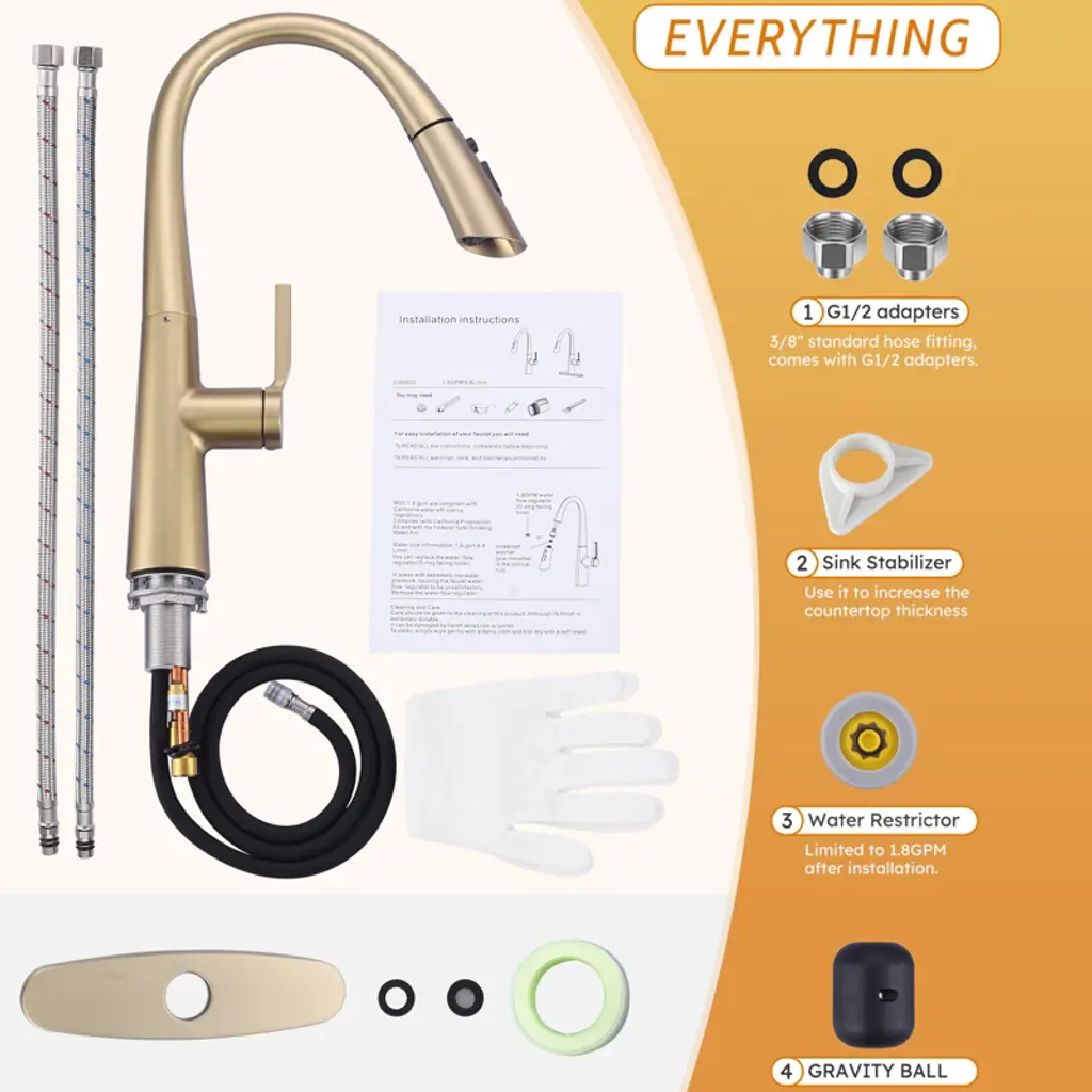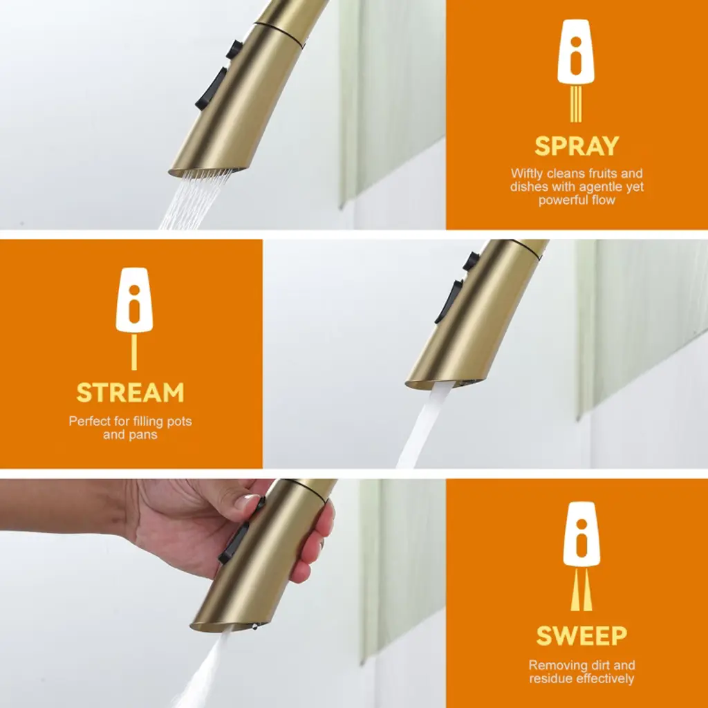Single handle pull out faucet design integrate to control water temperature and flow volume easily,high arc 360 degree swivel spout supply full range washing access. The classic gravity ball design can automatically retract the sprayer, making the faucet easier to pull out and improving your cooking efficiency. 304 stainless steel assures the faucet is strong and puts your health first. The style is highly modern and elegant and works with any decorating style for your kitchen.