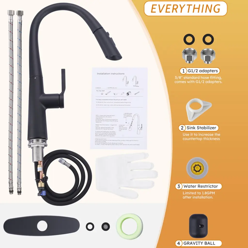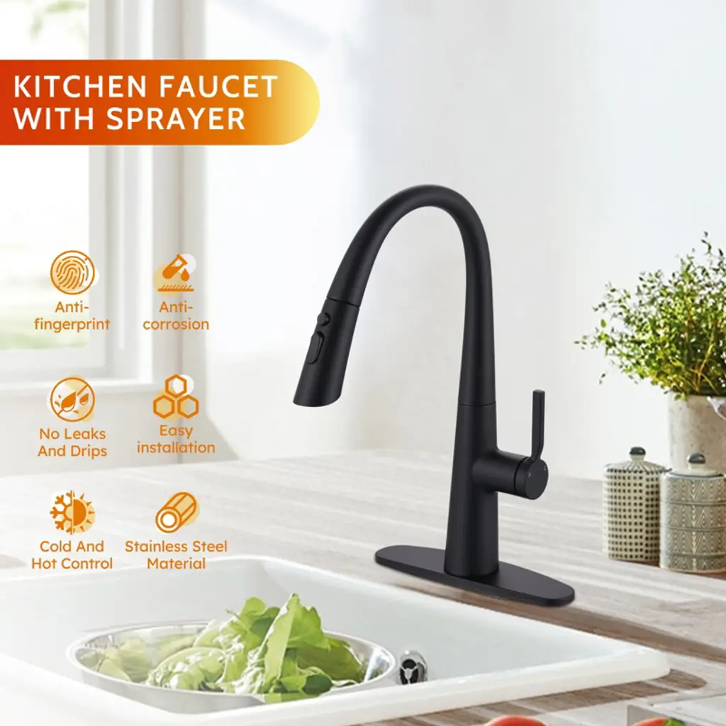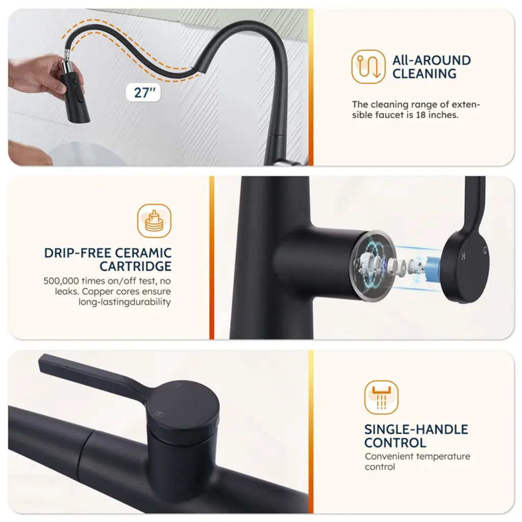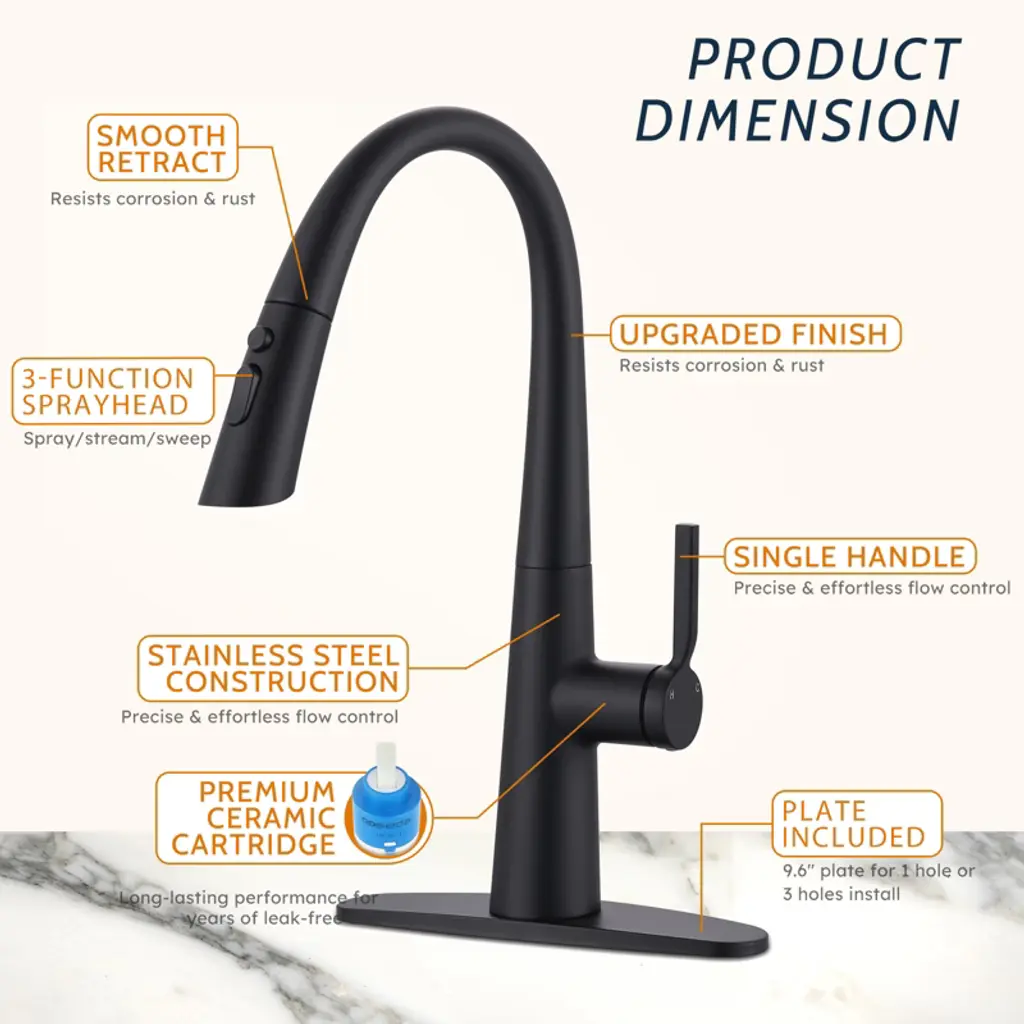 Single handle pull out faucet design integrate to control water temperature and flow volume easily,high arc 360 degree swivel spout supply full range washing access. The classic gravity ball design can automatically retract the sprayer, making the faucet easier to pull out and improving your cooking efficiency. 304 stainless steel assures the faucet is strong and puts your health first. The style is highly modern and elegant and works with any decorating style for your kitchen.