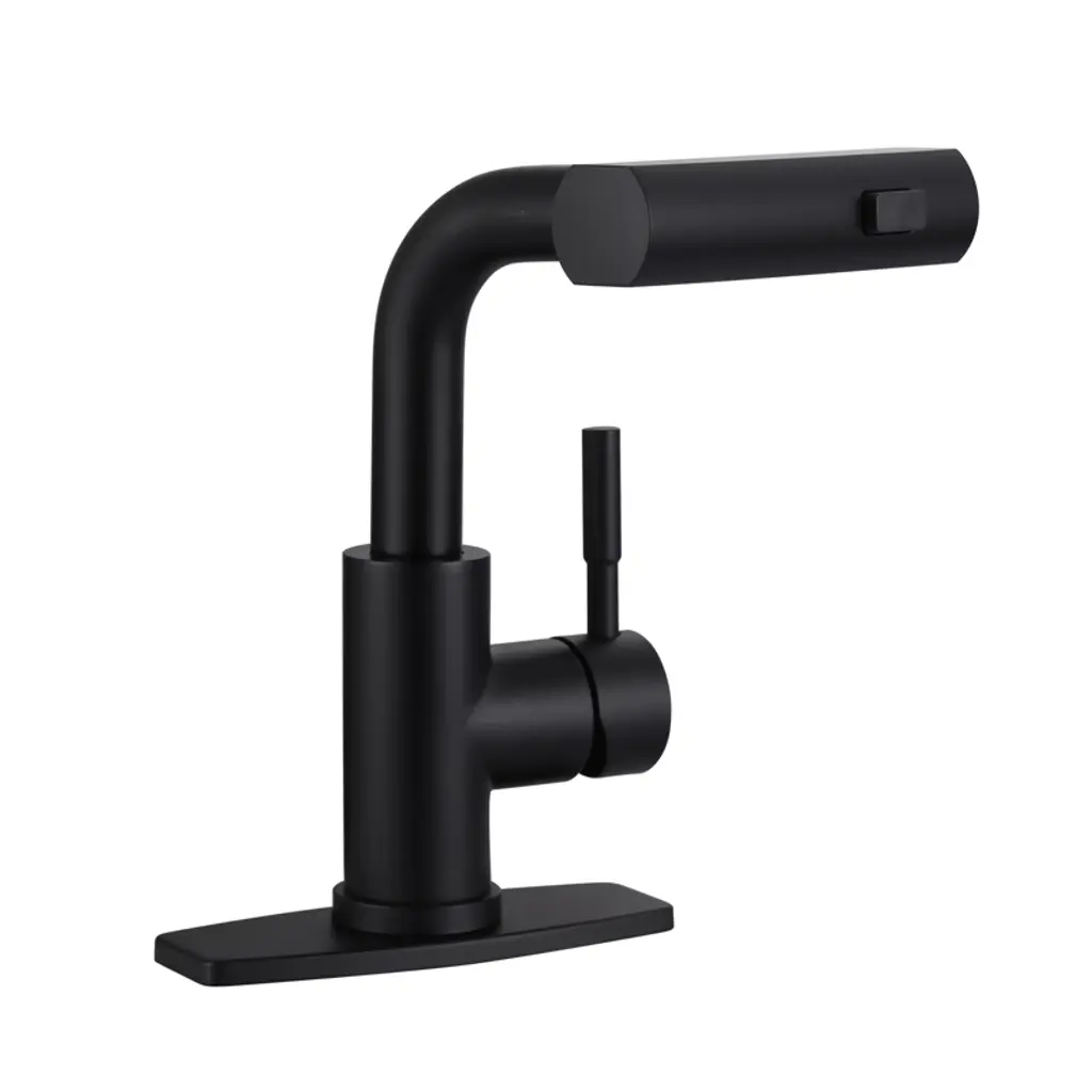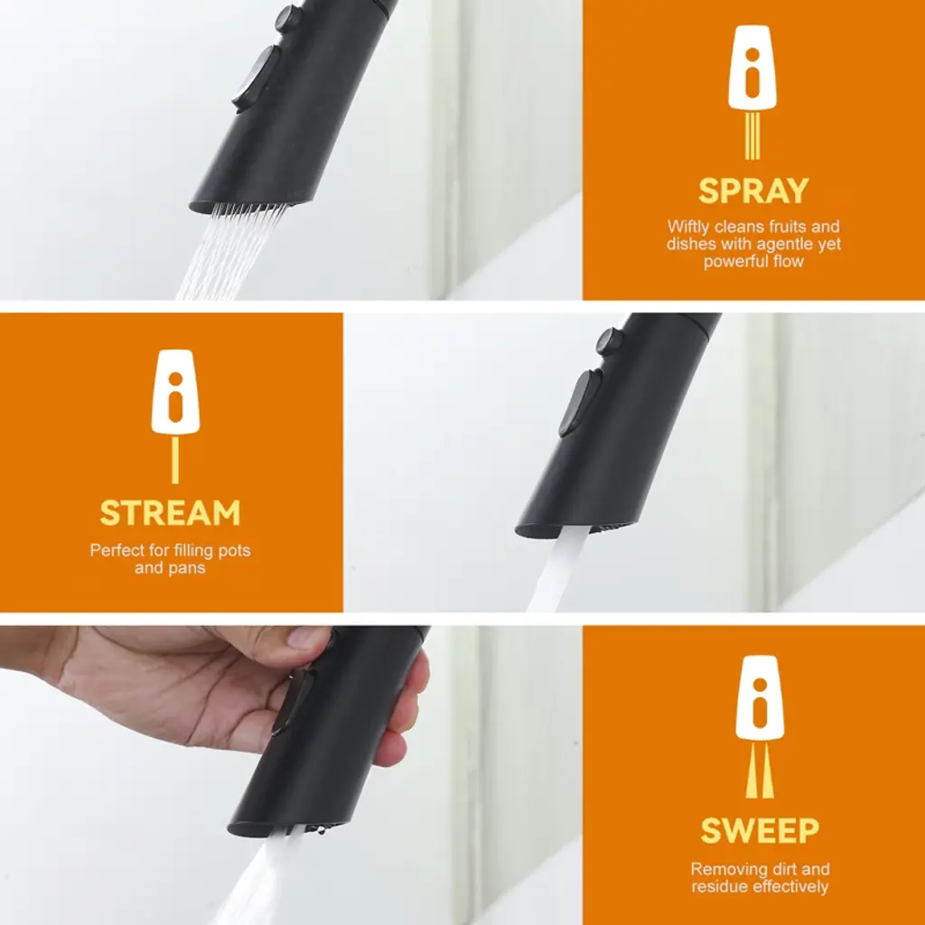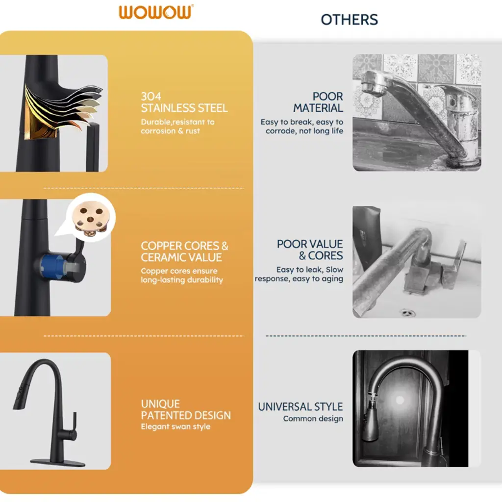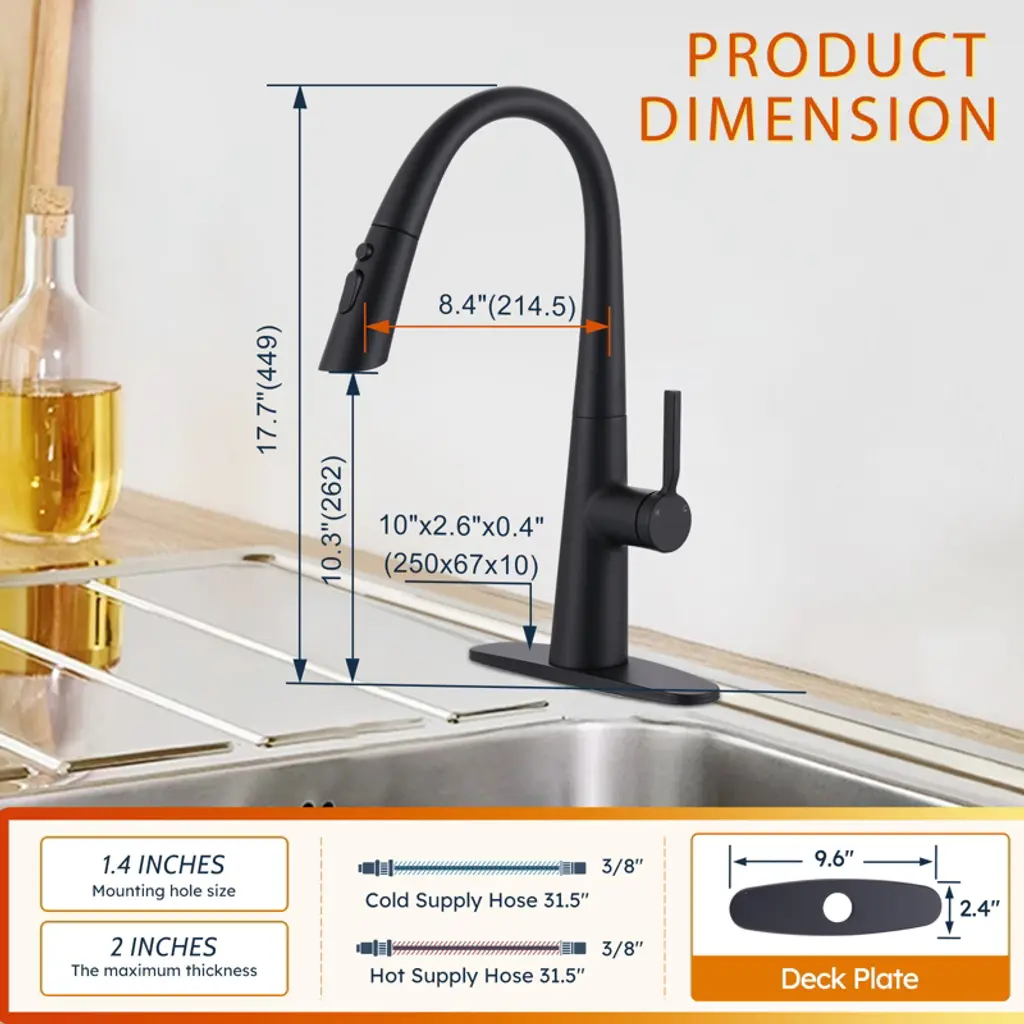 Single handle pull out faucet design integrate to control water temperature and flow volume easily,high arc 360 degree swivel spout supply full range washing access. The classic gravity ball design can automatically retract the sprayer, making the faucet easier to pull out and improving your cooking efficiency. 304 stainless steel assures the faucet is strong and puts your health first. The style is highly modern and elegant and works with any decorating style for your kitchen.