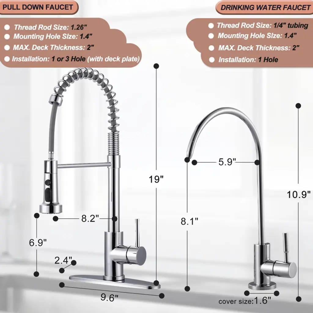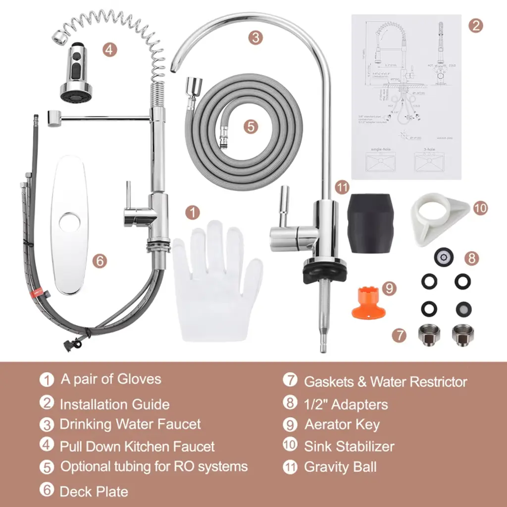 WOWOW delivers the ultimate kitchen upgrade with this dual-function faucet combo. Crafted from SUS 304 stainless steel, the pull-down kitchen faucet features 3 spray modes — Sweep, Stream, and Spray — to handle everything from rinsing produce to blasting away stuck-on messes. The dedicated drinking water faucet connects to RO systems and ensures clean, lead-free water at your fingertips. Comes with multiple adapters for easy DIY installation on both 1-hole and 3-hole sinks.