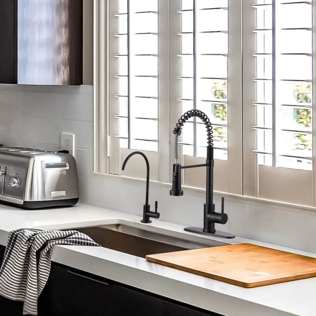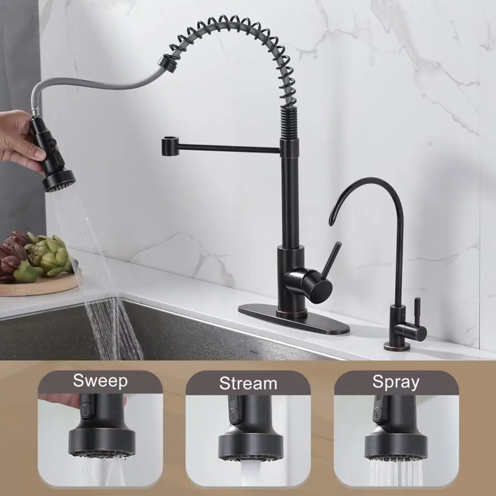 WOWOW delivers the ultimate kitchen upgrade with this dual-function faucet combo. Crafted from SUS 304 stainless steel, the pull-down kitchen faucet features 3 spray modes — Sweep, Stream, and Spray — to handle everything from rinsing produce to blasting away stuck-on messes. The dedicated drinking water faucet connects to RO systems and ensures clean, lead-free water at your fingertips. Comes with multiple adapters for easy DIY installation on both 1-hole and 3-hole sinks.