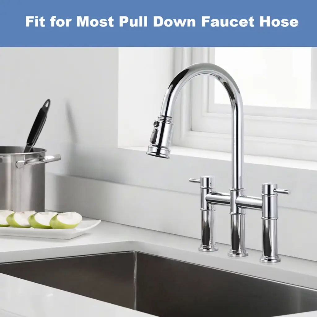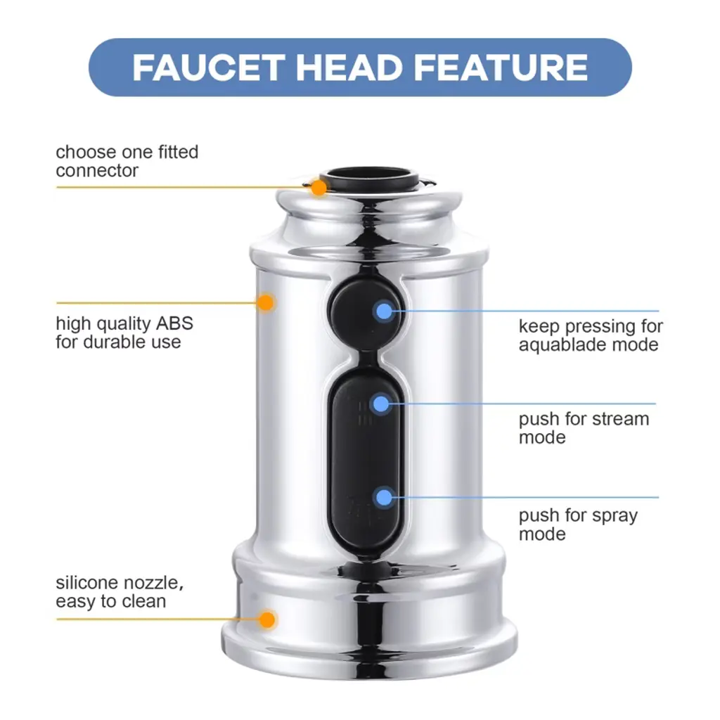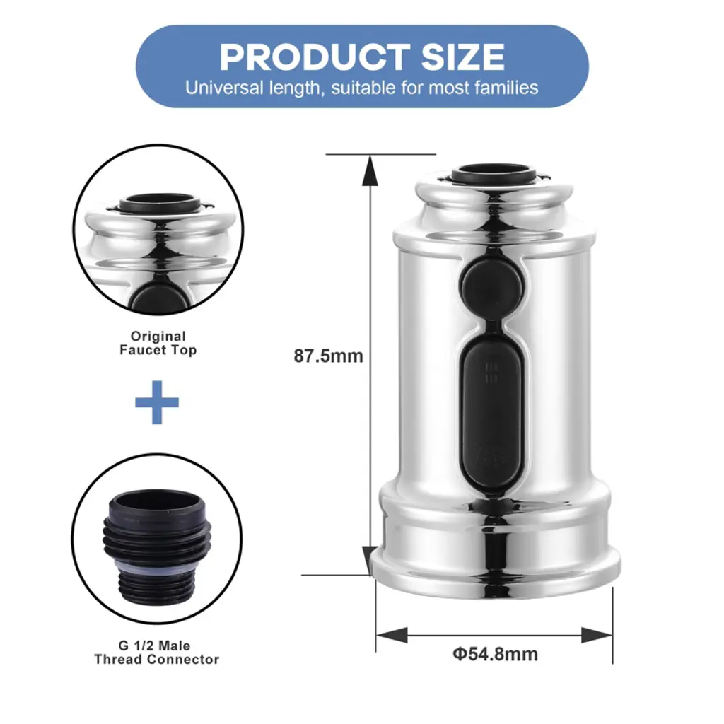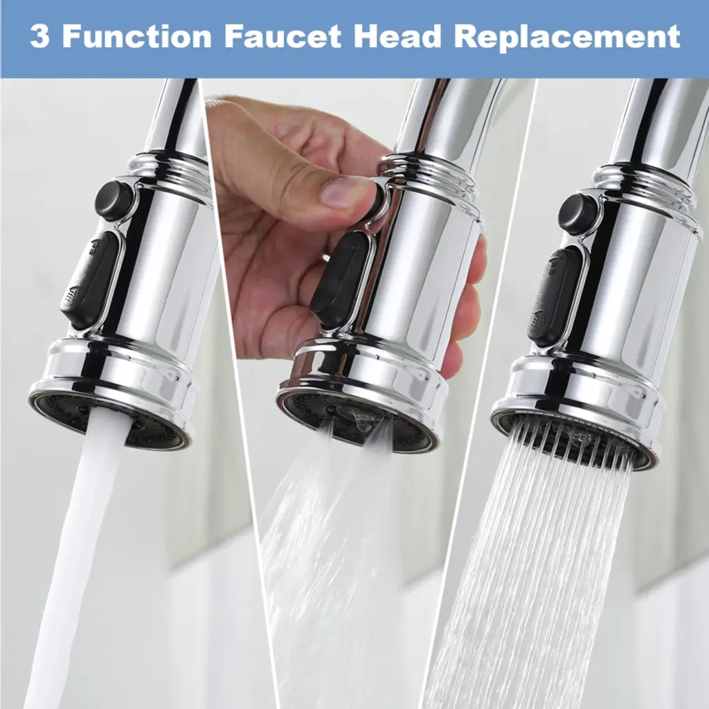 This pull-down faucet spray head replacement, which combines rain stream, spray and dual blade spray, is designed for those seeking a comfortable showering experience. Made of high-quality ABS material to ensure durability and stability. Its streamlined appearance is both beautiful and practical, easy to clean and maintain. 3-water modes can be switched at the touch of a button to meet various water needs.