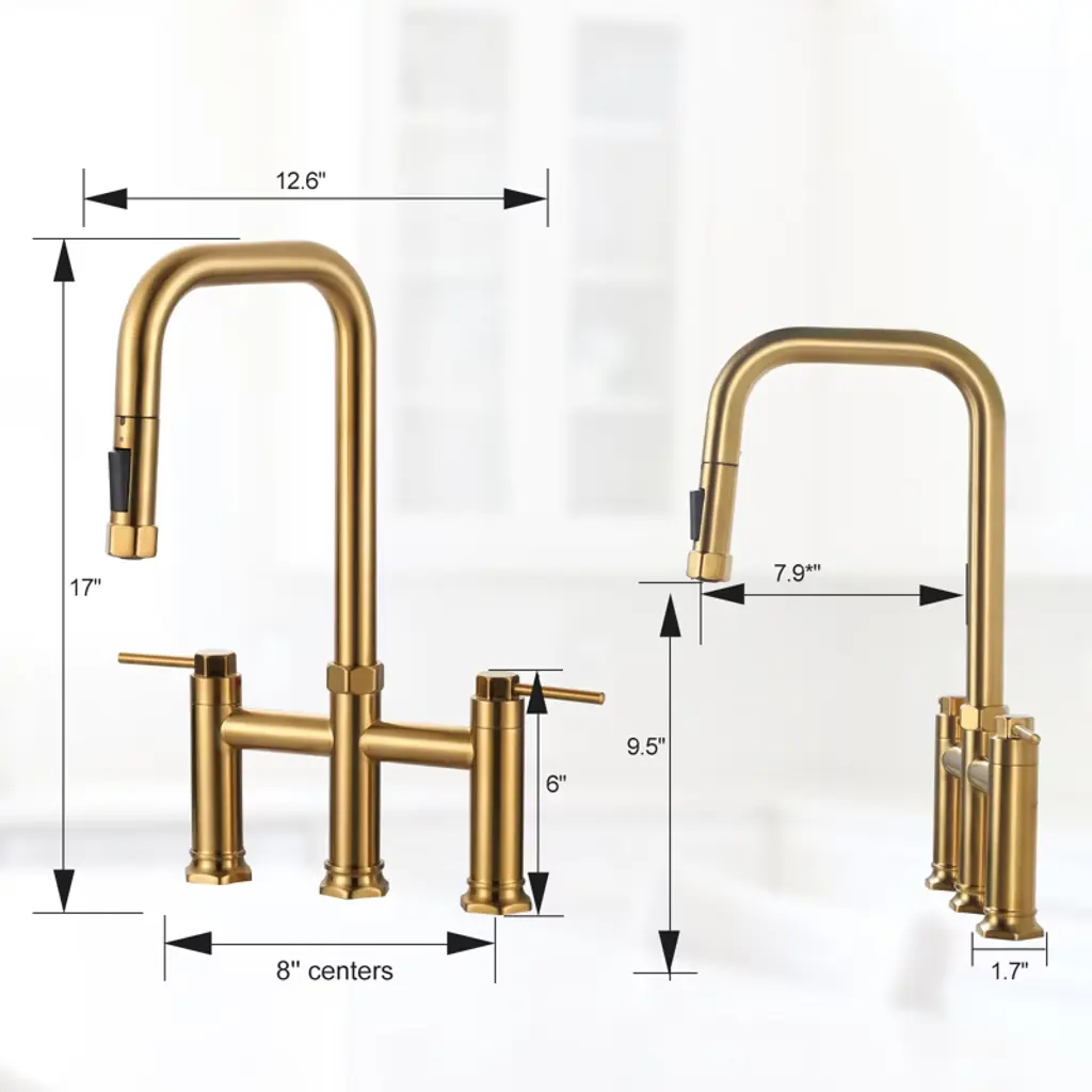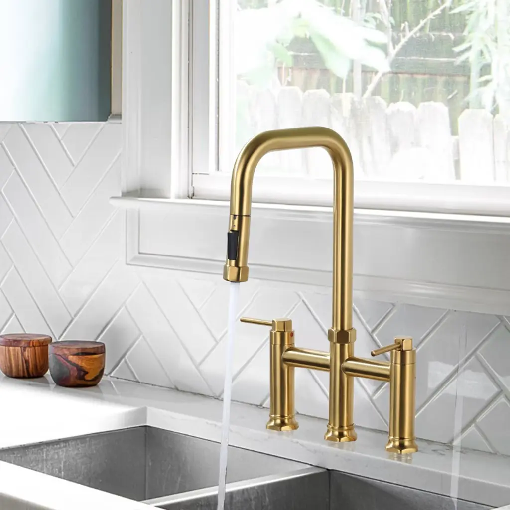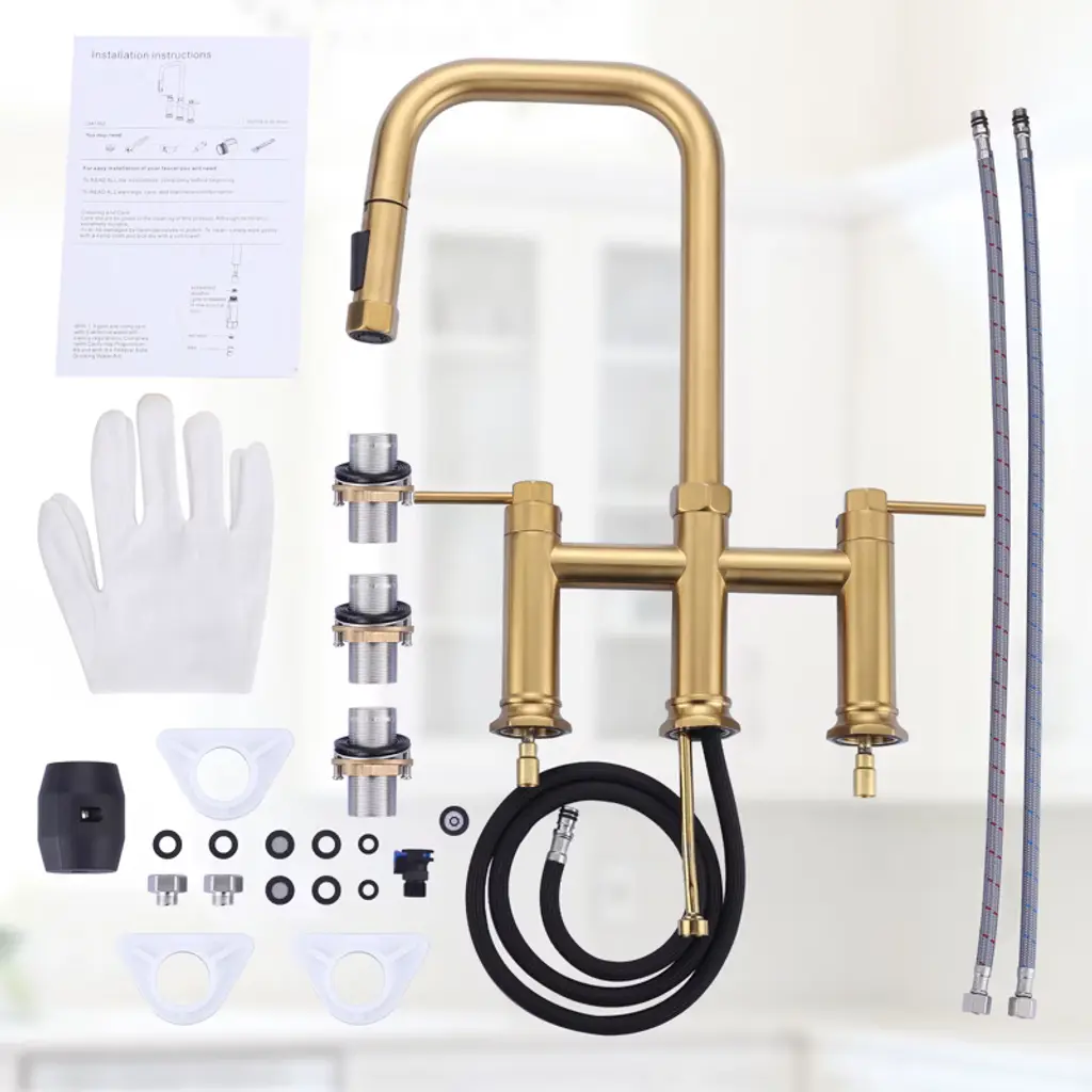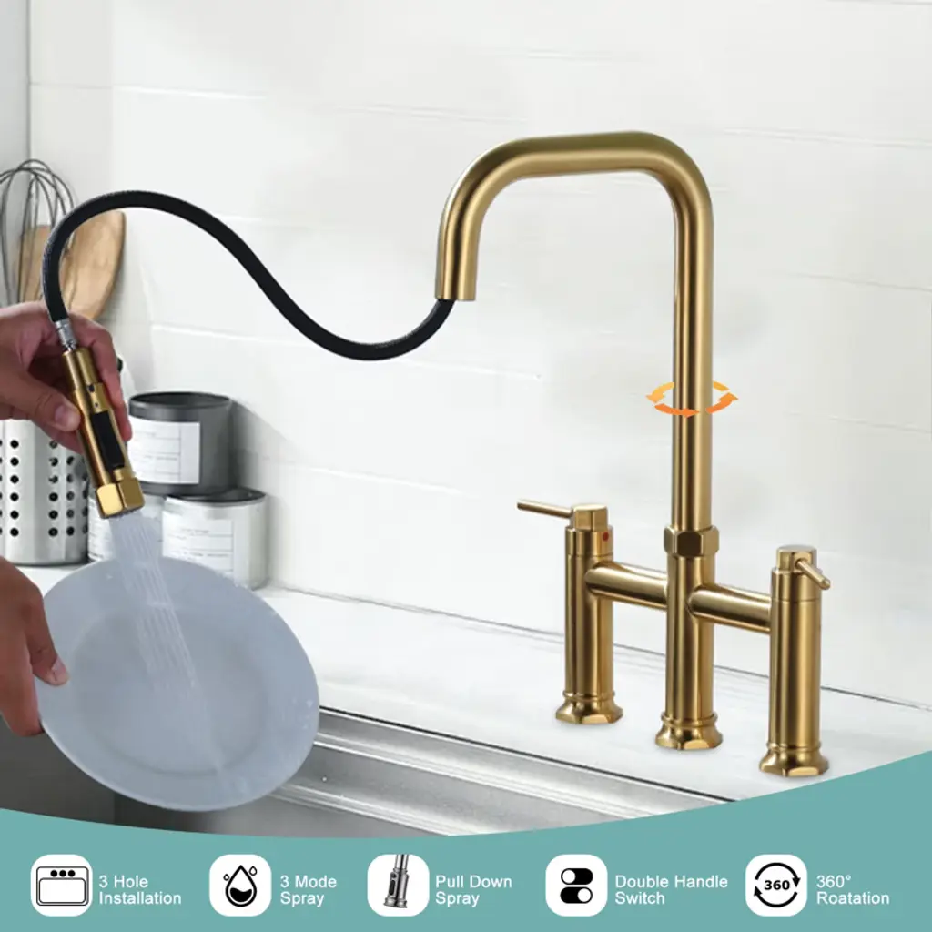 Wowow 3 Holes Double Handle Bridge Kitchen Faucet With Pull Down Sprayer And Supply Lines In Gold