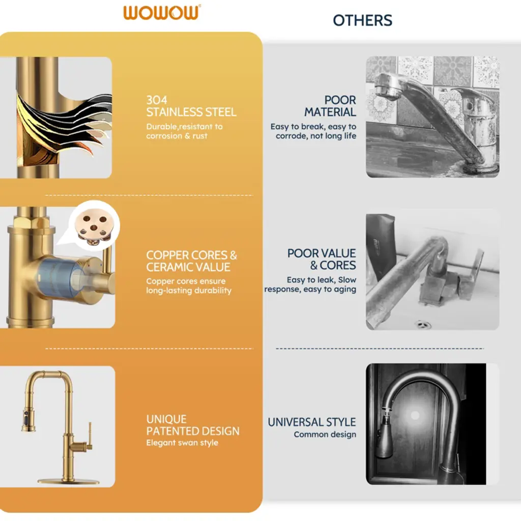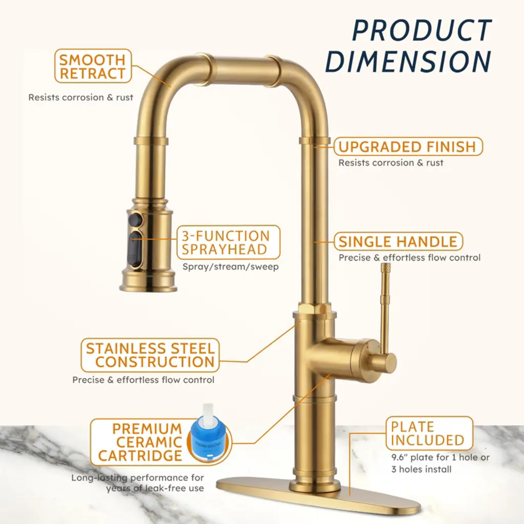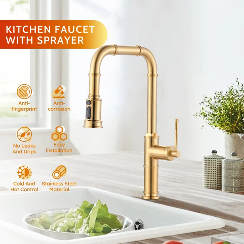 Wowow 3-mode Pull Down Spray Kitchen Faucet In Gold