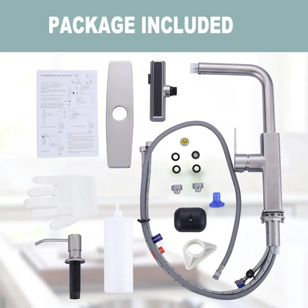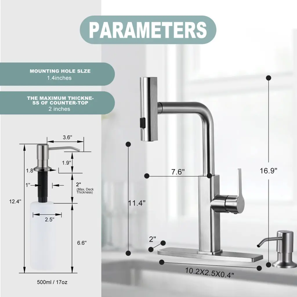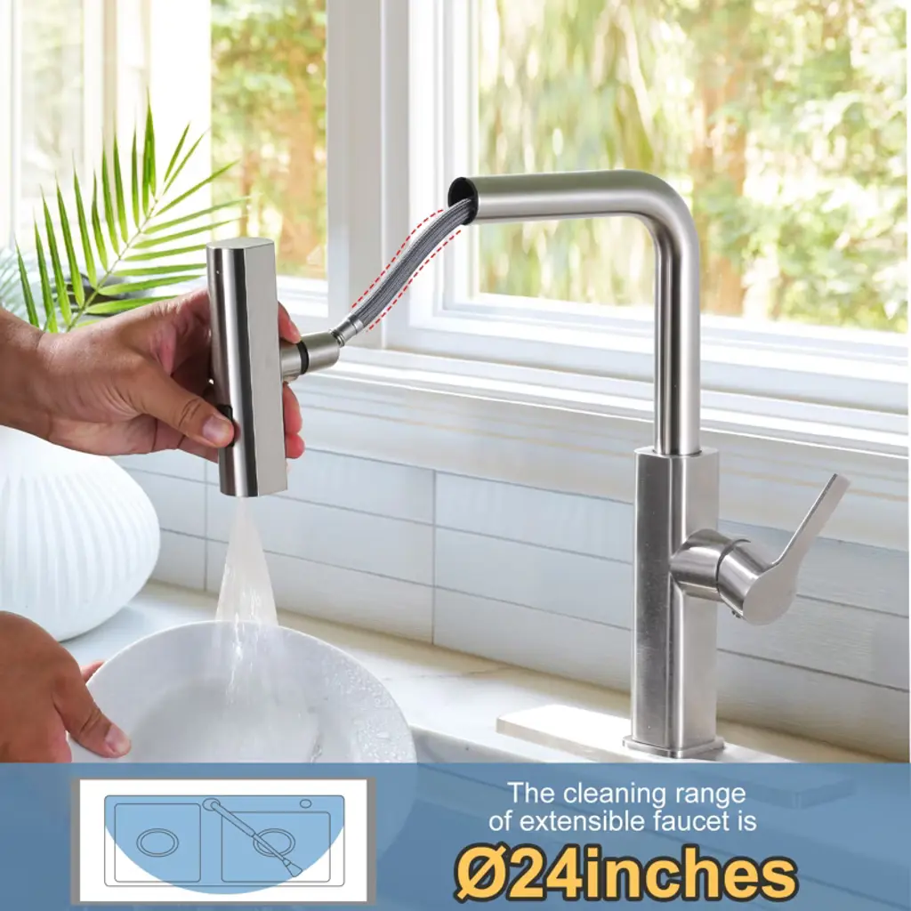 This pull-out kitchen faucet meter not only enhances the beauty of your kitchen, but also enables efficient cleaning. You can freely choose from three water dispensing modes: stream, spray and sweep to meet different needs. Made of SUS 304 stainless steel, corrosion and rust resistant. The ceramic valve has been tested for durability with over 500,000 on/off cycles.The 90° swivel handle allows for easy control of water temperature and flow rate, providing flexibility and convenience.The 18 in. extension hose covers a 27 in. cleaning area for a hassle-free kitchen experience.