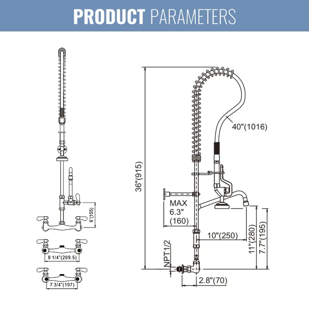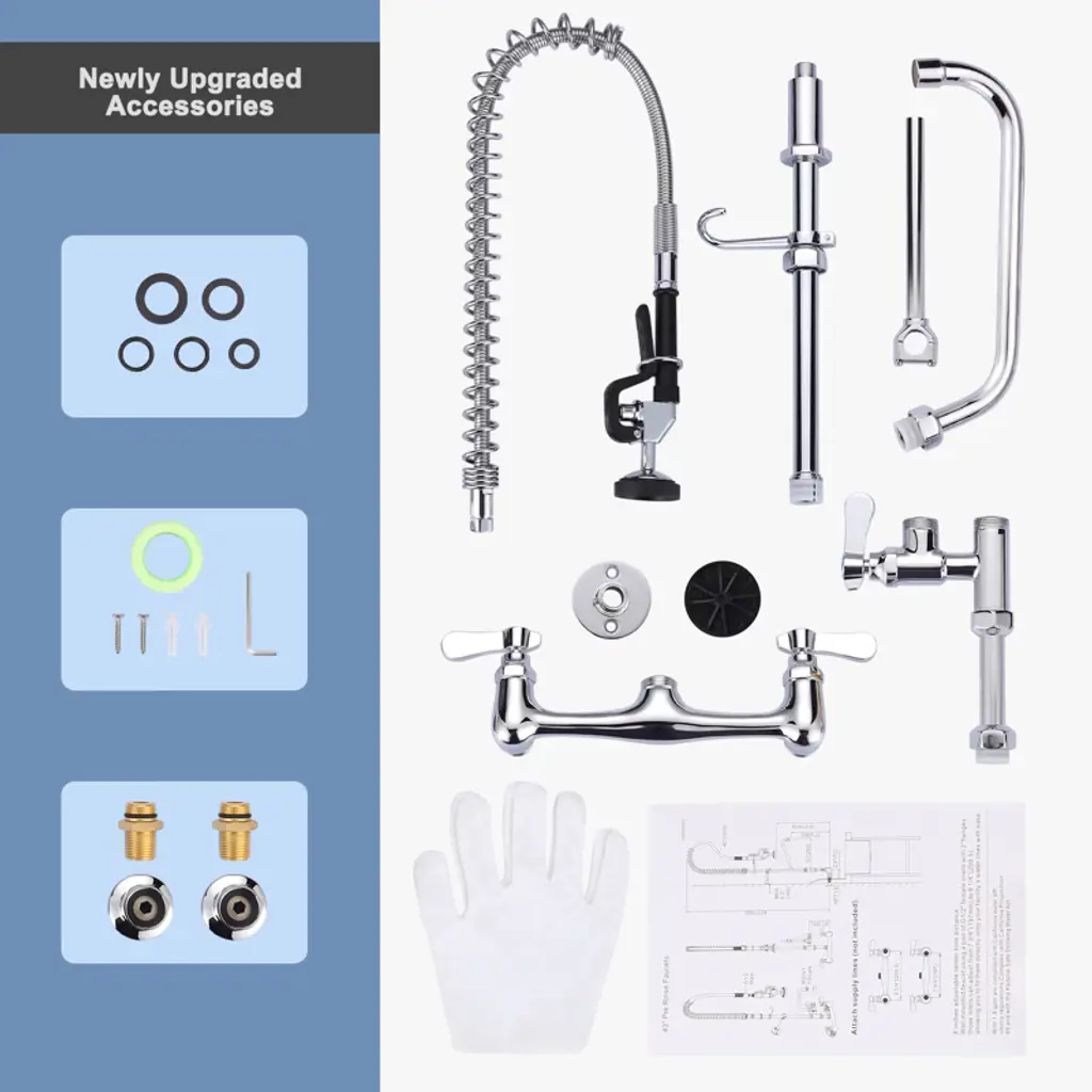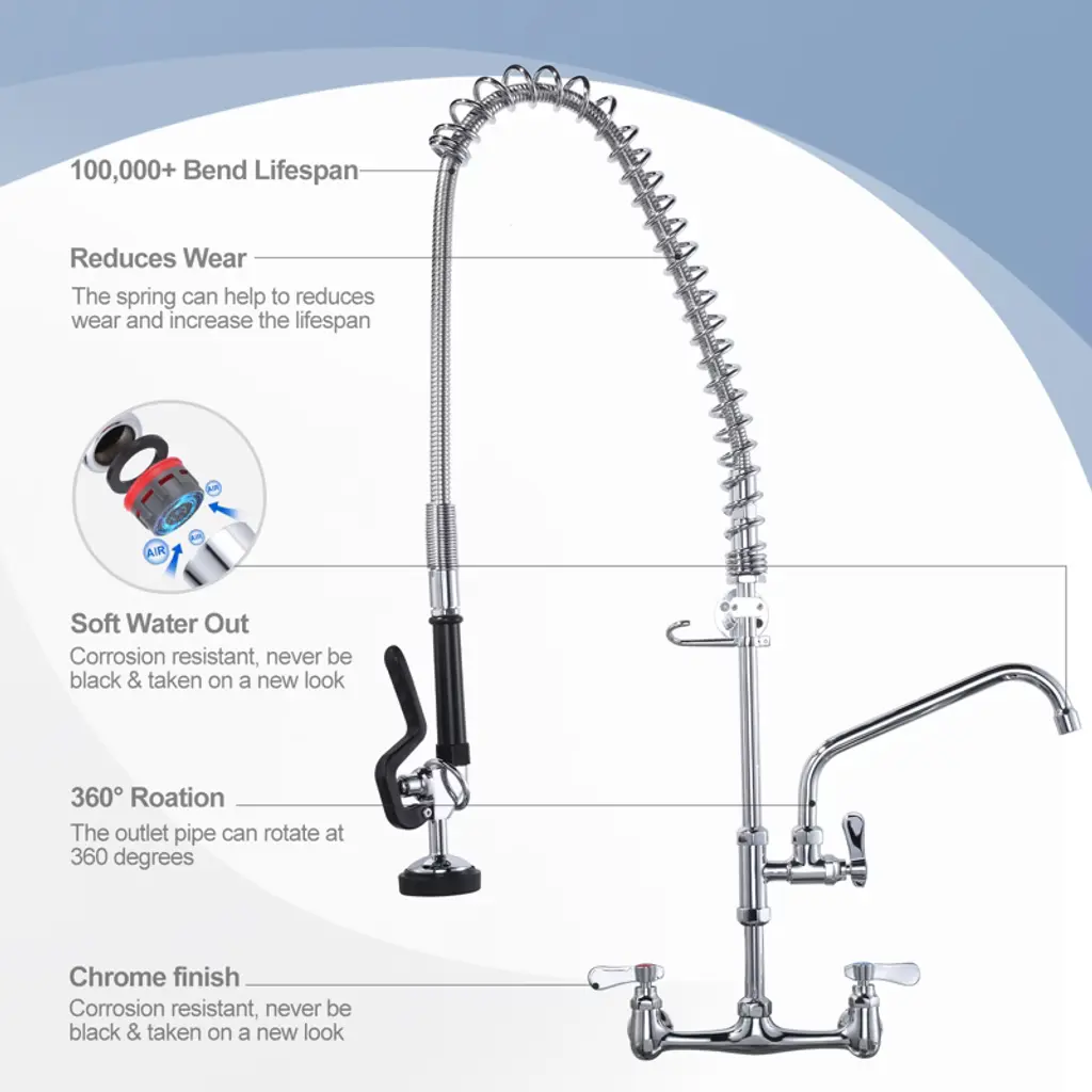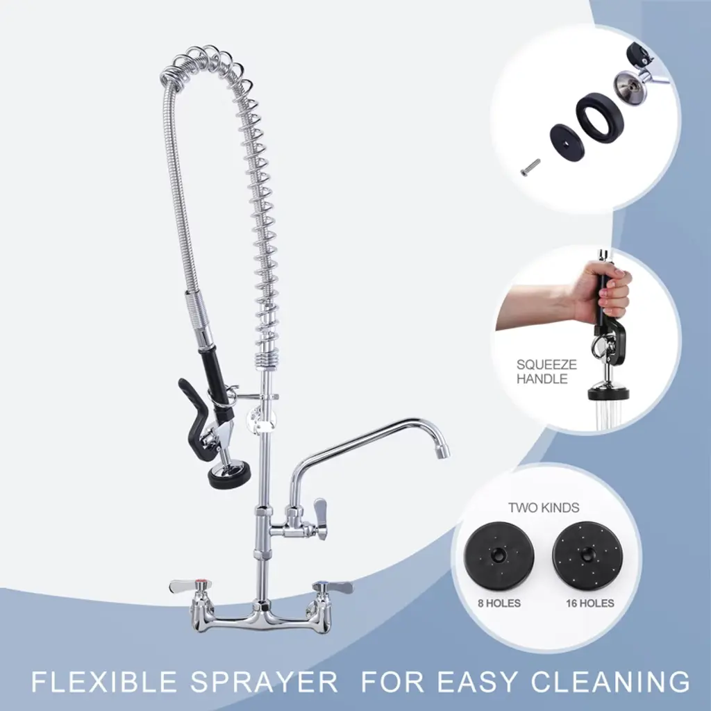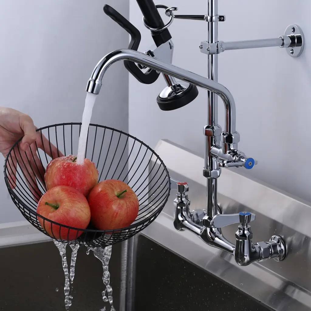 This wall - mount kitchen faucet with triple handle and pre-rinse sprayer is an essential and highly practical addition for commercial kitchens. Designed for durability, its solid brass construction ensures reliable performance even in the busiest culinary environments. With triple handles, it offers precise control over temperature and flow, while the pre-rinse sprayer is ideal for diverse tasks, from washing delicate dishes to scrubbing large cooking equipment. The pull-down sprayer can reach every corner of the sink. Wall-mounted installation maximizes counter space and simplifies cleaning routines.