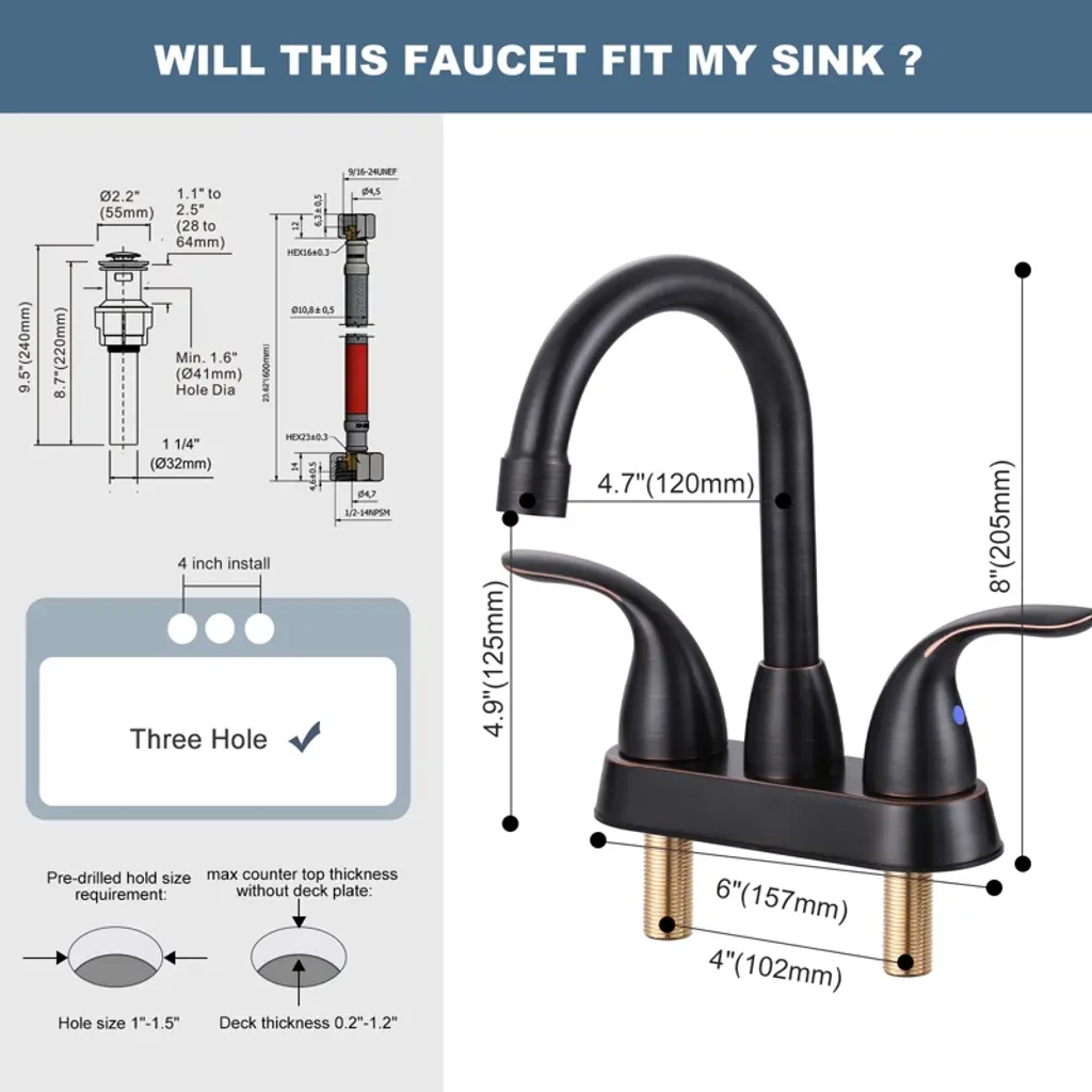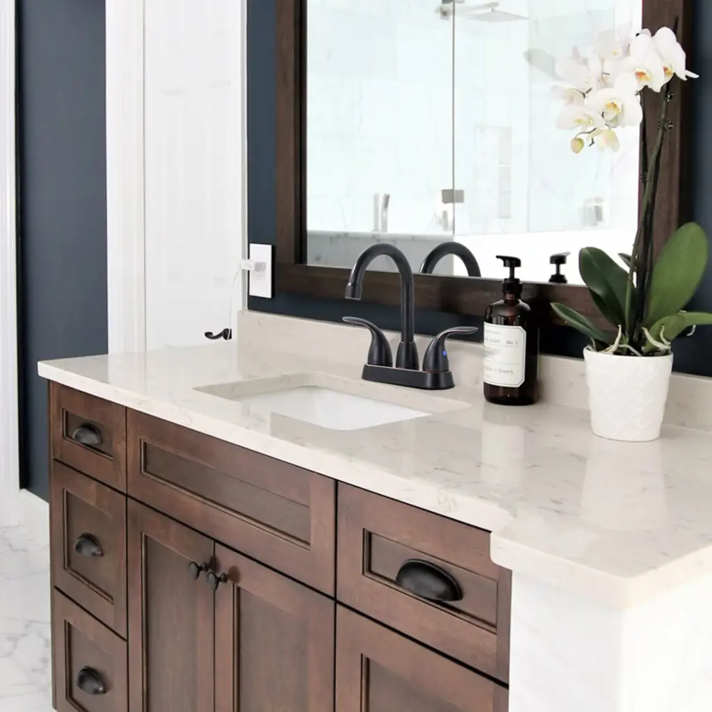 4-inch center-set double-handle high-arc bathroom faucet will refresh your bathroom. Its timeless design and durable construction make it a stylish and functional addition to any sink. The integrated design makes installation easier, and the included matching drain assembly ensures consistency in ambiance. The high-arc spout provides ample space for everyday use.