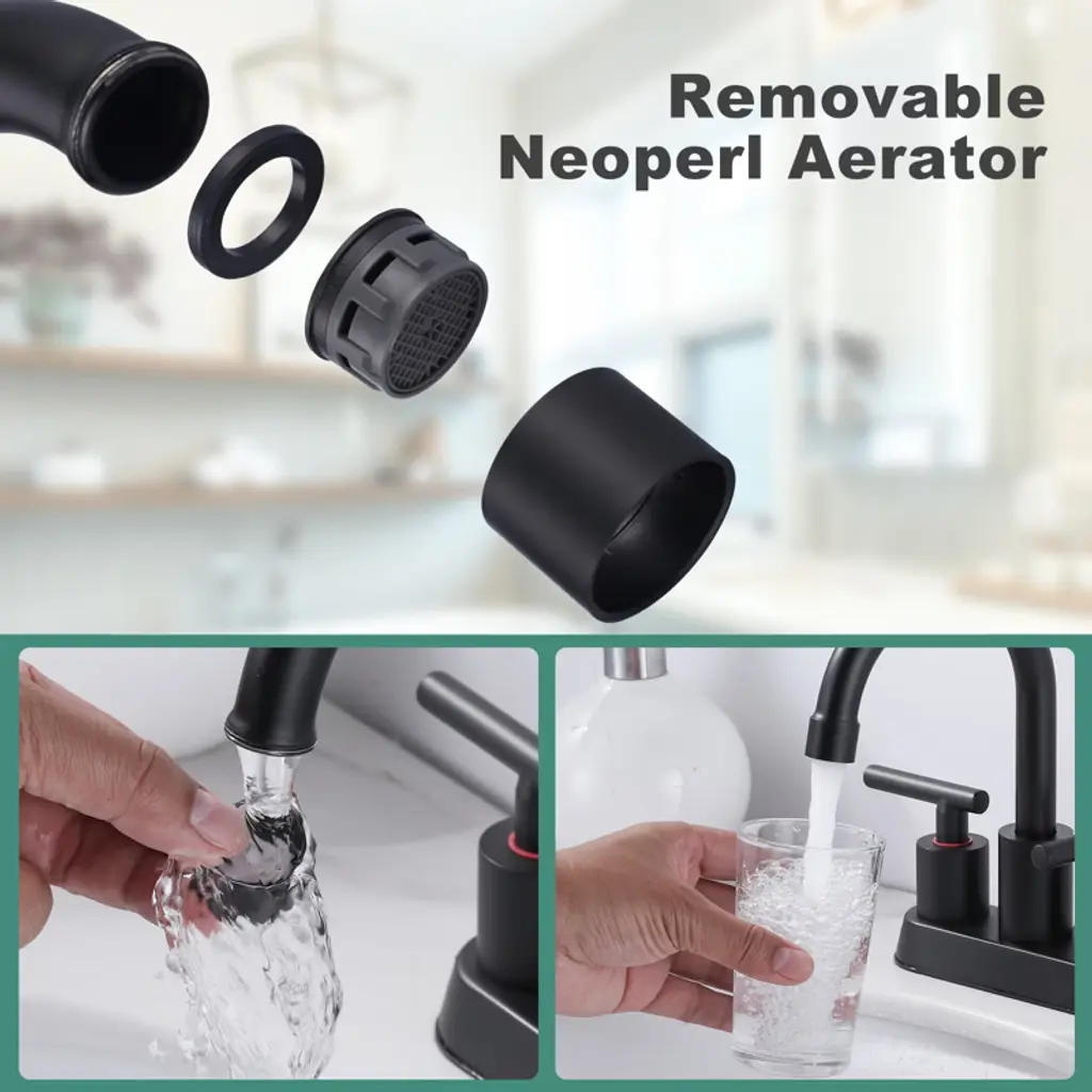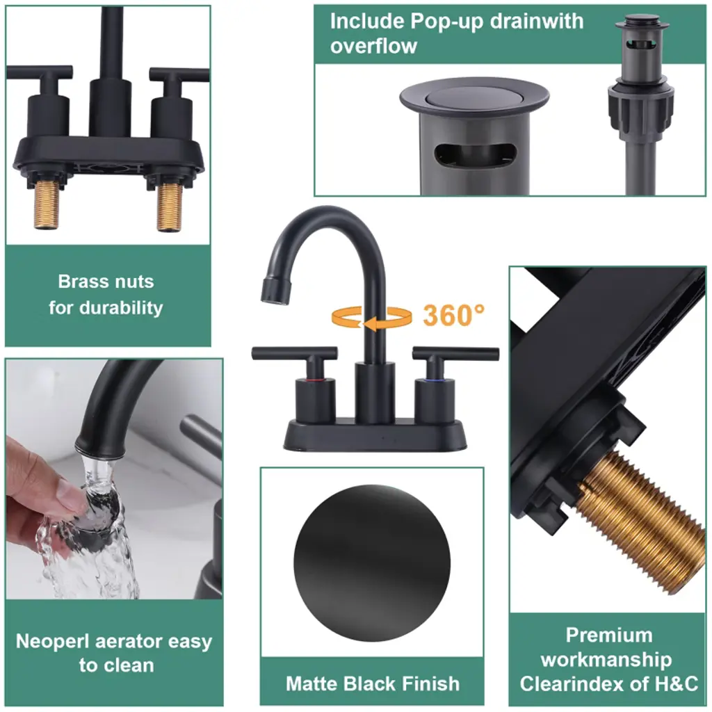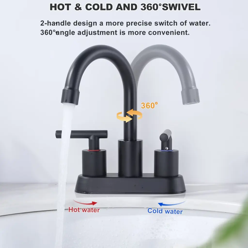 This centerset bathroom faucet is crafted from durable stainless steel and solid brass, ensuring long-term stability and corrosion resistance. Its high quality aerator guarantees a gentle water flow, saving water while maintaining comfort. The 360° swivel design facilitates effortless cleaning, reaching every angle with ease. The dual-handle feature provides convenience, allowing precise control over water flow and temperature. Additionally, we provide comprehensive installation instructions suitable for all skill levels, ensuring a smooth and straightforward installation process for both DIY enthusiasts and novices alike.