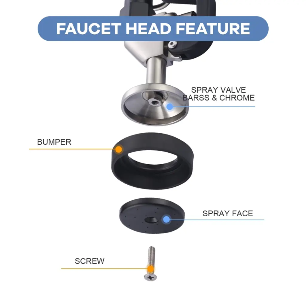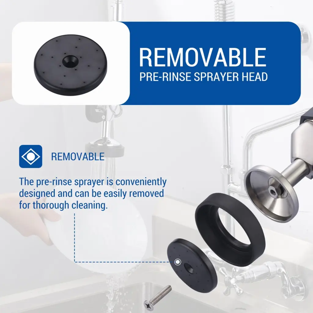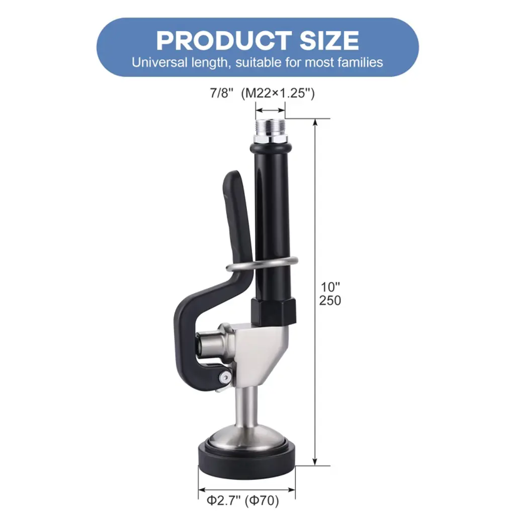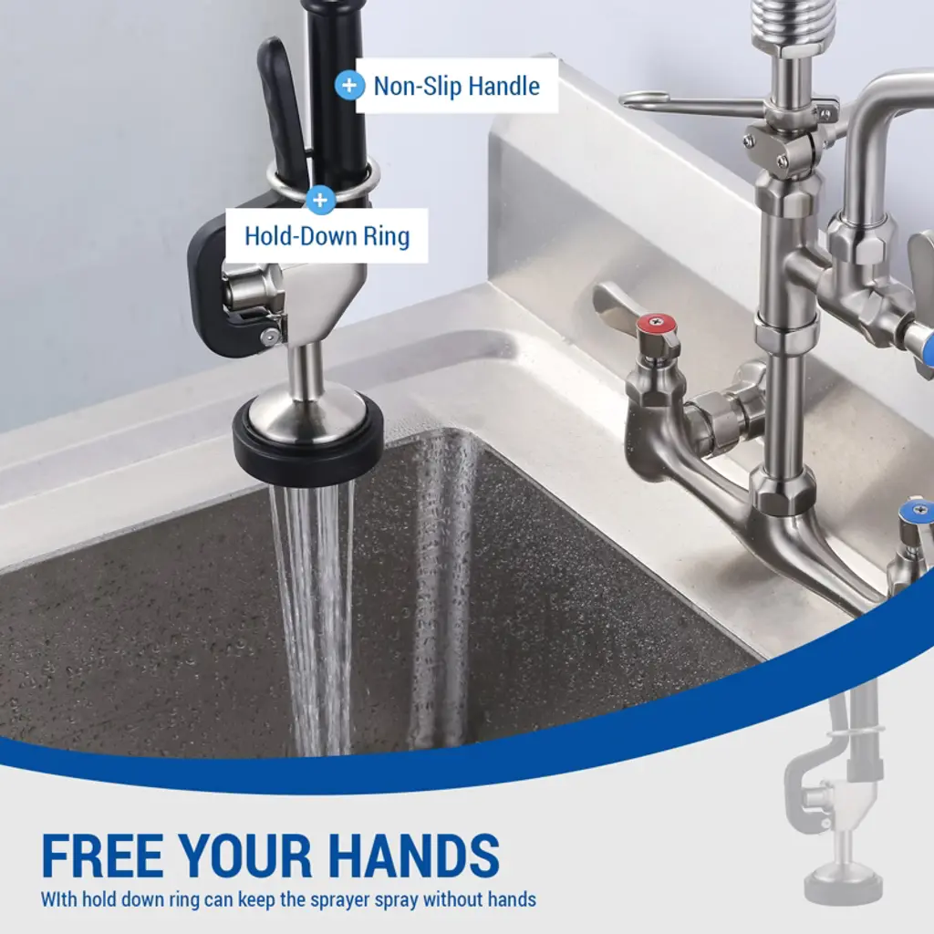 This Pre-Rinse Sprayer is made of high-quality brass in classic brushed and black colors for a luxurious look and feel. Customized for the mainstream pre-rinse commercial faucets in the market, the 1-touch handle releases powerful high-pressure jets instantly and efficiently cleans the faucet without dead ends. Equipped with innovative hold down ring design, gently press the plastic lever handle, you can easily direct the water flow outside the main spout to realize convenient diversion, and at the same time, release your hands to enjoy a freer operating experience. Exquisite craftsmanship, durability and reliability, add a touch of color to your kitchen or bathroom.
