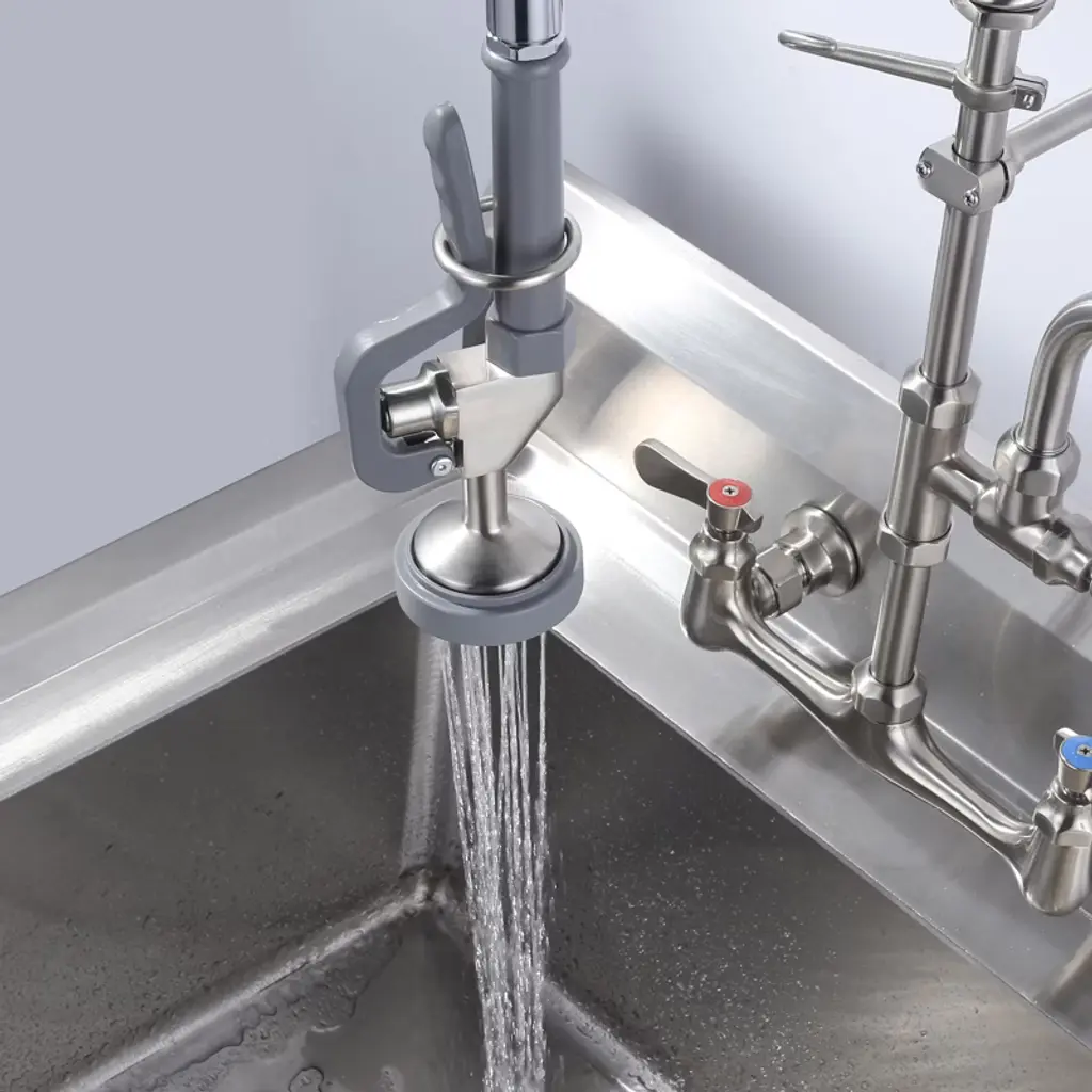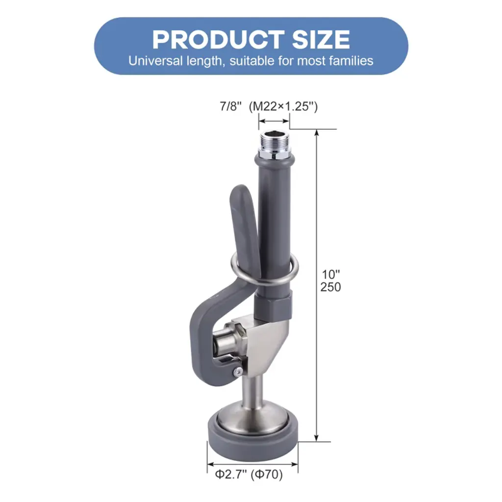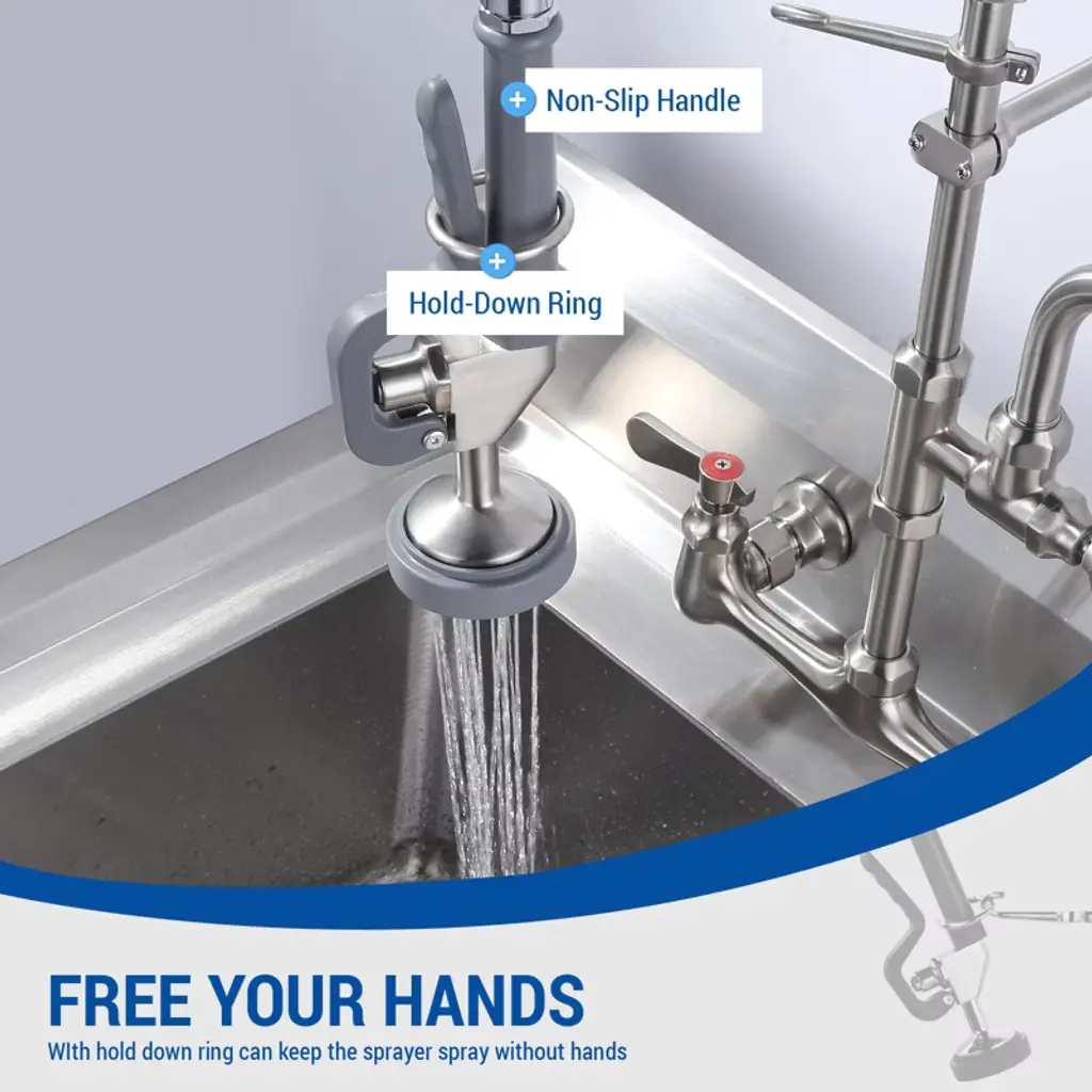 This Pre-Rinse Sprayer is made of high-quality brass in classic brushed and black colors for a luxurious look and feel. Customized for the mainstream pre-rinse commercial faucets in the market, the 1-touch handle releases powerful high-pressure jets instantly and efficiently cleans the faucet without dead ends. Equipped with innovative hold down ring design, gently press the plastic lever handle, you can easily direct the water flow outside the main spout to realize convenient diversion, and at the same time, release your hands to enjoy a freer operating experience. Exquisite craftsmanship, durability and reliability, add a touch of color to your kitchen or bathroom.