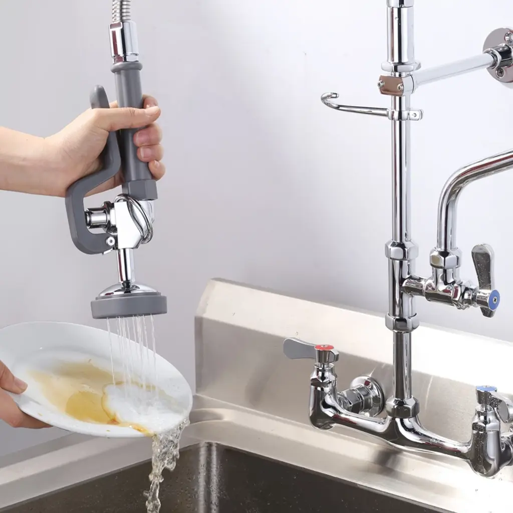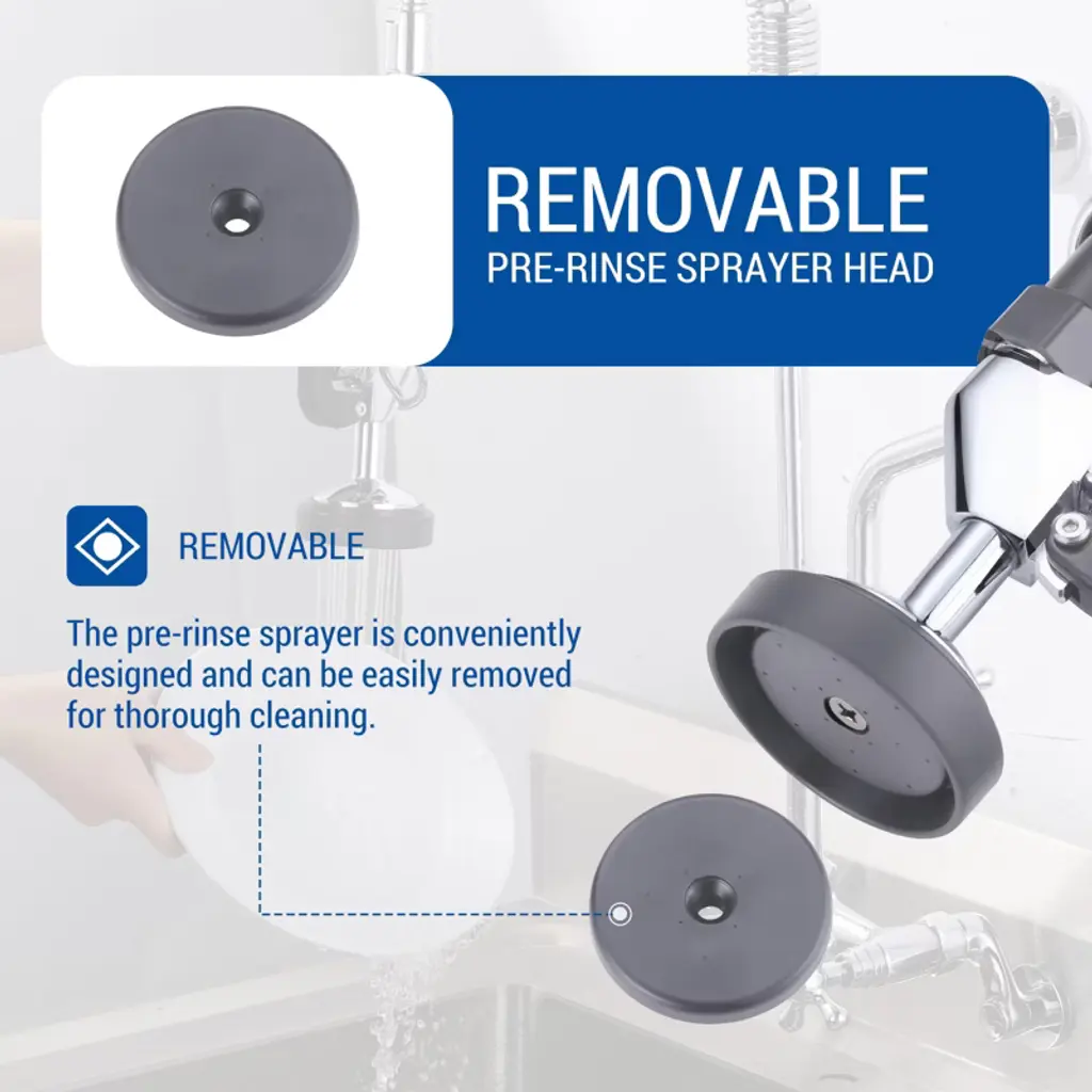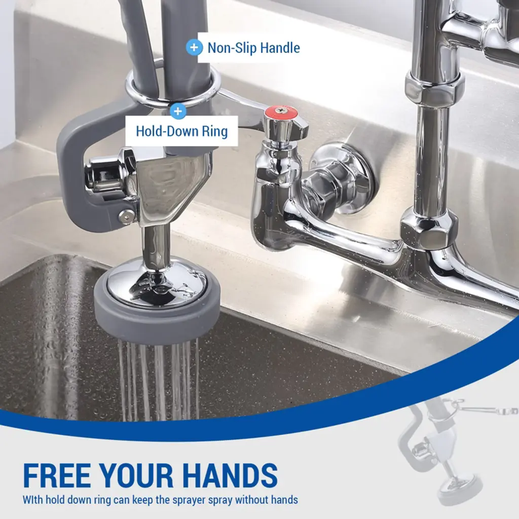 This Pre-Rinse Sprayer is made of high-quality brass in classic brushed and black colors for a luxurious look and feel. Customized for the mainstream pre-rinse commercial faucets in the market, the 1-touch handle releases powerful high-pressure jets instantly and efficiently cleans the faucet without dead ends. Equipped with innovative hold down ring design, gently press the plastic lever handle, you can easily direct the water flow outside the main spout to realize convenient diversion, and at the same time, release your hands to enjoy a freer operating experience. Exquisite craftsmanship, durability and reliability, add a touch of color to your kitchen or bathroom.