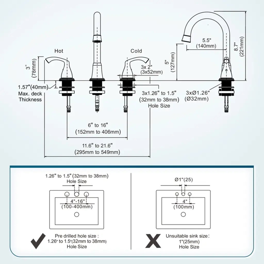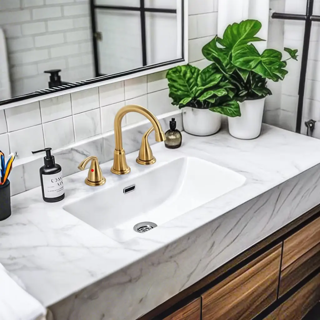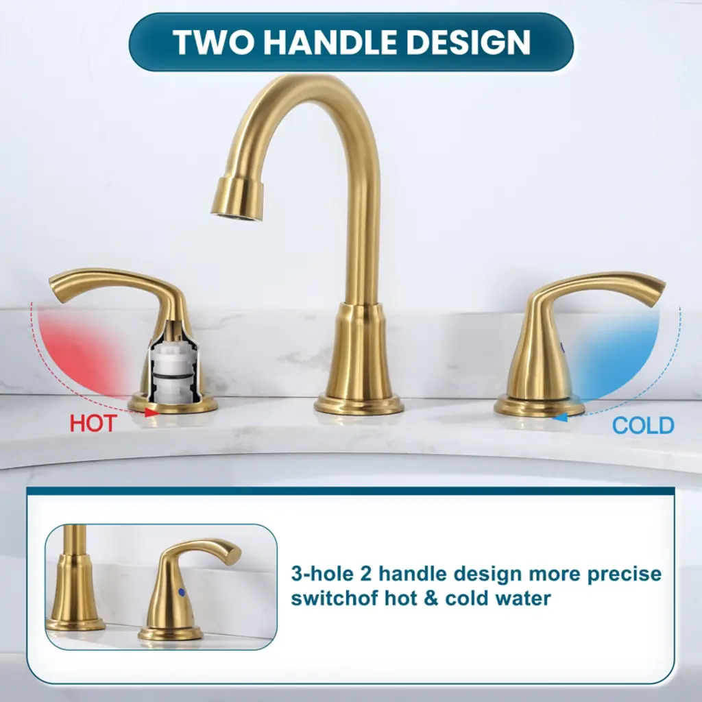 This product is equipped with two handles and a spout, suitable for various three-hole sink configurations, ensuring it meets your different needs. Made of high-quality materials, it boasts excellent resistance to scratches and rust , enduring daily use and providing long-term durability. Installation is simple, requiring no professional tools, and it is specifically designed for 3-hole, 6-16-in. environments. Enhance the aesthetics and comfort of your bathroom space, while its unique and stylish design adds a modern atmosphere to your bathroom.
