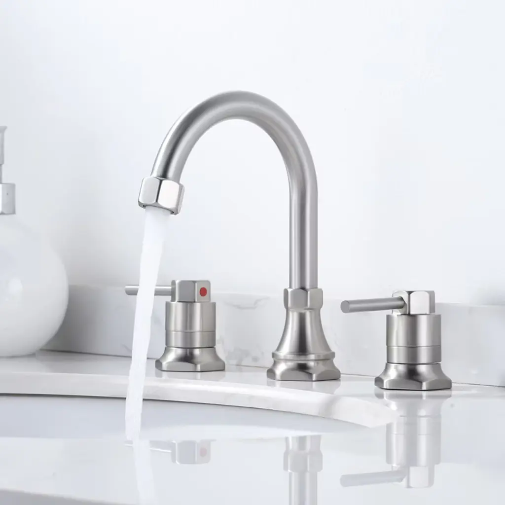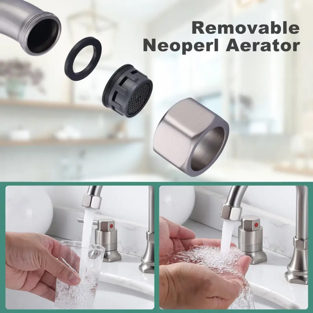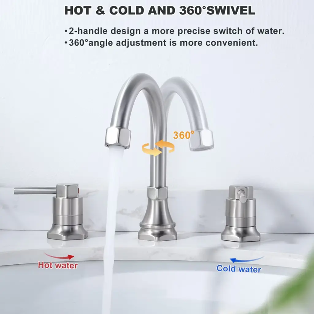 This basin faucet, with classic brushed nickel as the tone, highlights extraordinary taste and a calm, refined temperament. Its hex nut detailing on the base and spout adds a bold industrial flair, while the brushed finish offers a sleek, contemporary look that resists fingerprints and corrosion. The double handle design allows for precise two-hand control of hot and cold water, ensuring convenient operation and accurate temperature adjustment. Paired with high-quality water supply lines, it guarantees smooth and reliable flow. The cleverly engineered drain system enables quick, quiet drainage, adding both functionality and modern elegance to your bathroom space.