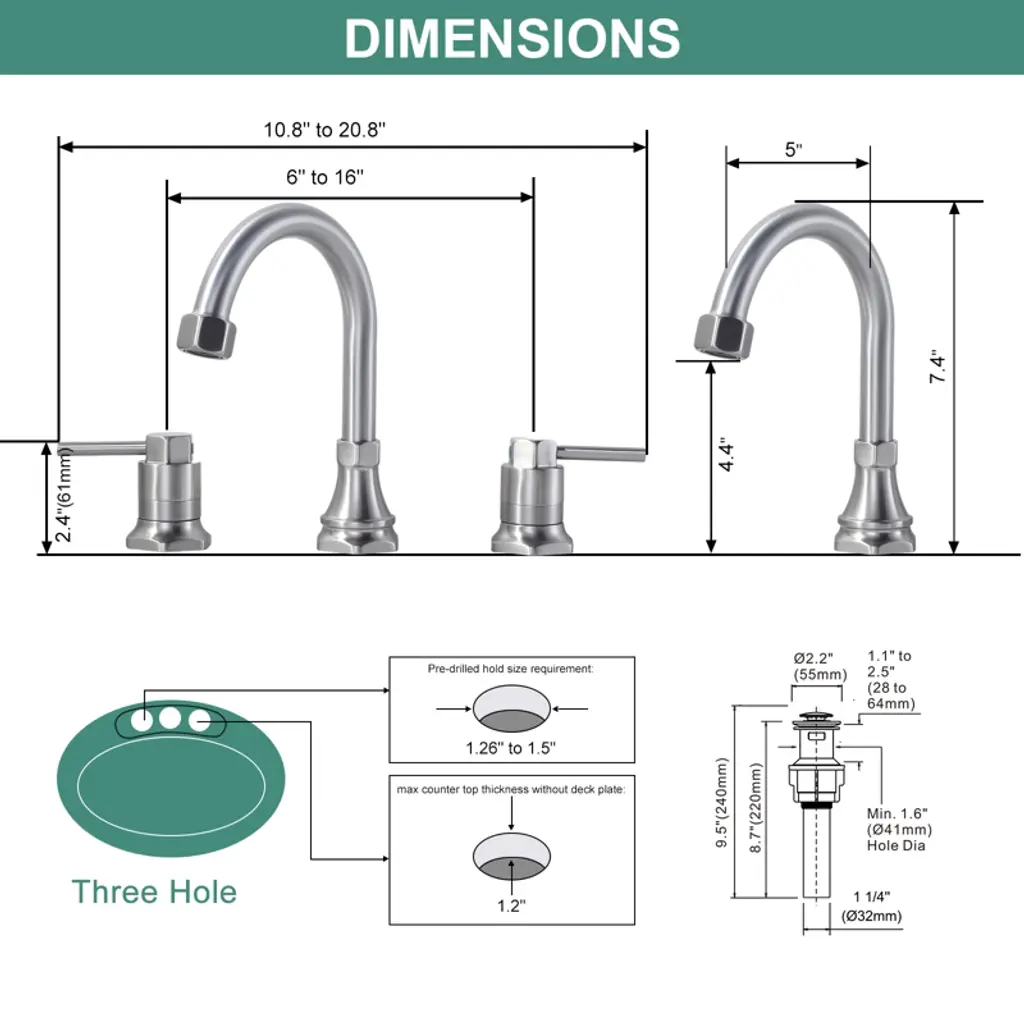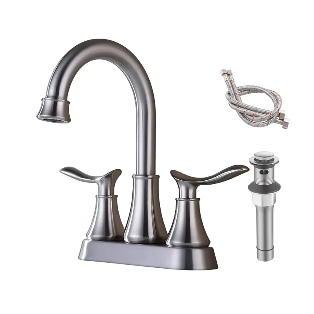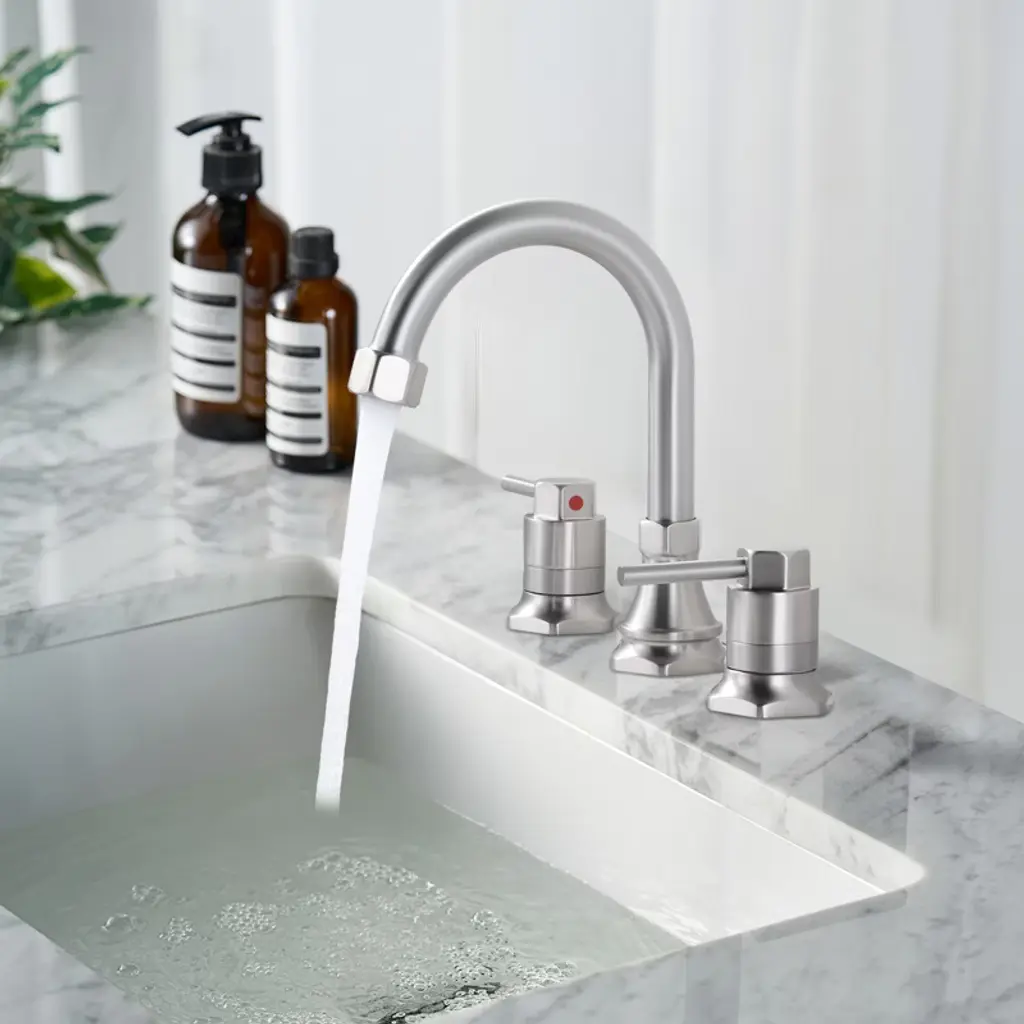 This basin faucet, with classic brushed nickel as the tone, highlights extraordinary taste and a calm, refined temperament. Its hex nut detailing on the base and spout adds a bold industrial flair, while the brushed finish offers a sleek, contemporary look that resists fingerprints and corrosion. The double handle design allows for precise two-hand control of hot and cold water, ensuring convenient operation and accurate temperature adjustment. Paired with high-quality water supply lines, it guarantees smooth and reliable flow. The cleverly engineered drain system enables quick, quiet drainage, adding both functionality and modern elegance to your bathroom space.