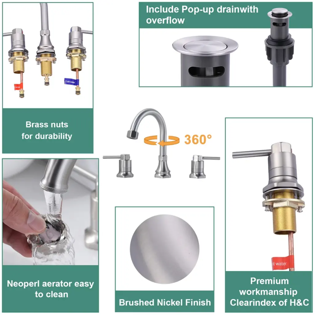 Wowow 8 In. Widespread Double Handle Bathroom Faucet With Pop-up Drain Kit In Brushed Nickel