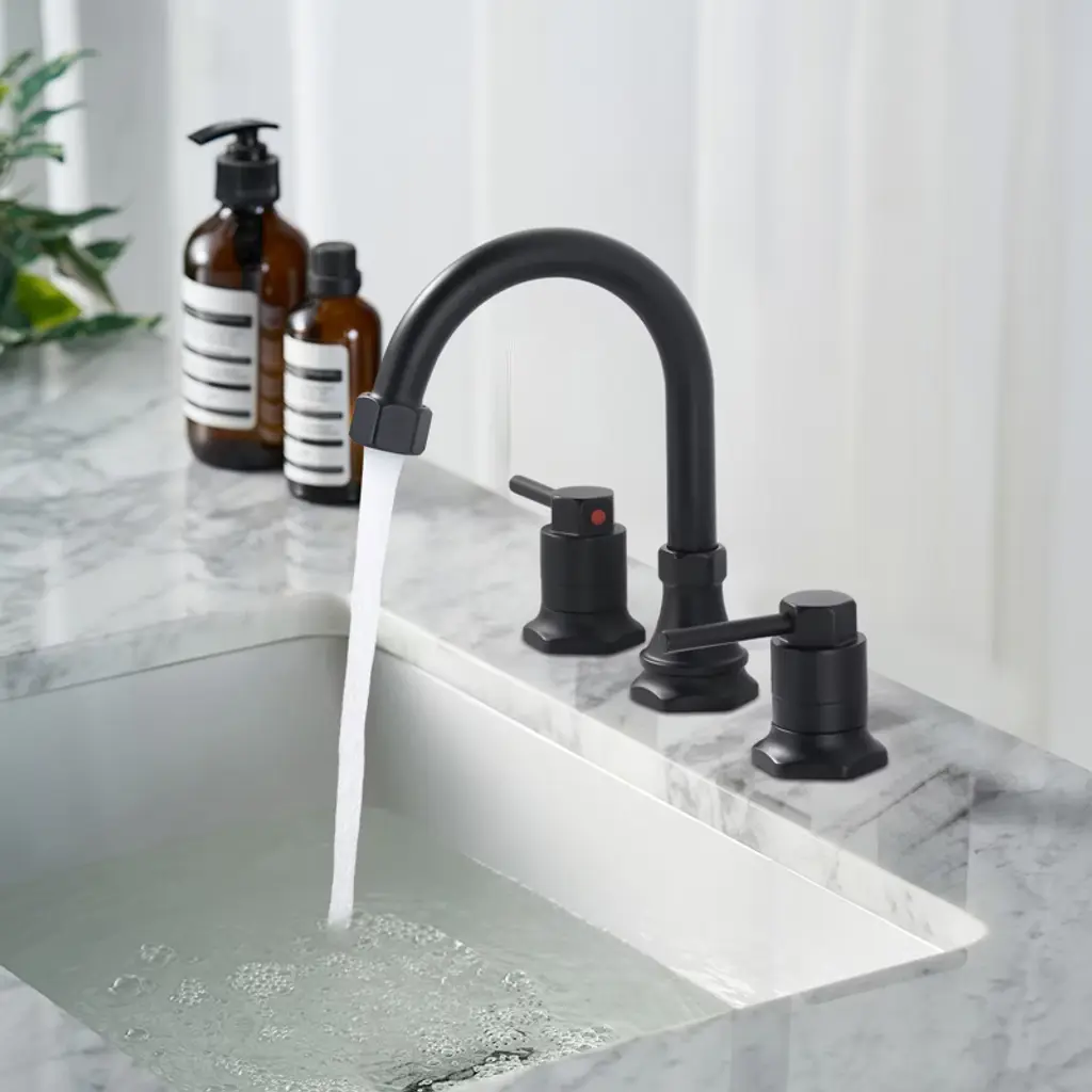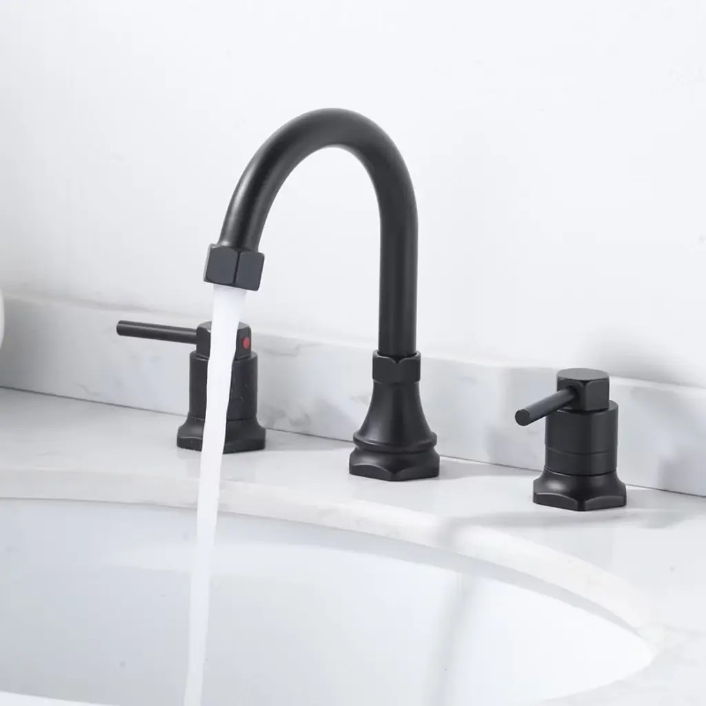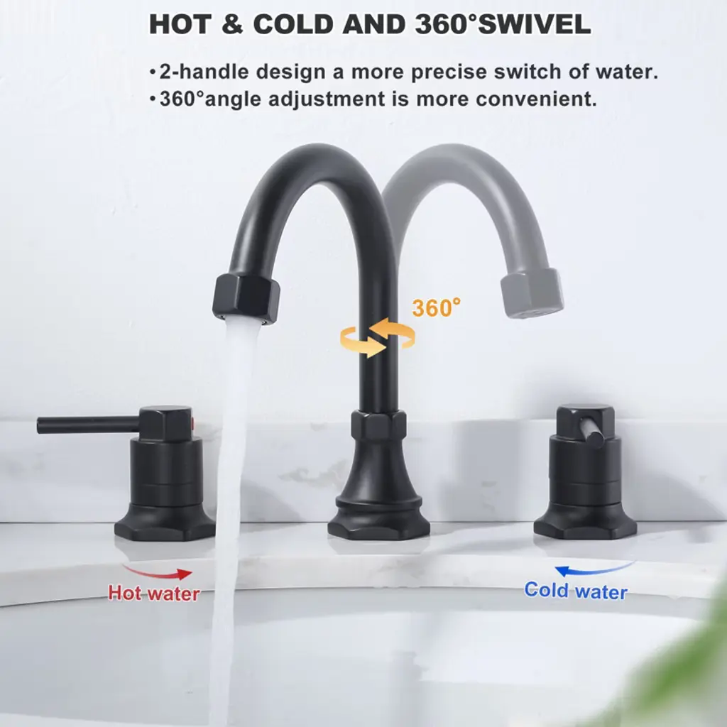 This basin faucet, with classic brushed nickel as the tone, highlights extraordinary taste and a calm, refined temperament. Its hex nut detailing on the base and spout adds a bold industrial flair, while the brushed finish offers a sleek, contemporary look that resists fingerprints and corrosion. The double handle design allows for precise two-hand control of hot and cold water, ensuring convenient operation and accurate temperature adjustment. Paired with high-quality water supply lines, it guarantees smooth and reliable flow. The cleverly engineered drain system enables quick, quiet drainage, adding both functionality and modern elegance to your bathroom space.