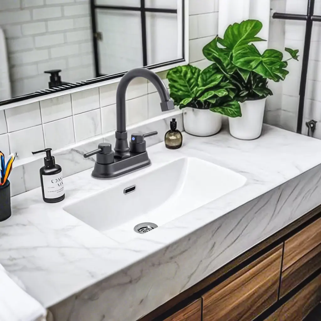 Upgrade your bathroom with this 2-handle centerset faucet, designed for 2-hole sinks with 4-inch spacing. The high arc spout provides more clearance and convenience for everyday washing, while the dual handles offer precise control of hot and cold water. Built for durability, it features a ceramic valve for smooth operation and long-lasting leak resistance. The included pop-up drain fits sinks with overflow holes. Perfect for modern and transitional bathrooms, this faucet adds both function and style to your sink with a clean, minimalist design. All necessary parts and instructions are included for a hassle-free DIY upgrade.