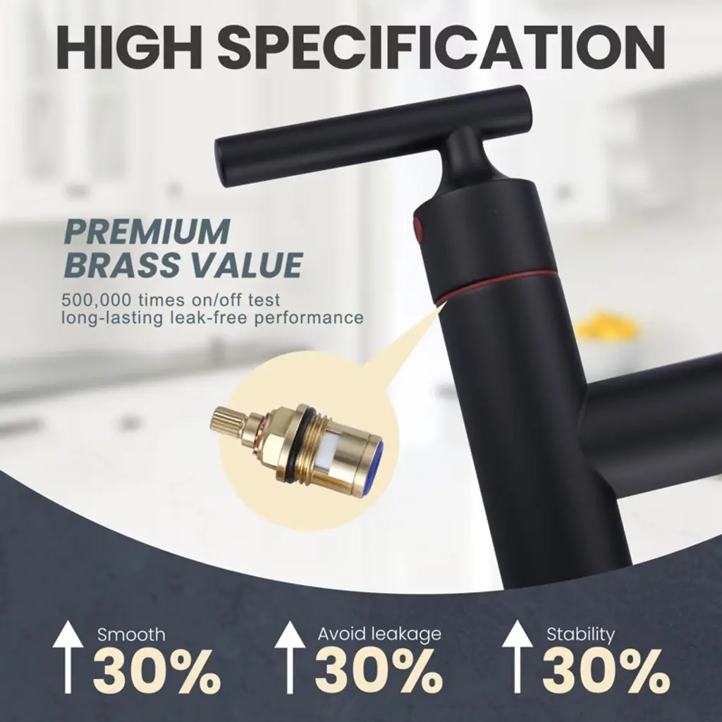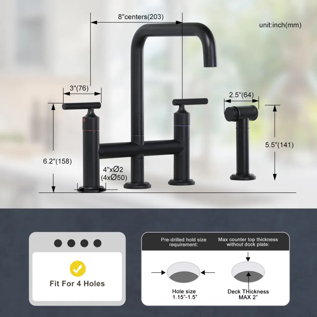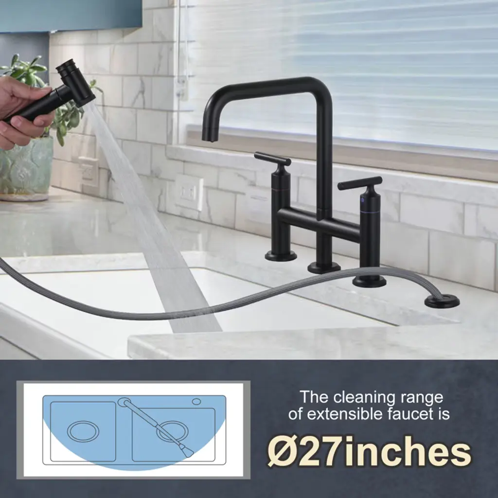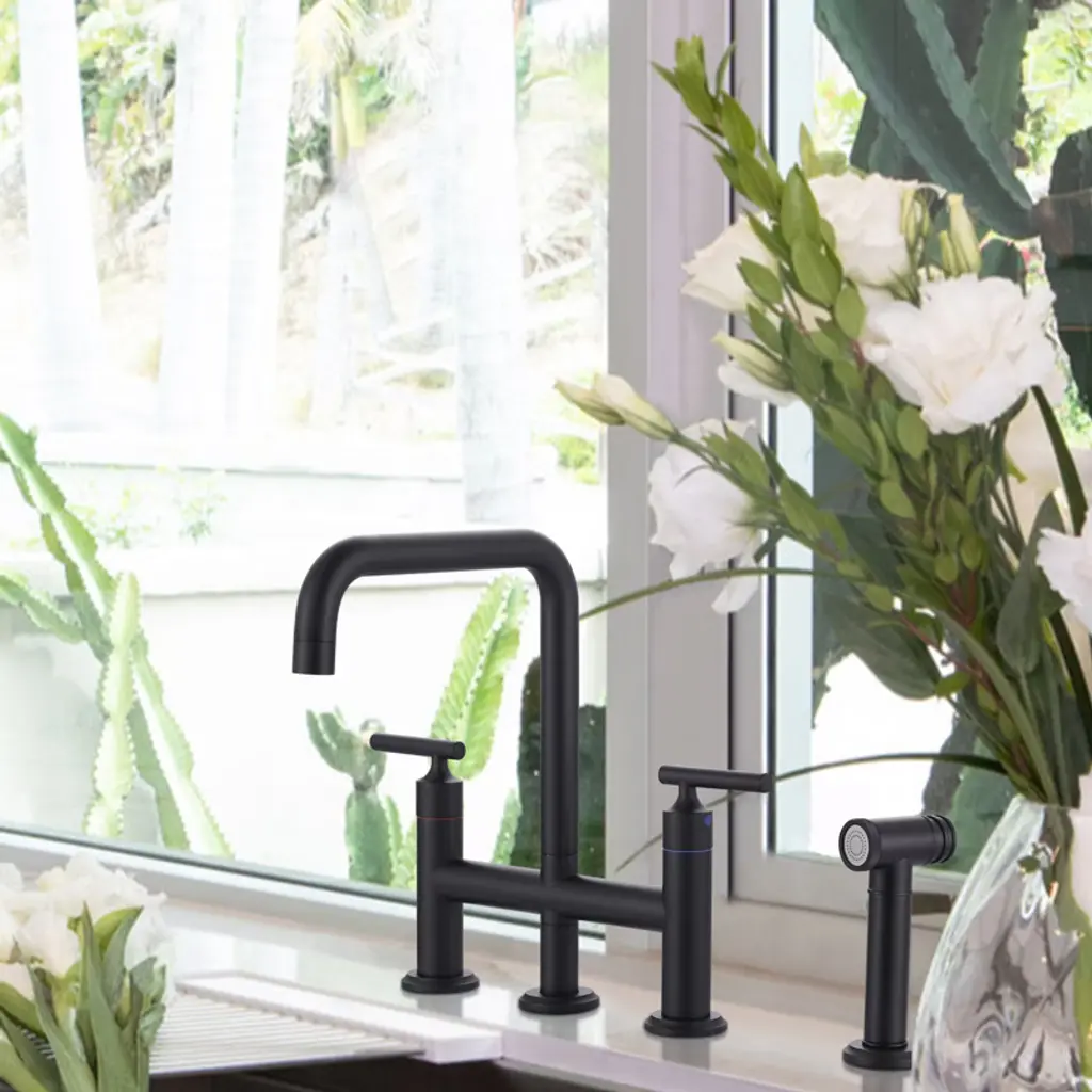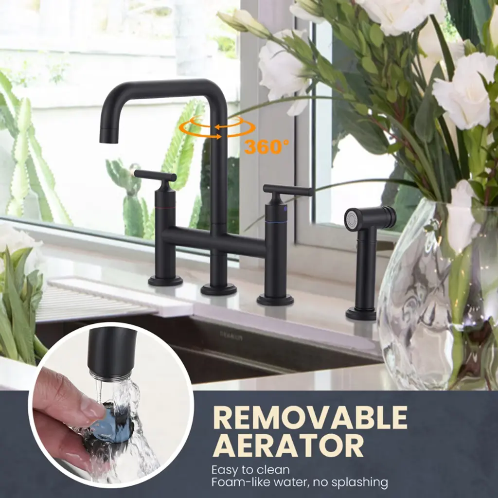 This Double Handle Brass Bridge Kitchen Faucet with Side Sprayer is a perfect blend of functionality and style. Constructed from solid brass, it guarantees durability and longevity, standing up to the rigors of daily kitchen use while resisting corrosion. Double - level handles offer a comfortable hold, allowing you to smoothly adjust the water temperature and flow by simply rotating the handles. The practical side sprayer, featuring a circular knob for precise water flow control, makes rinsing dishes, filling pots, and cleaning the sink a breeze. Its distinctive bridge style enhances any kitchen's look, adding a modern, sophisticated touch. Enhance your kitchen experience with this kitchen faucet.
