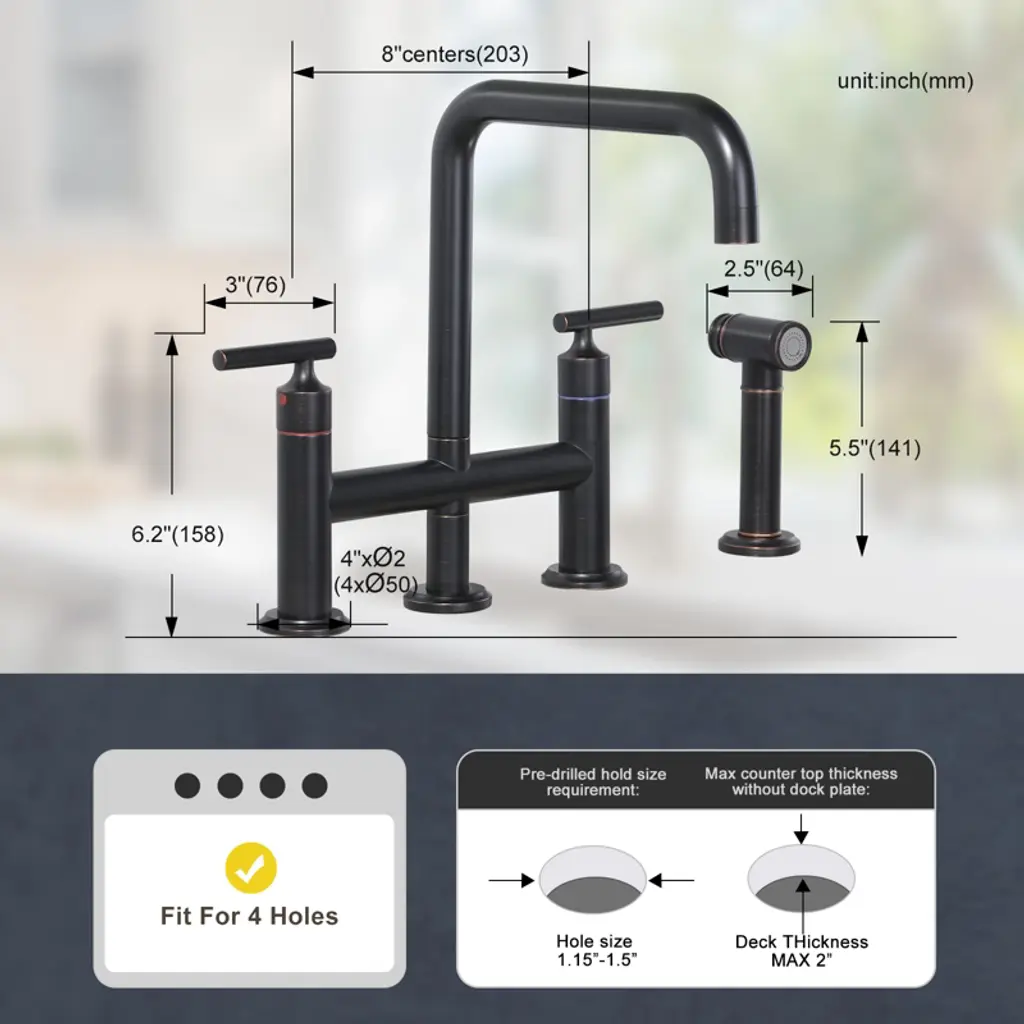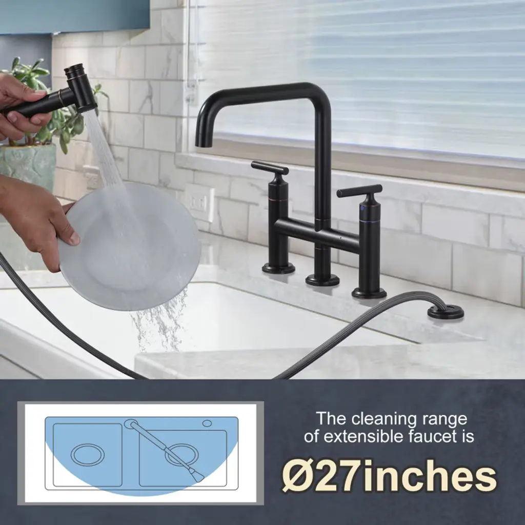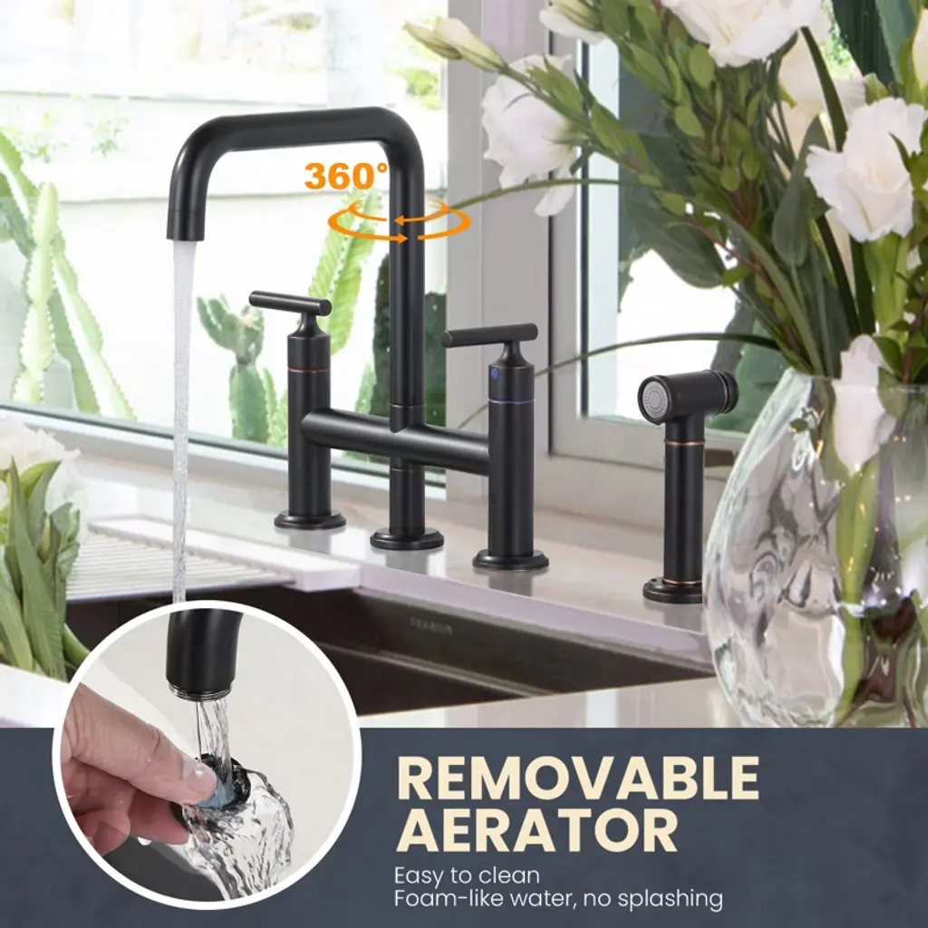 Wowow Brass Double Handle Bridge Kitchen Faucet, Deck Mount Kitchen Sink Faucet With Side Sprayer In Oil Rubbed Bronze