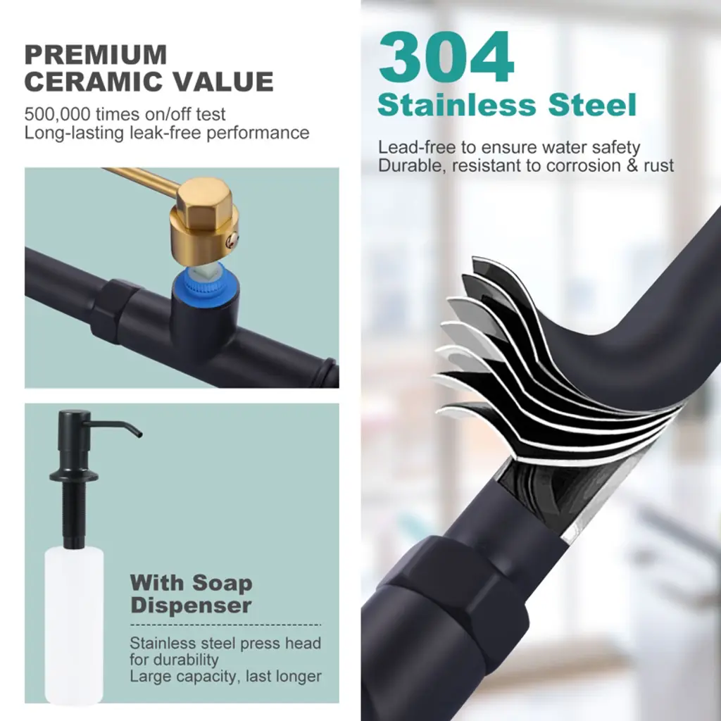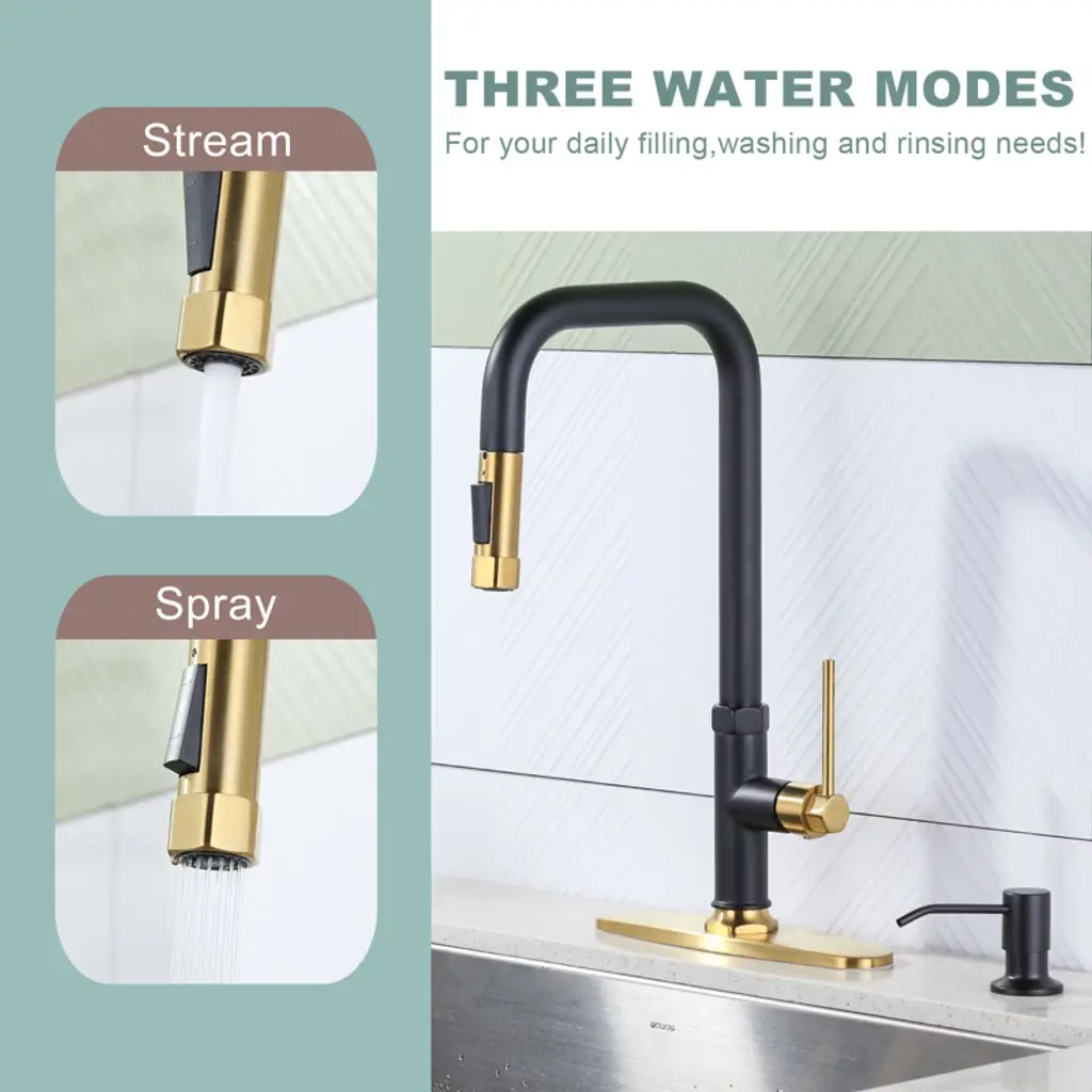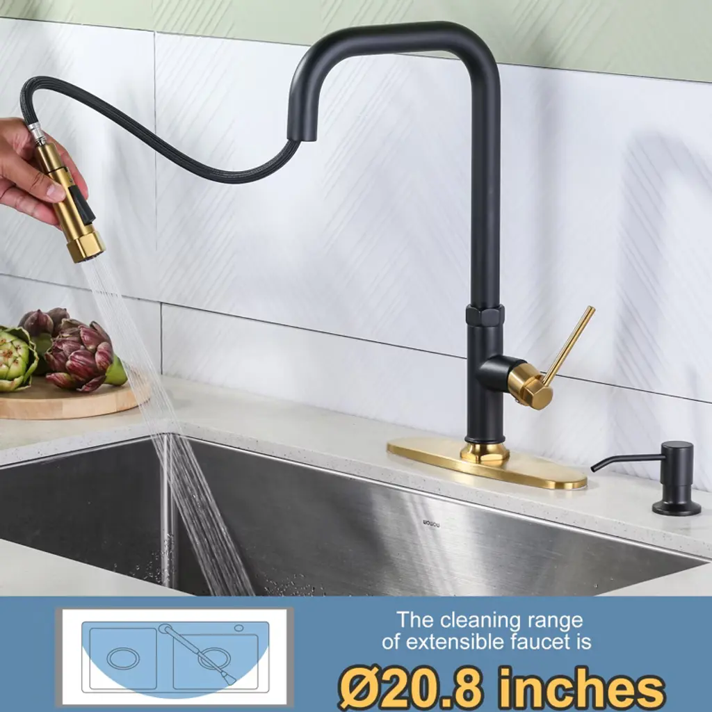 Wowow Brass Single Handle Pull Down Sprayer Kitchen Faucet With Soap Dispenser In Black And Gold