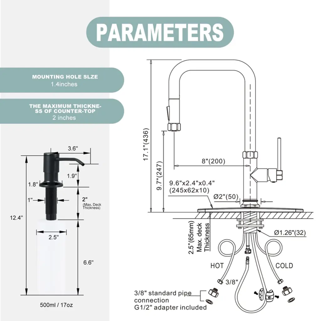 The package includes a 17 in. tall kitchen faucet and a 12 oz. high-capacity soap dispenser. A push-on soap dispenser is included, making your daily life easier and making every wash a pleasure. The featured pull-down sprayer accurately covers every tiny corner, making stains invisible and cleaning more effective. The modern finish is anti-fingerprint, scratch-resistant, and easily matches most kitchen decor. Smooth retractable nylon sprayer hose with 20.8 in. extension allows you to reach all areas of the sink with ease. Perfect for extensive advanced cleaning.
