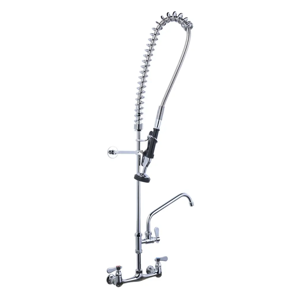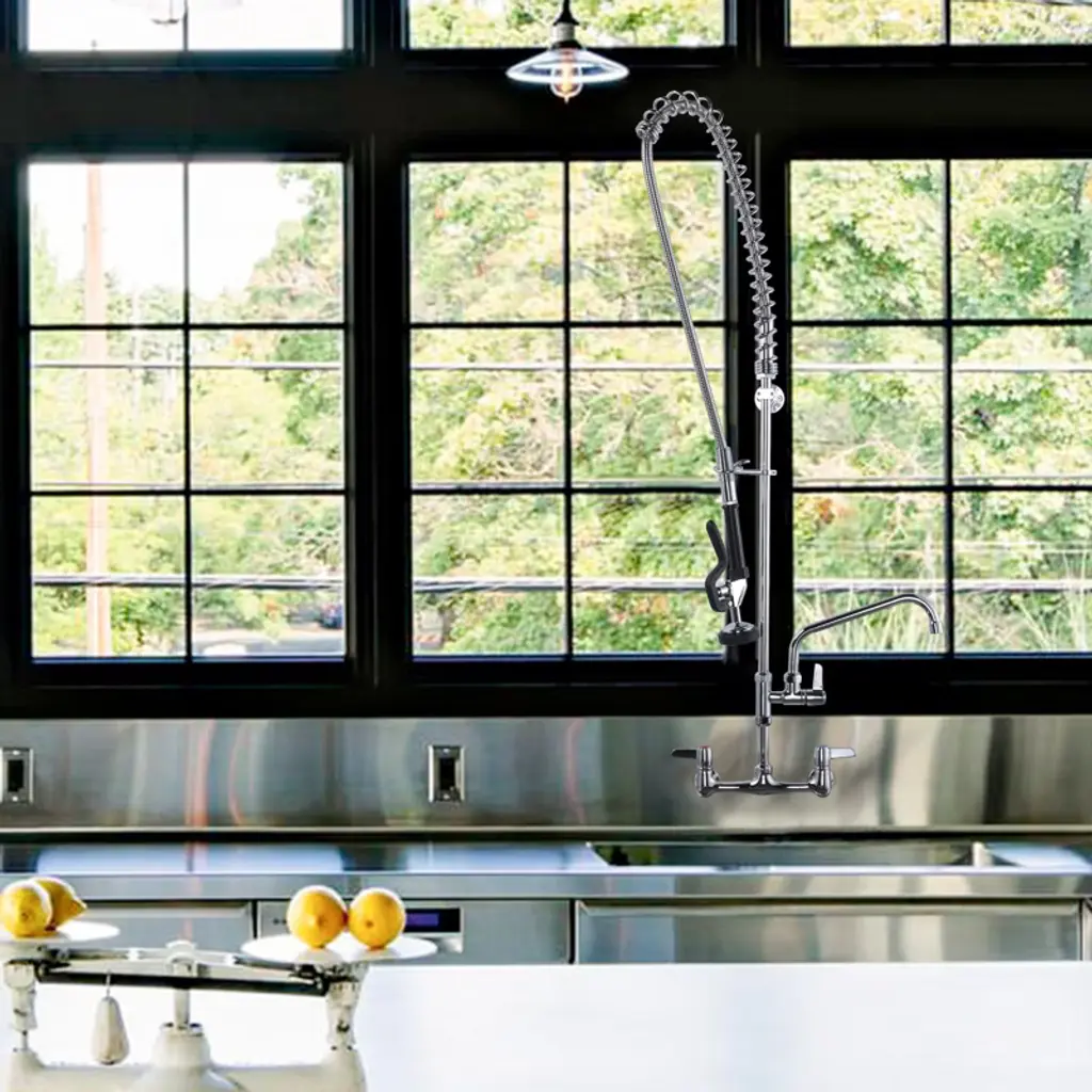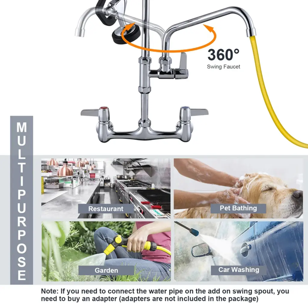 Experience the perfect blend of style and functionality with this commanding and efficient kitchen faucet.The wall-mount design saves space, making it perfect for both commercial and residential kitchens.Crafted from durable Solid Brass, this faucet exudes modernity and resilience.With Triple handles for precise control, the pull-down sprayer enhances versatility and the pre-rinse feature streamlines your kitchen tasks.