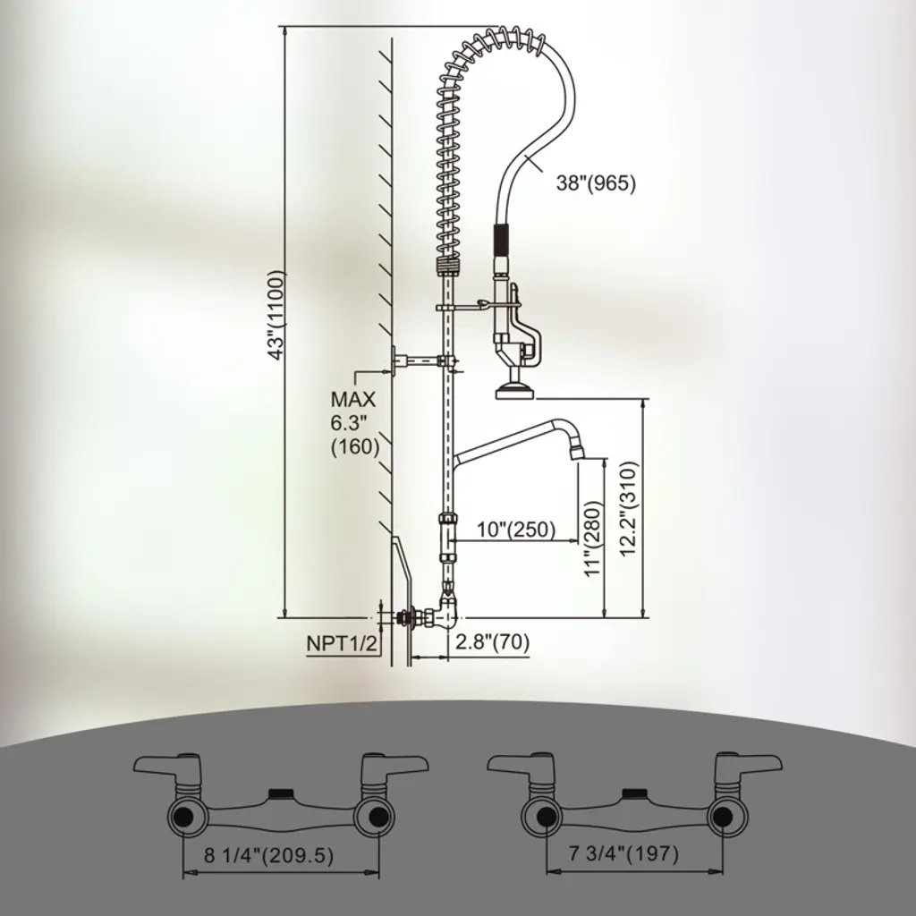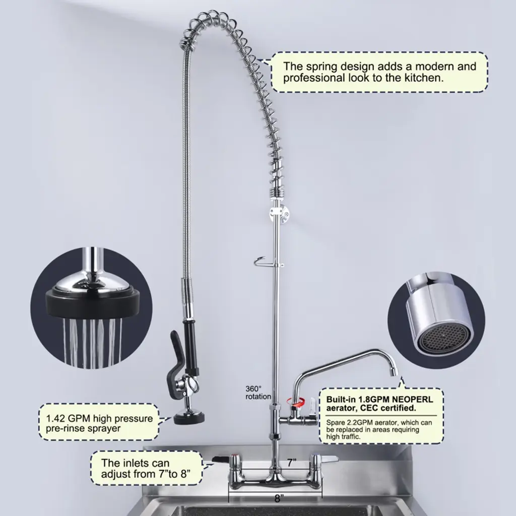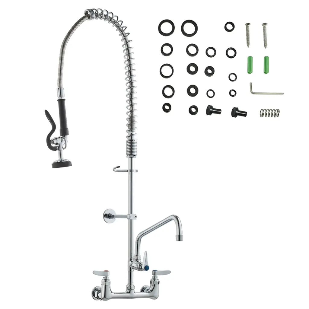 Experience the perfect blend of style and functionality with this commanding and efficient kitchen faucet.The wall-mount design saves space, making it perfect for both commercial and residential kitchens.Crafted from durable Solid Brass, this faucet exudes modernity and resilience.With Triple handles for precise control, the pull-down sprayer enhances versatility and the pre-rinse feature streamlines your kitchen tasks.