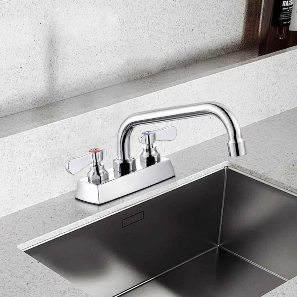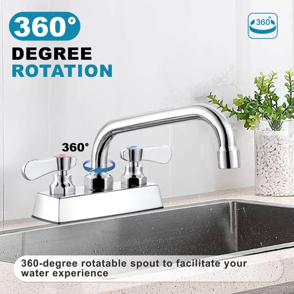 This kitchen faucet is a kitchen helper. With its 360° swivel nozzle, it has the flexibility to direct water where it's needed, whether it's a single or double sink, giving you plenty of room for all kinds of kitchen tasks. The dual handles allow you to precisely control the water temperature and flow rate, making it easy to meet a wide range of needs. The material is made of solid brass to protect your family's health, corrosion resistance, and durability. Multi-functional scenarios are suitable for the kitchen, dining room, laundry room, and even outdoors. The built-in high-efficiency aerator reduces splashing, saves water, and reduces noise. 2-hole installation, stable and non-shaking. The quick-connect design makes installation easy; follow the instructions, even a novice can easily handle it, bringing convenience and practicality to your kitchen.