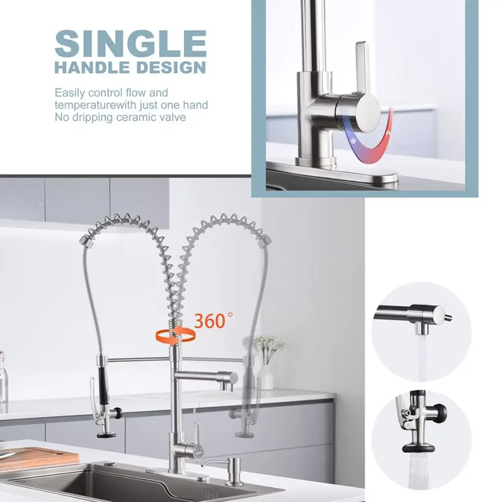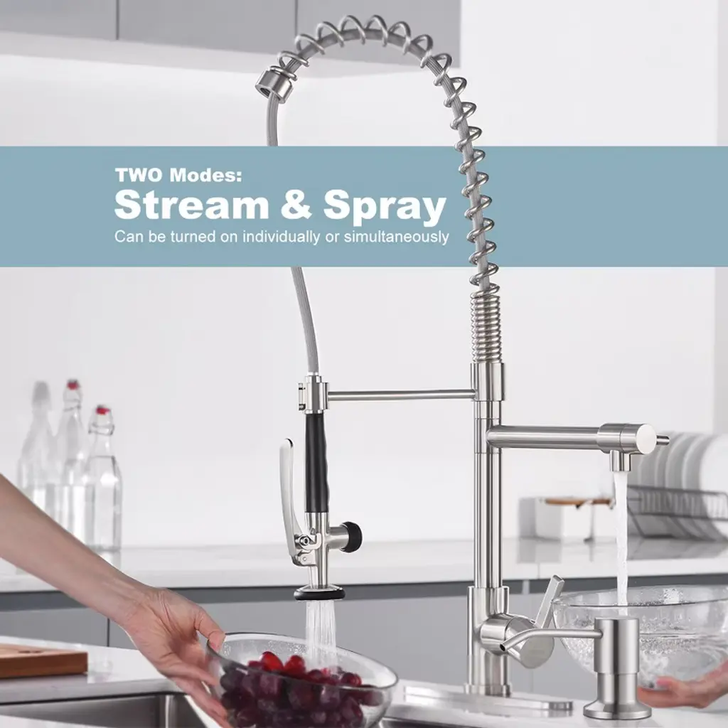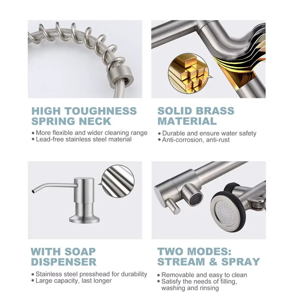 Upgrade your commercial kitchen with this single-handle commercial kitchen faucet. This faucet offers excellent functionality and reliable performance, making it an ideal choice for restaurants, hotels, and other food service establishments. The extended pull-out hose provides flexibility and convenience, allowing you to effortlessly reach every corner of the sink. Whether you need to fill large pots or rinse dishes, this faucet meets your needs. The two spray modes offer versatility for various tasks. Made of solid brass, this faucet withstands daily use. The included soap dispenser adds convenience and eliminates countertop clutter.