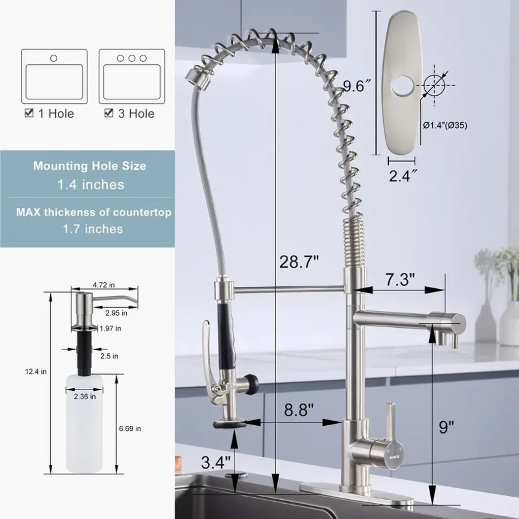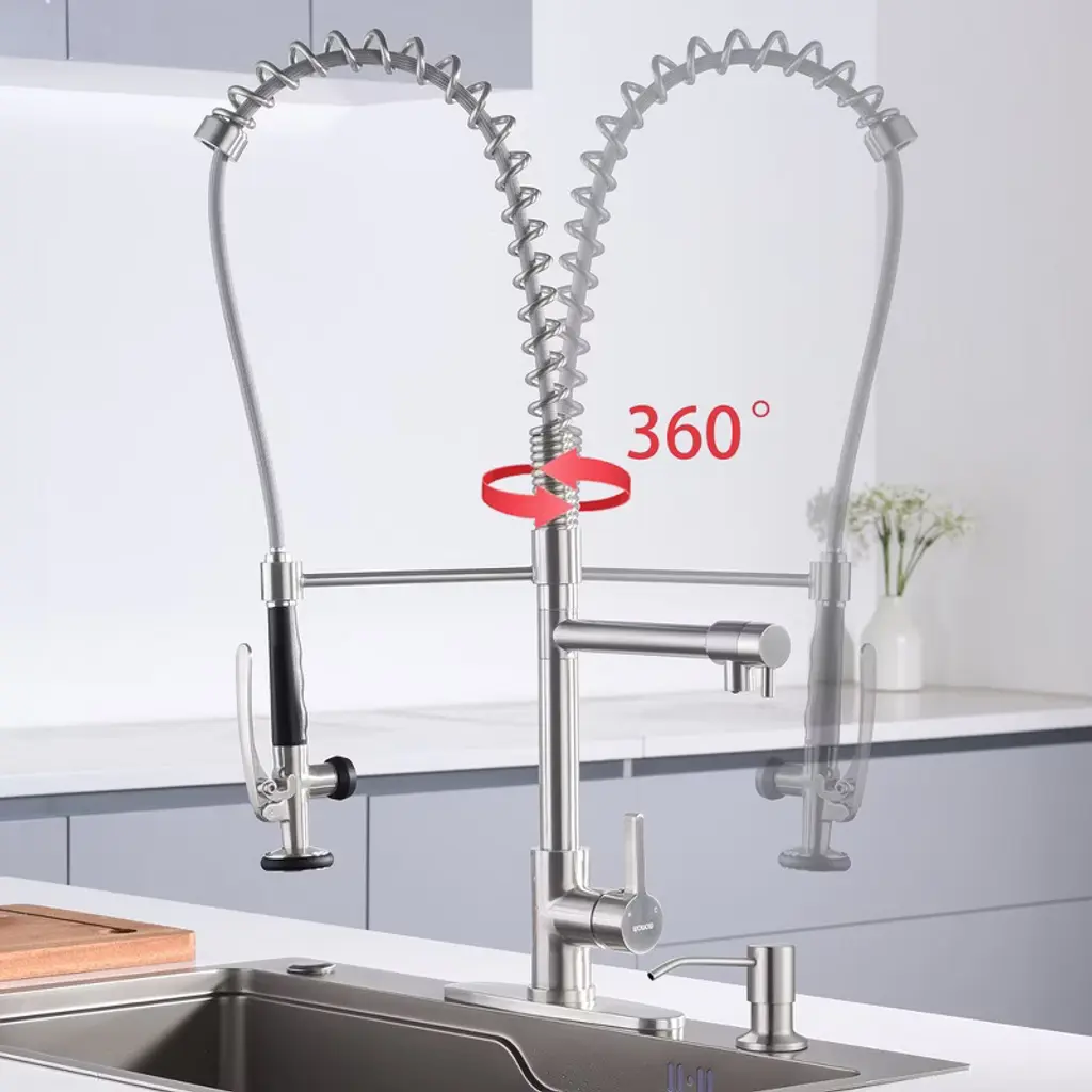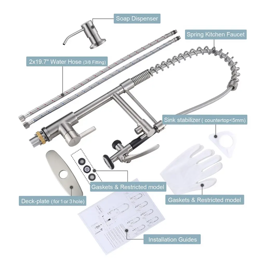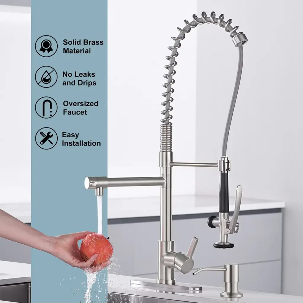 Upgrade your commercial kitchen with this single-handle commercial kitchen faucet. This faucet offers excellent functionality and reliable performance, making it an ideal choice for restaurants, hotels, and other food service establishments. The extended pull-out hose provides flexibility and convenience, allowing you to effortlessly reach every corner of the sink. Whether you need to fill large pots or rinse dishes, this faucet meets your needs. The two spray modes offer versatility for various tasks. Made of solid brass, this faucet withstands daily use. The included soap dispenser adds convenience and eliminates countertop clutter.