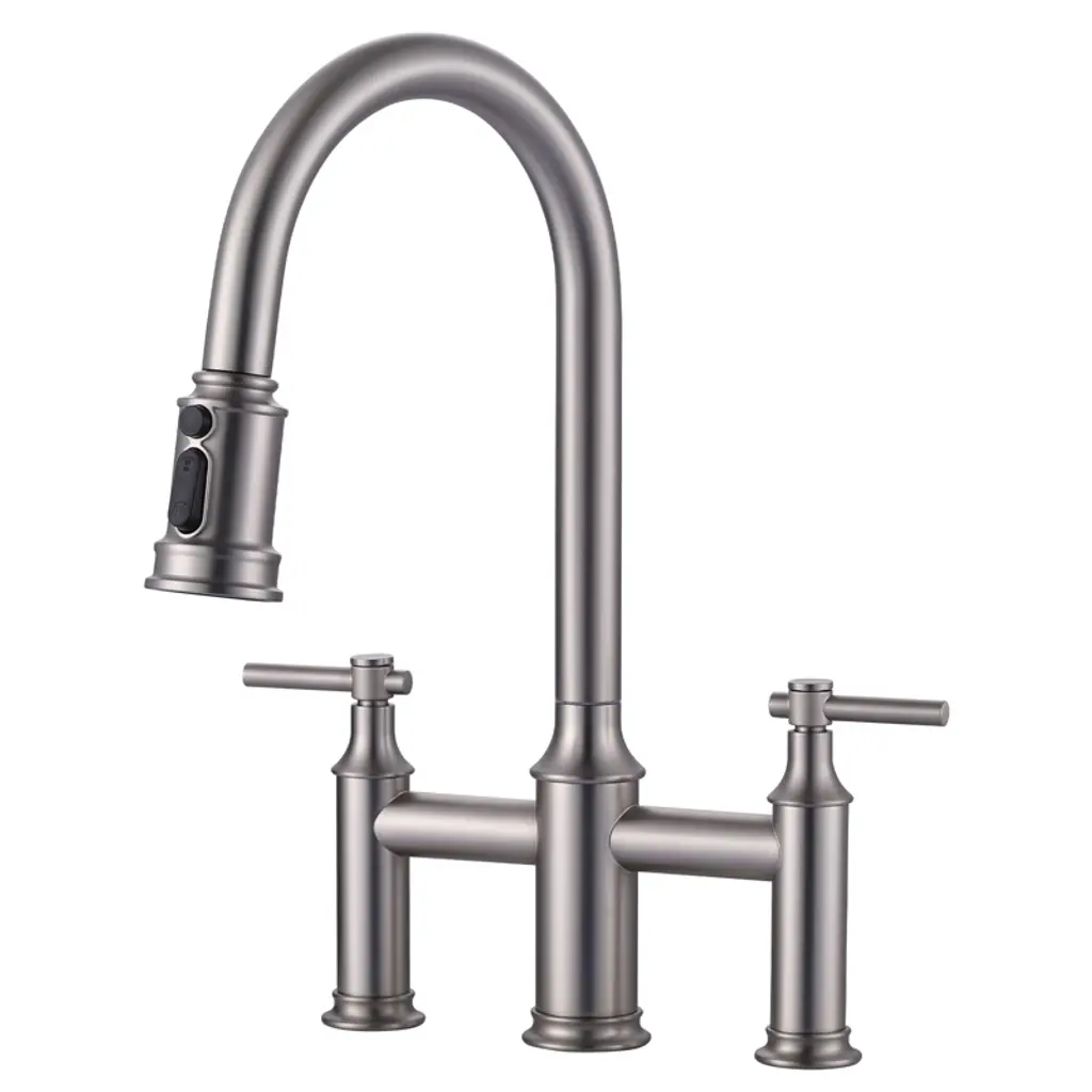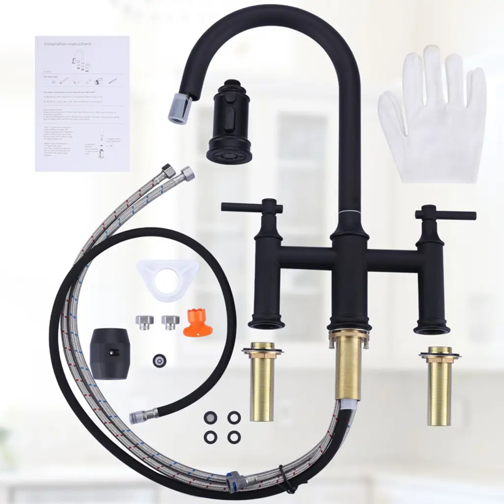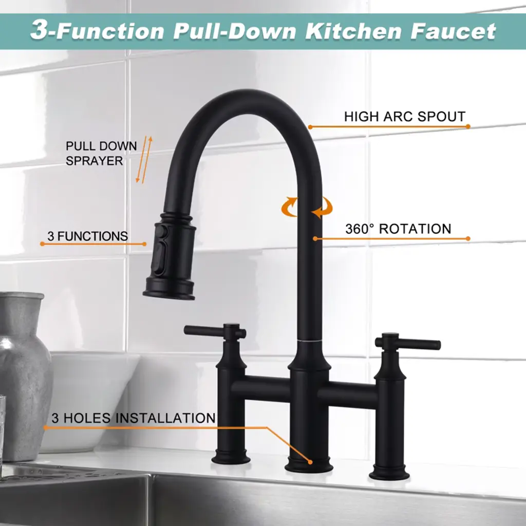 This bridge kitchen faucet combines style and practicality with a pull-down sprayer for easy cleaning and a double handle design for precise water control. The spout rotates 360° for dead-end cleaning. Made of durable brass, rust and corrosion resistant. Support three-hole installation, adaptable. Also equipped with a removable aerator to filter impurities and improve water quality.