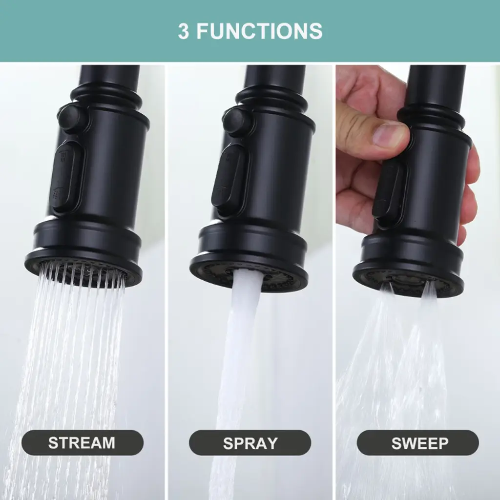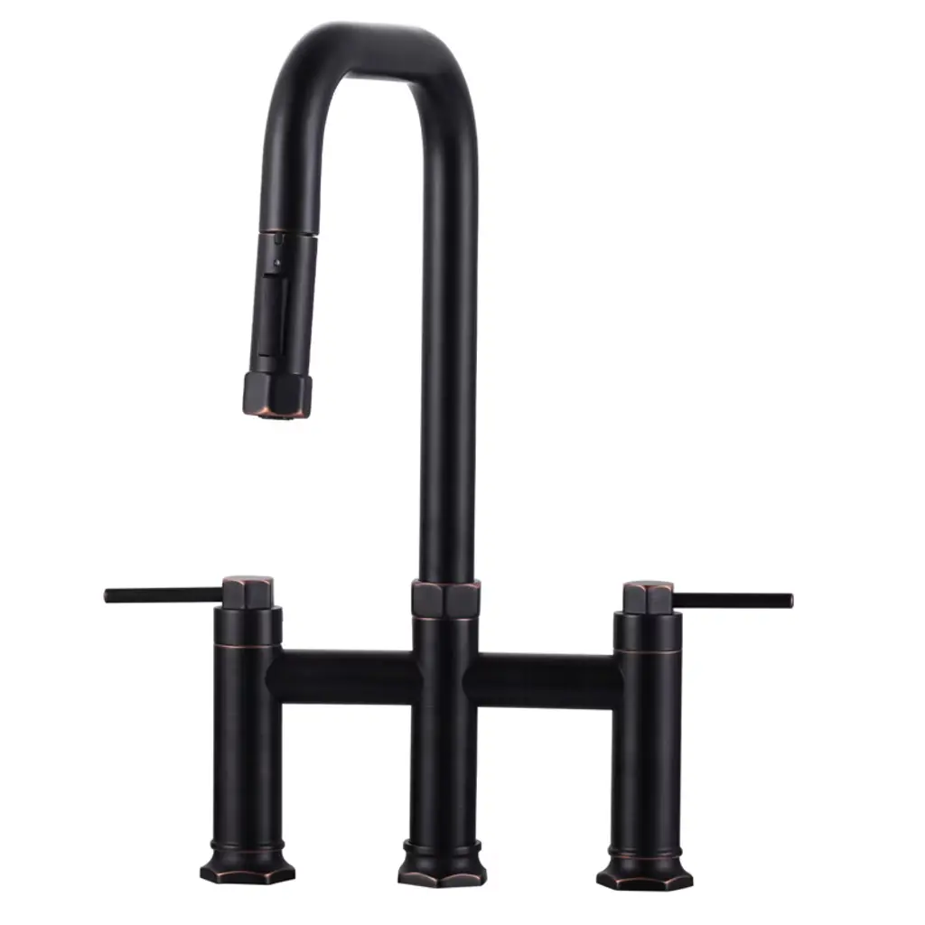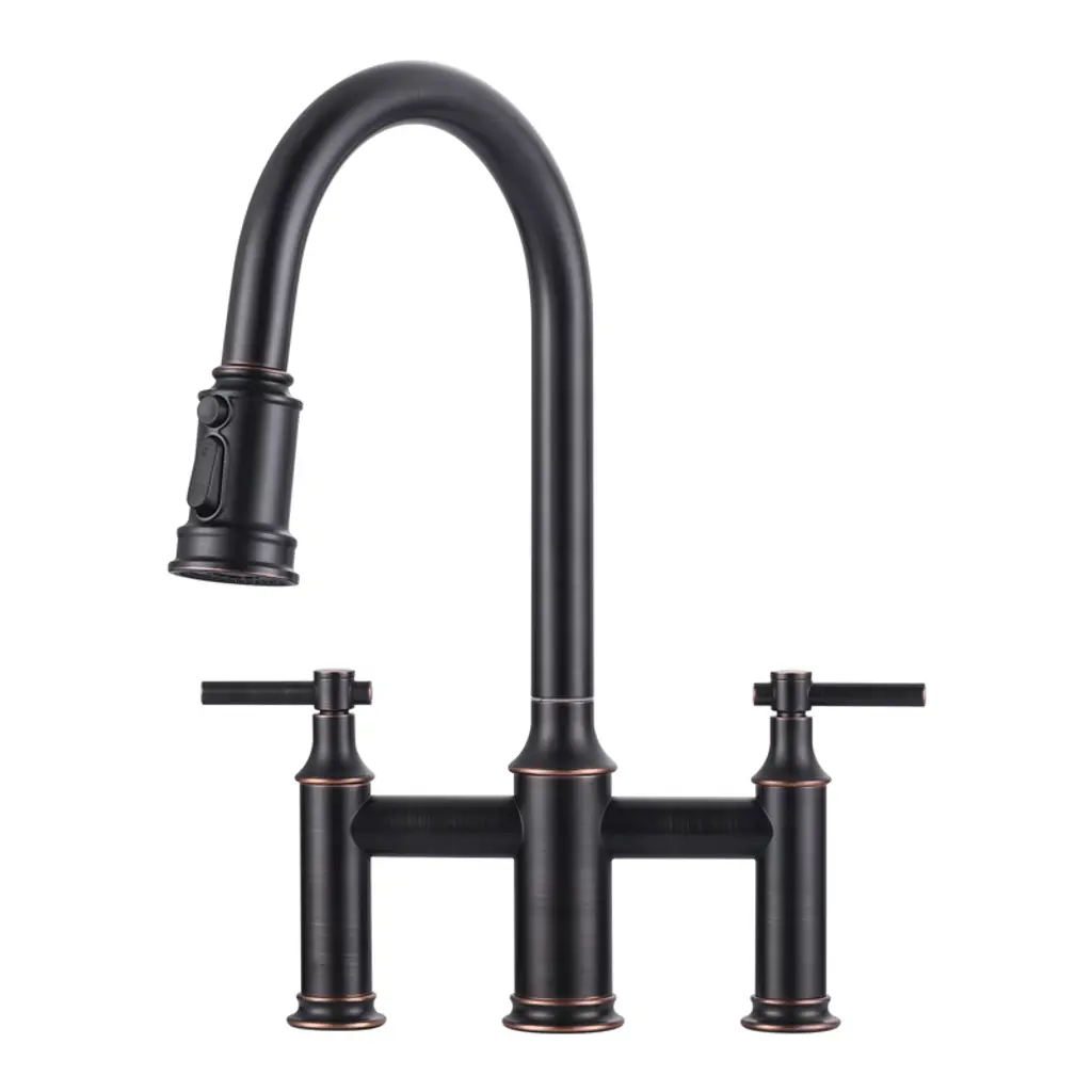 This bridge kitchen faucet combines style and practicality with a pull-down sprayer for easy cleaning and a double handle design for precise water control. The spout rotates 360° for dead-end cleaning. Made of durable brass, rust and corrosion resistant. Support three-hole installation, adaptable. Also equipped with a removable aerator to filter impurities and improve water quality.