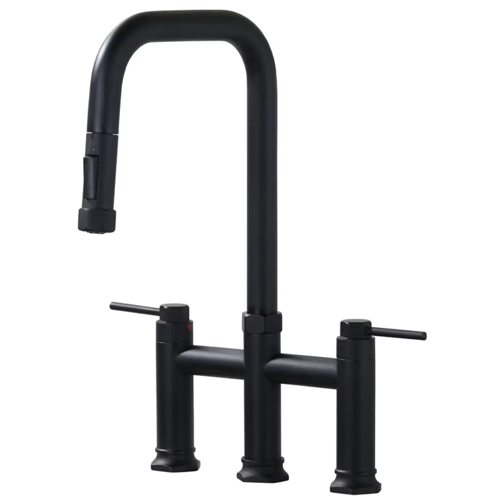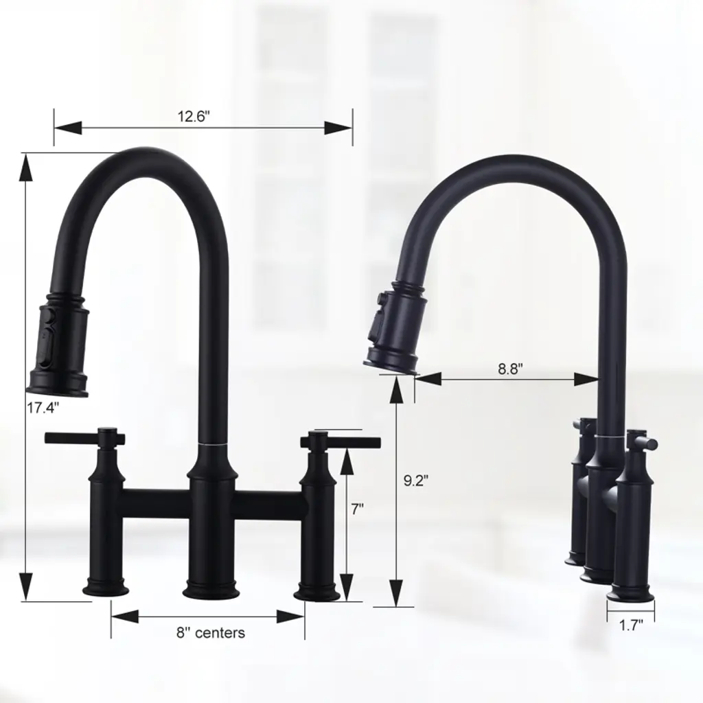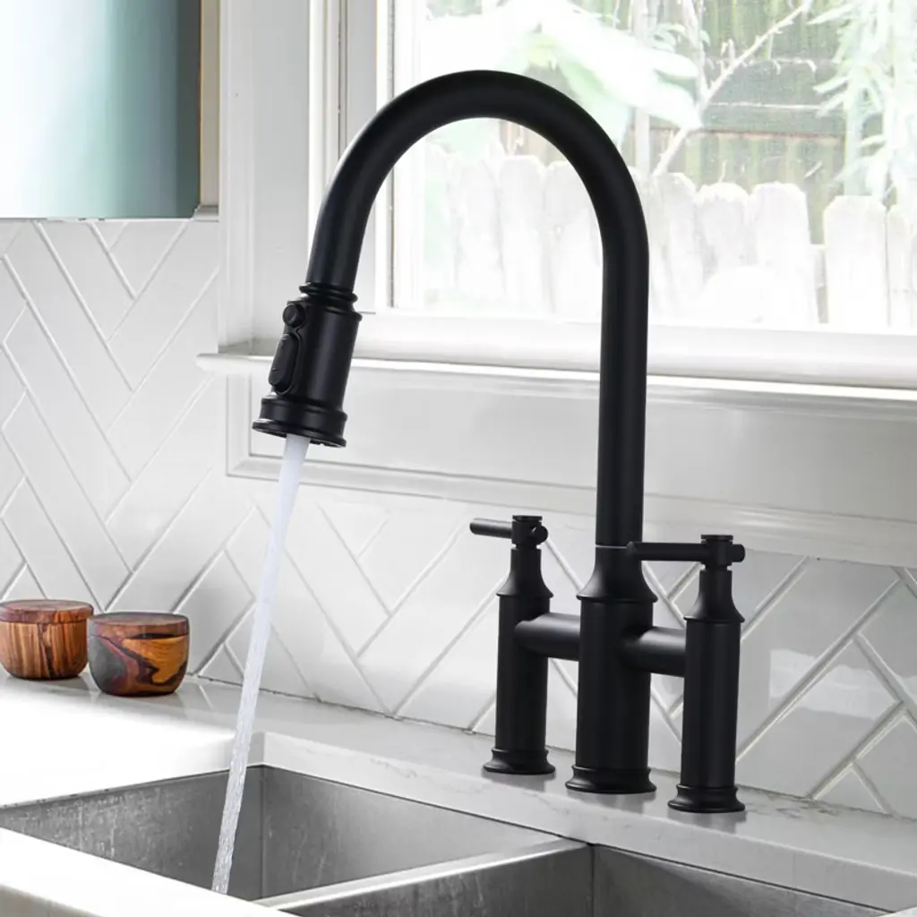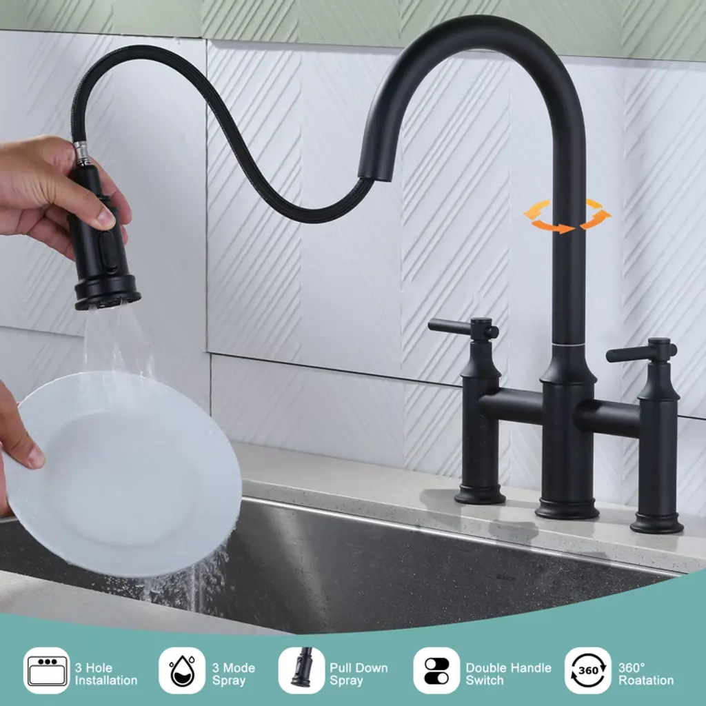 Wowow Double Handle Bridge Kitchen Faucet With 3-spray Patterns And 360 Degrees Rotation Spout In Matte Black