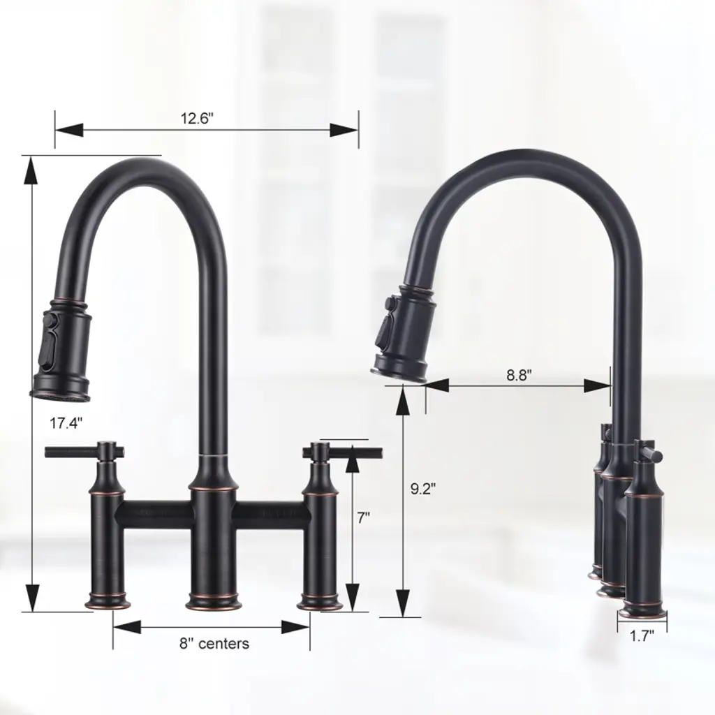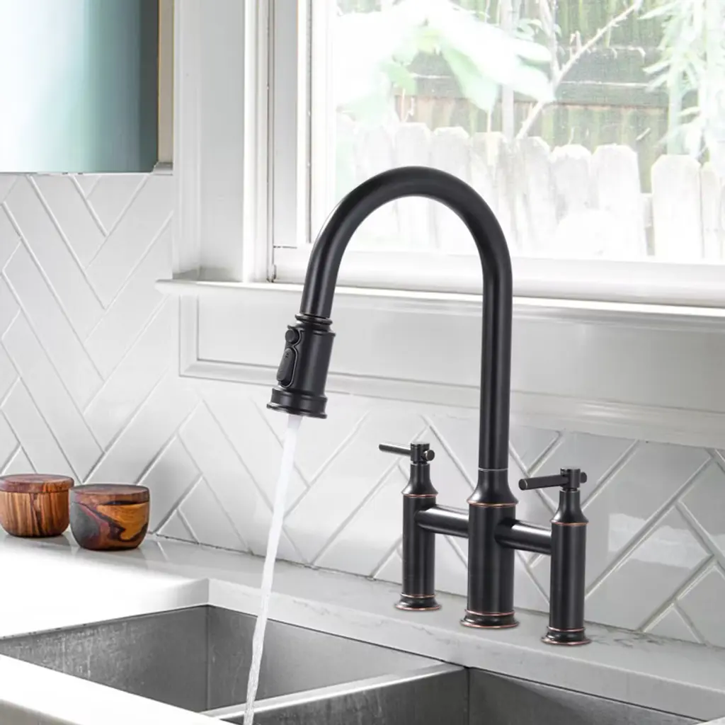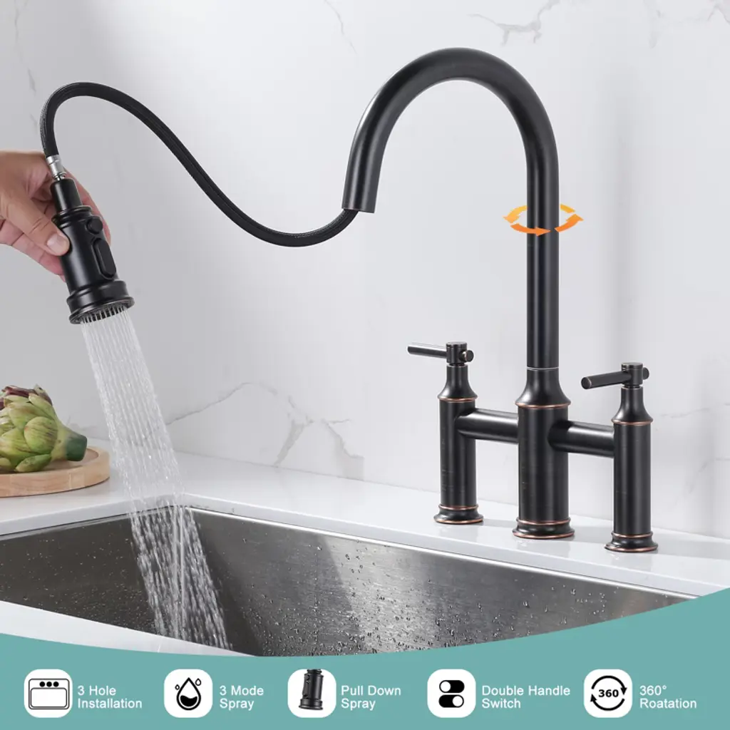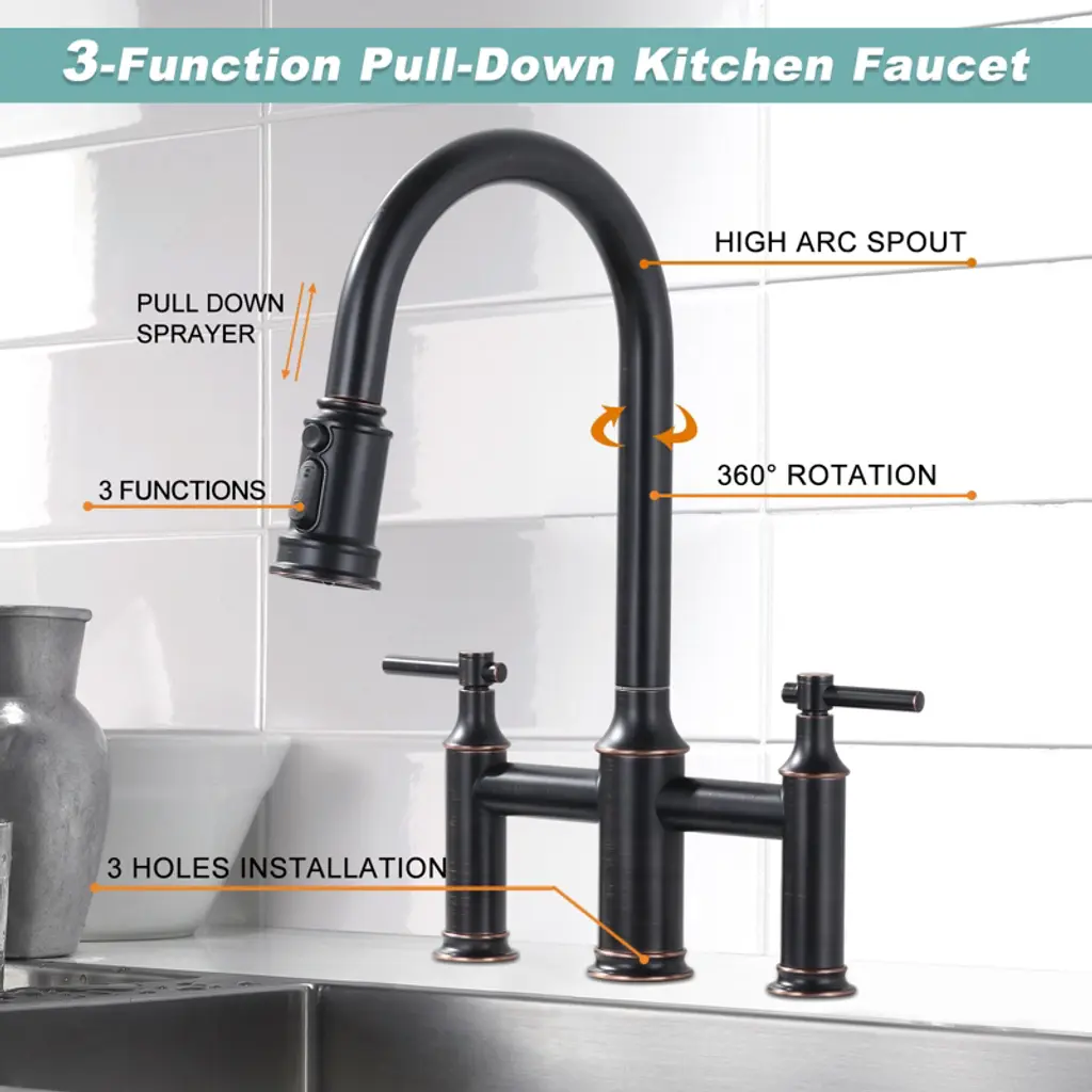 Wowow Double Handle Bridge Kitchen Faucet With 3-spray Patterns And 360 Degrees Rotation Spout In Oil Rubbed Bronze