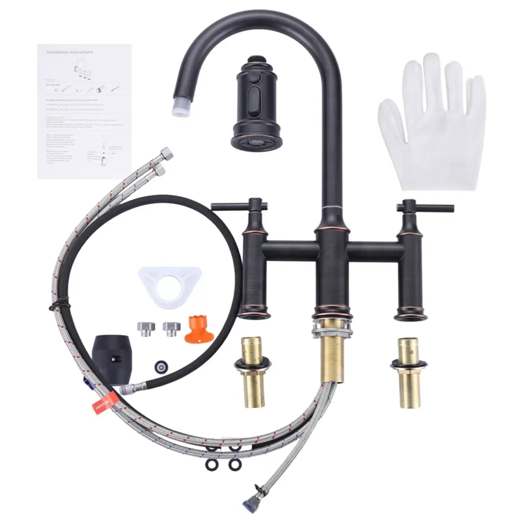 This bridge kitchen faucet combines style and practicality with a pull-down sprayer for easy cleaning and a double handle design for precise water control. The spout rotates 360° for dead-end cleaning. Made of durable brass, rust and corrosion resistant. Support three-hole installation, adaptable. Also equipped with a removable aerator to filter impurities and improve water quality.