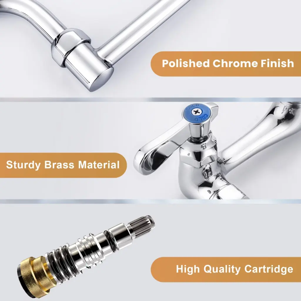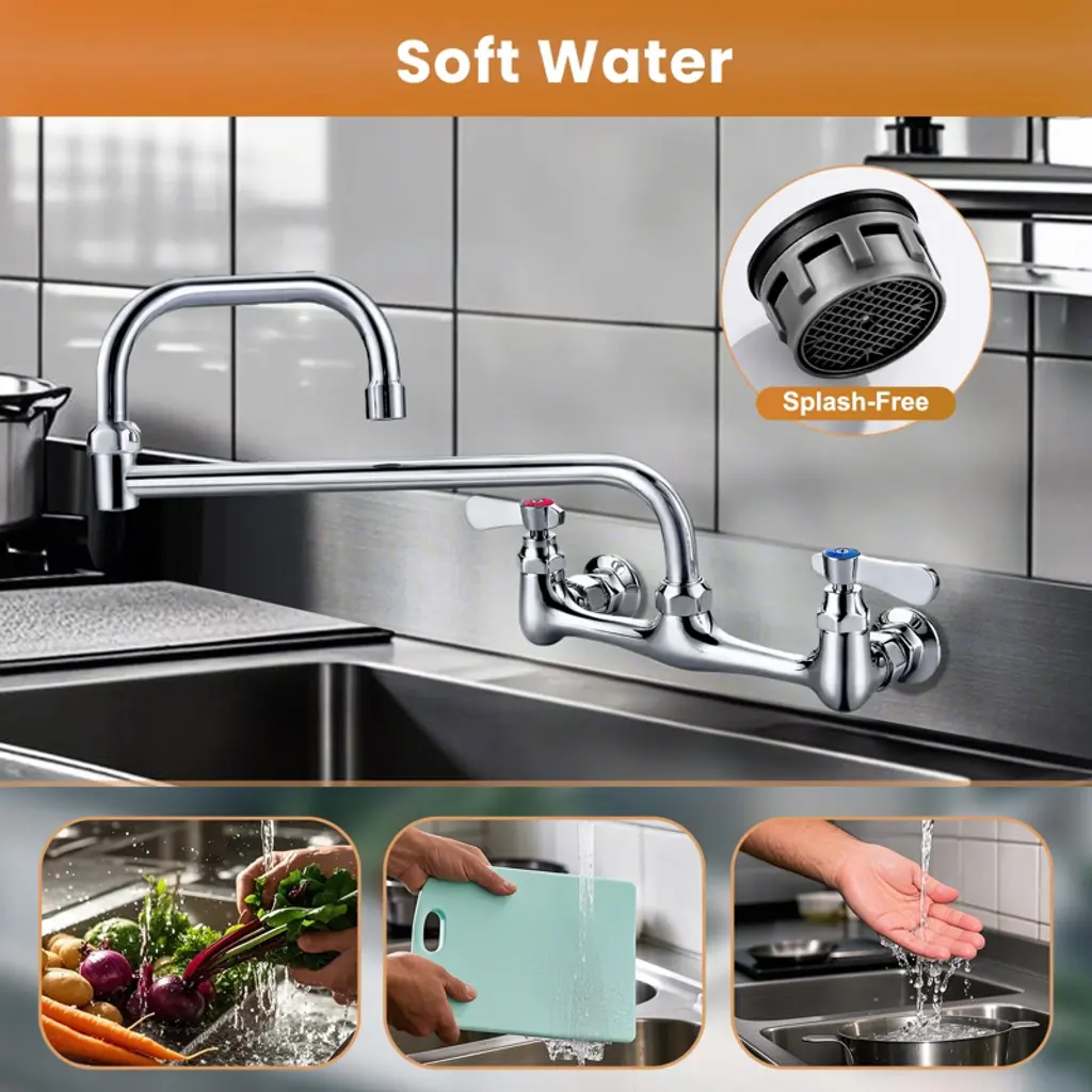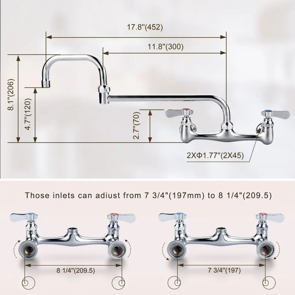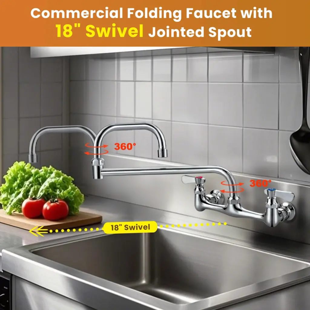 The Commercial Sink Faucet Kitchen features an adjustable wall mount, 8 in. adjustable center distance, and an eccentric flange design that allows for flexible center distance adjustments from 7.75 - 8.25 in. depending on space requirements. Made of solid brass for durability and resistance to high-intensity commercial environments. The surface is polished chrome, easy to clean, corrosion-resistant, and stylish to match all types of decorations. 18 inches long 360° swivel double-jointed rocker arm, easy to clean without dead ends. Two handles for precise temperature control, 2.2 GPM high flow rate with aerator, stable and quiet water flow. It is the right choice for restaurants, hotels, school cafeterias and other places with large water consumption