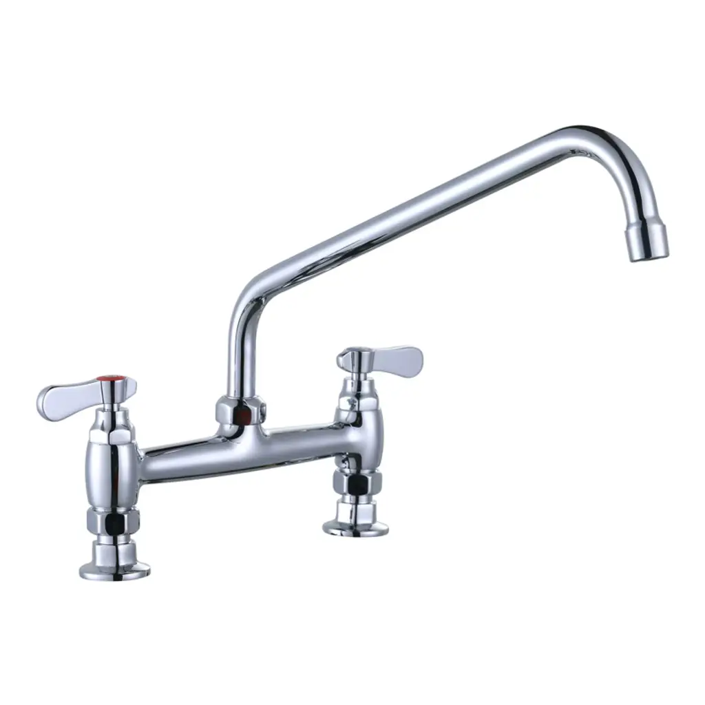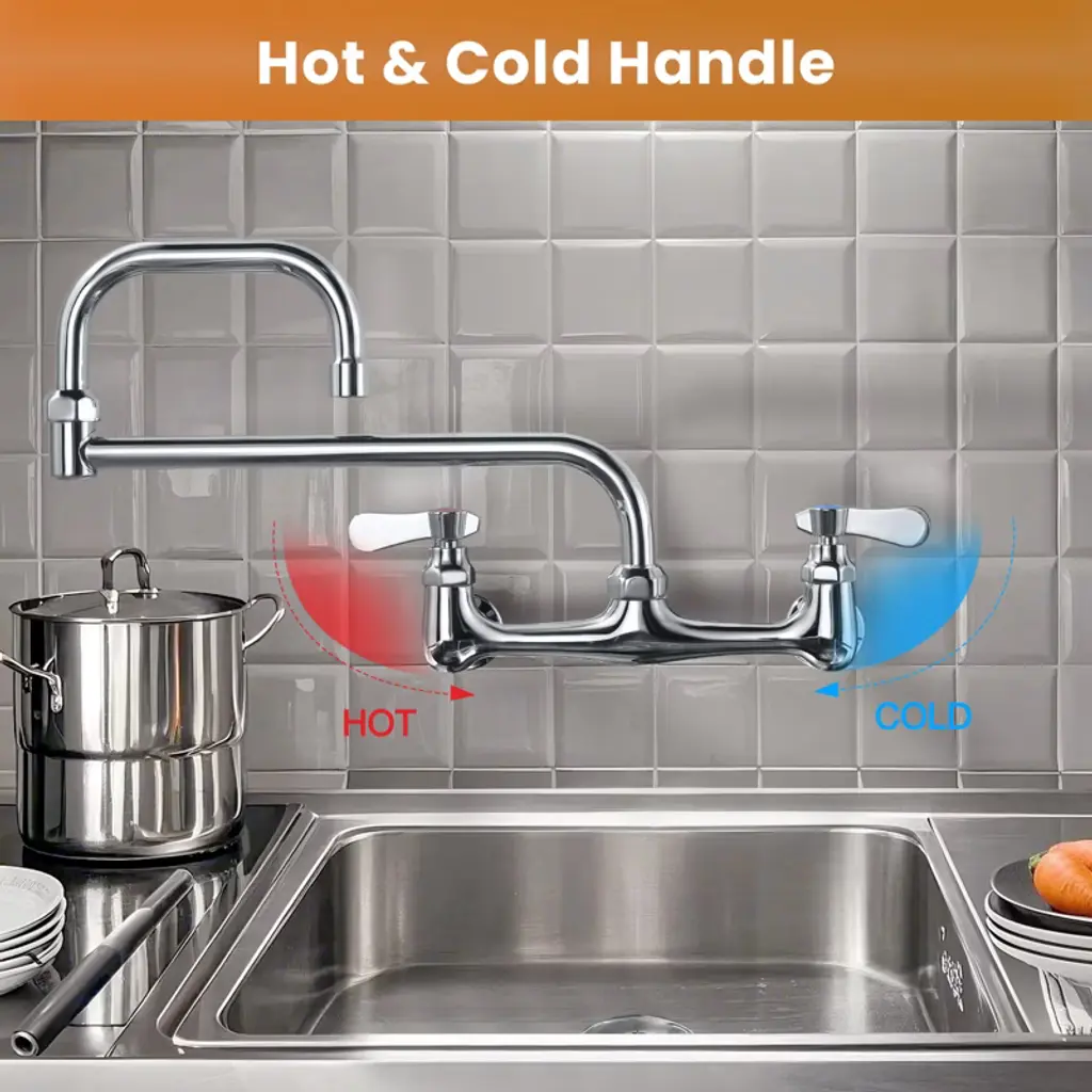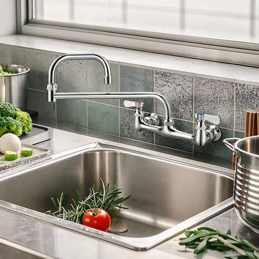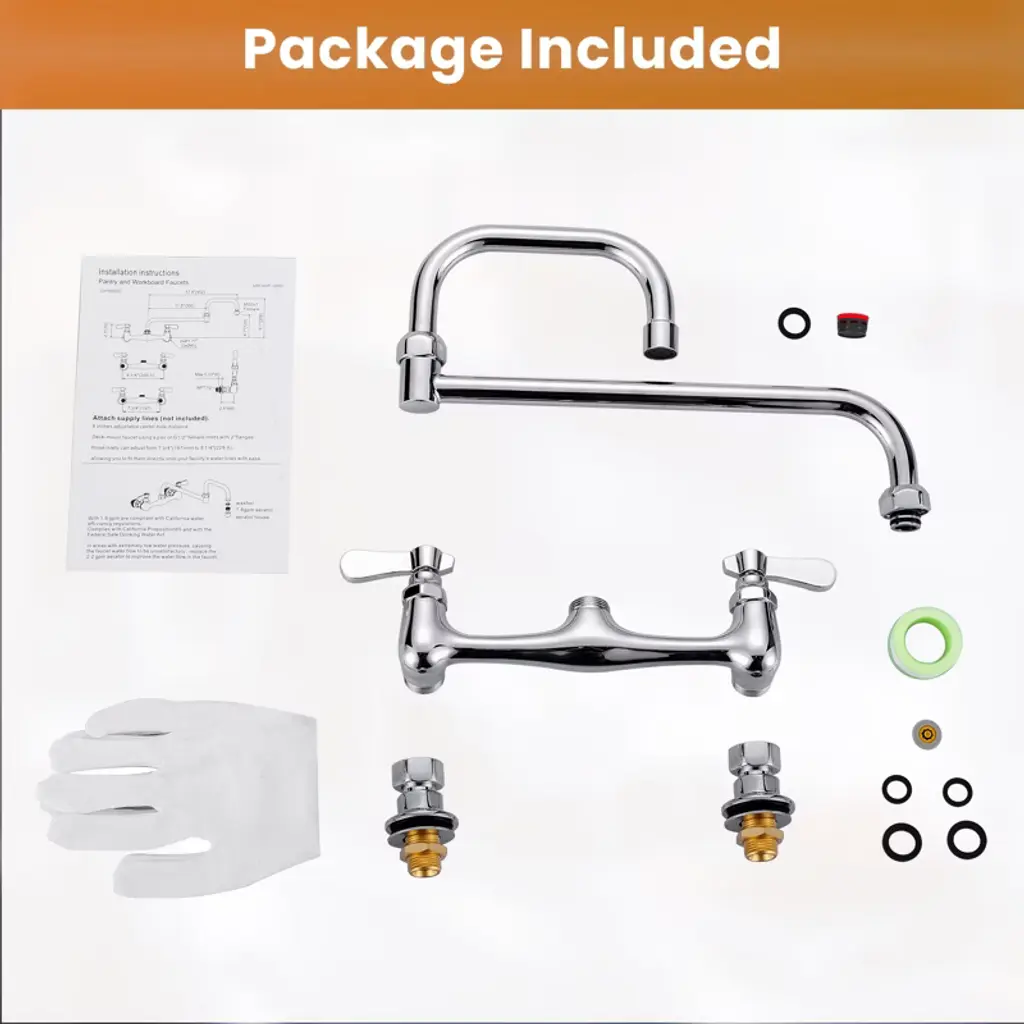 The Commercial Sink Faucet Kitchen features an adjustable wall mount, 8 in. adjustable center distance, and an eccentric flange design that allows for flexible center distance adjustments from 7.75 - 8.25 in. depending on space requirements. Made of solid brass for durability and resistance to high-intensity commercial environments. The surface is polished chrome, easy to clean, corrosion-resistant, and stylish to match all types of decorations. 18 inches long 360° swivel double-jointed rocker arm, easy to clean without dead ends. Two handles for precise temperature control, 2.2 GPM high flow rate with aerator, stable and quiet water flow. It is the right choice for restaurants, hotels, school cafeterias and other places with large water consumption