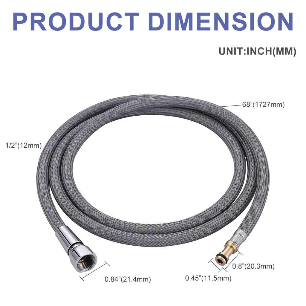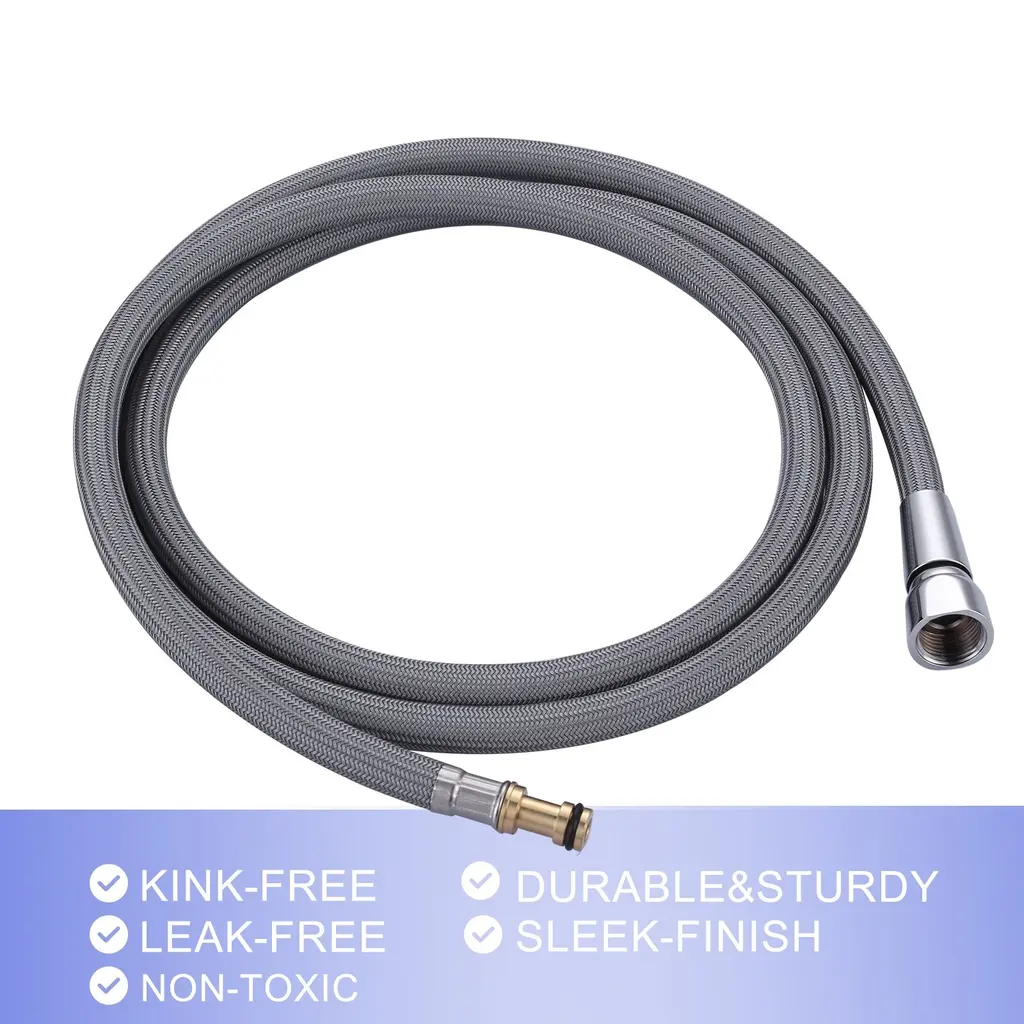 This pull-down/pull out replacement hose is made of tough braided nylon outer layer to ensure durability and resistance to abrasion. Features a stainless-steel nut that is solid and rust-proof for durability. Comes with high quality copper quick couplings for easy disassembly and sealing and is up to 68 in. long to allow for cleanliness with no dead ends.Feature:
