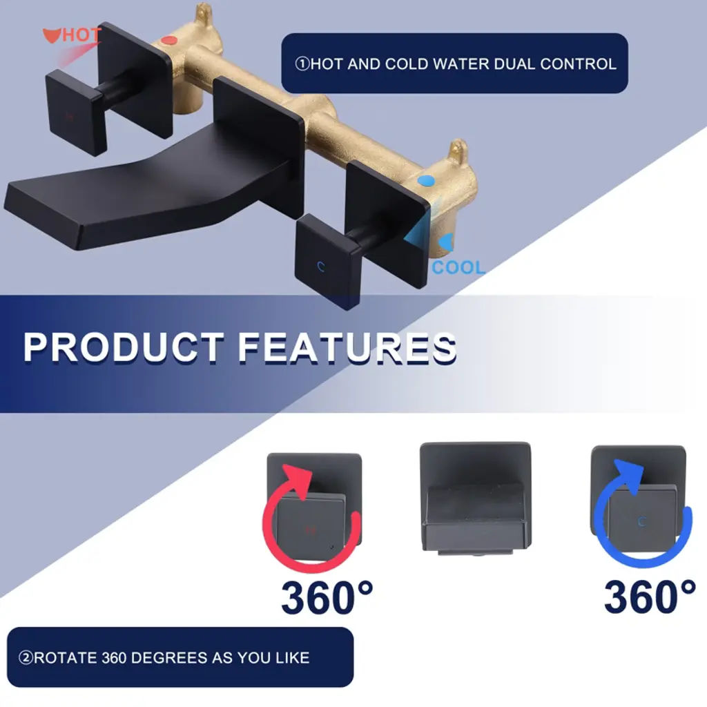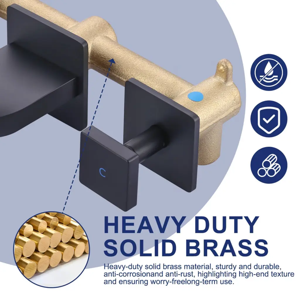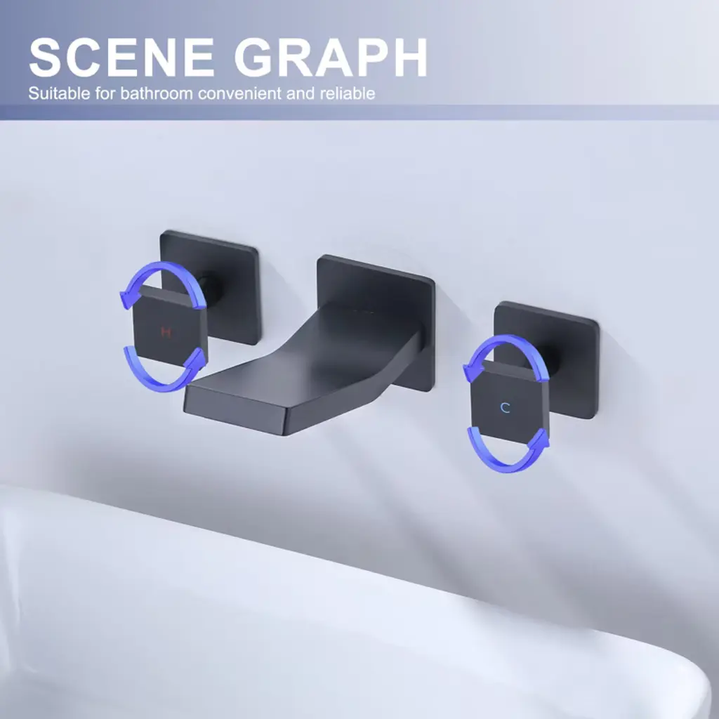 Wowow Modern Double Handle Wall Mounted Bathroom Faucet With Waterfall Spout In Matte Black