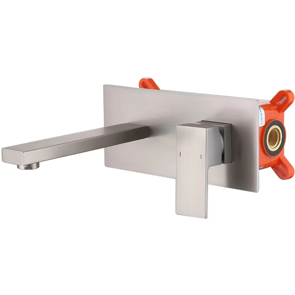 Upgrade your bathroom with this modern wall-mounted bathroom faucet. Its sleek design and brushed nickel finish add a touch of style while resisting scratches and corrosion. Made of solid brass and stainless steel, it is built to last. The waterfall spout creates a smooth, relaxing water flow, making each use feel like a spa experience. With double handle, you can easily control water flow and temperature. This faucet is space-saving and ideal for smaller bathrooms. The smooth surface is easy to clean and stays fingerprint-free. Comes with a brass rough-in valve and all parts needed for a quick and simple installation using standard US plumbing connections. Perfect for anyone looking to add both style and function to their bathroom.