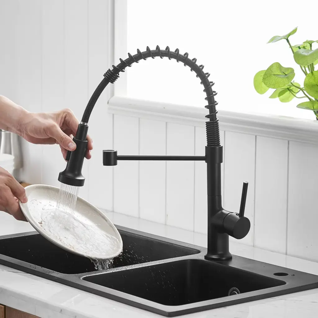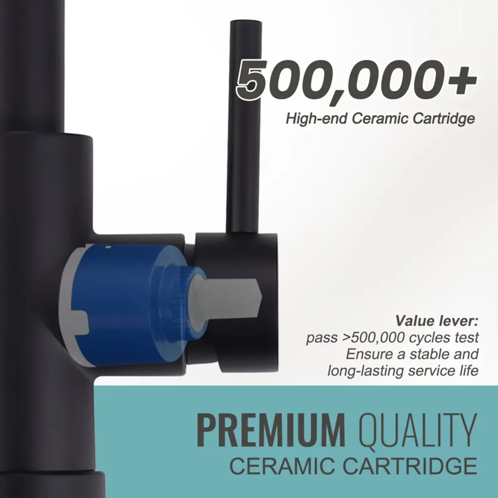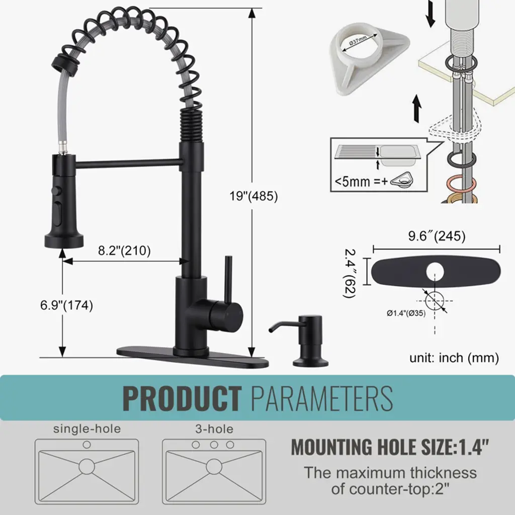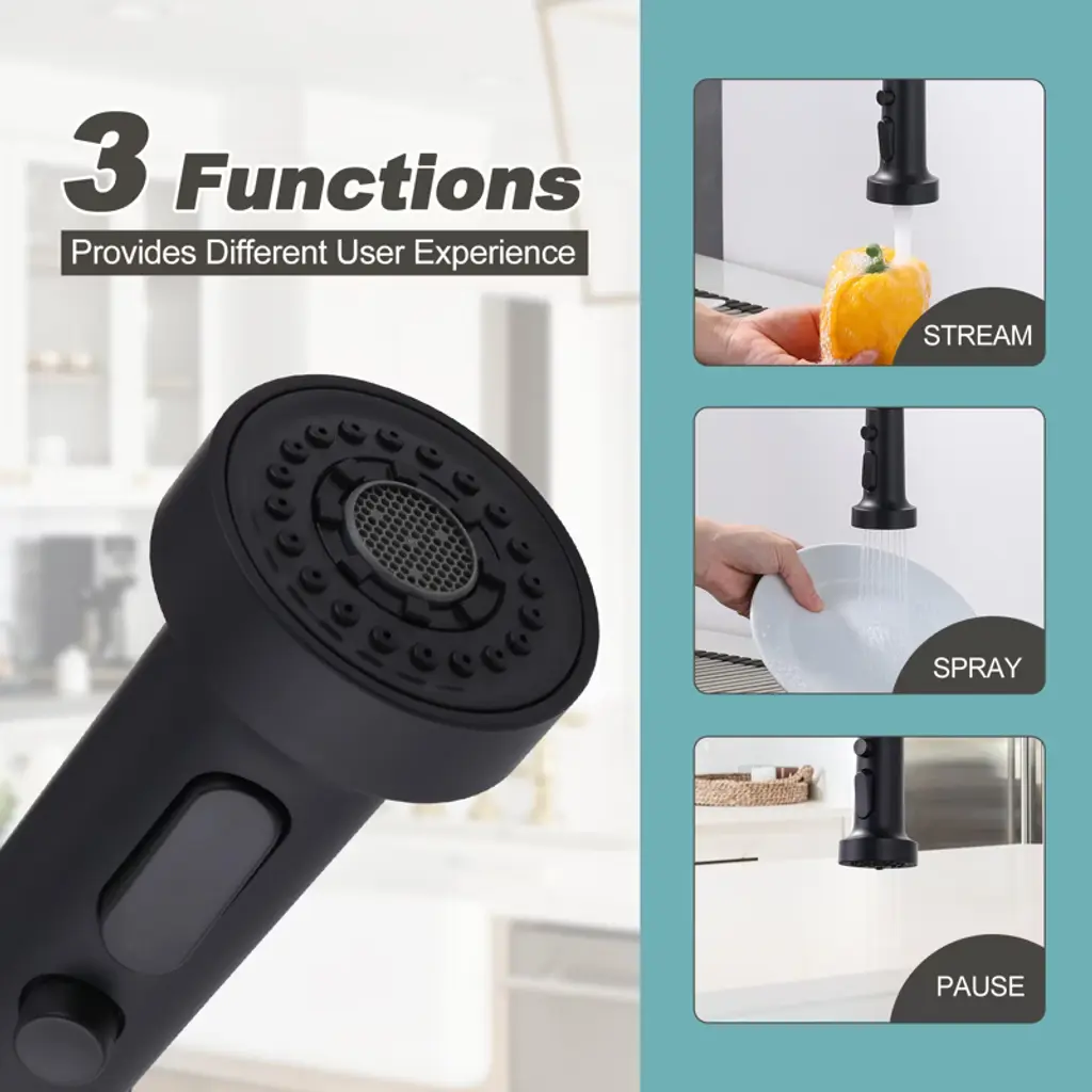 This high arc kitchen sink faucet is functional and practical.500ml hidden soap dispenser, easy to press and keep the table tidy.18-inch pull-out double hose for wide cleaning range. Multi-function sprayer has three modes: stream, spray and sweep to meet different needs. With 304 stainless steel valve body and ceramic spool, certified for water safety. Removable aerator is easy to clean, 360° rotating nozzle is convenient to use. Single handle operation, pre-installed hose with deck plate, easy to install, suitable for a variety of sinks.