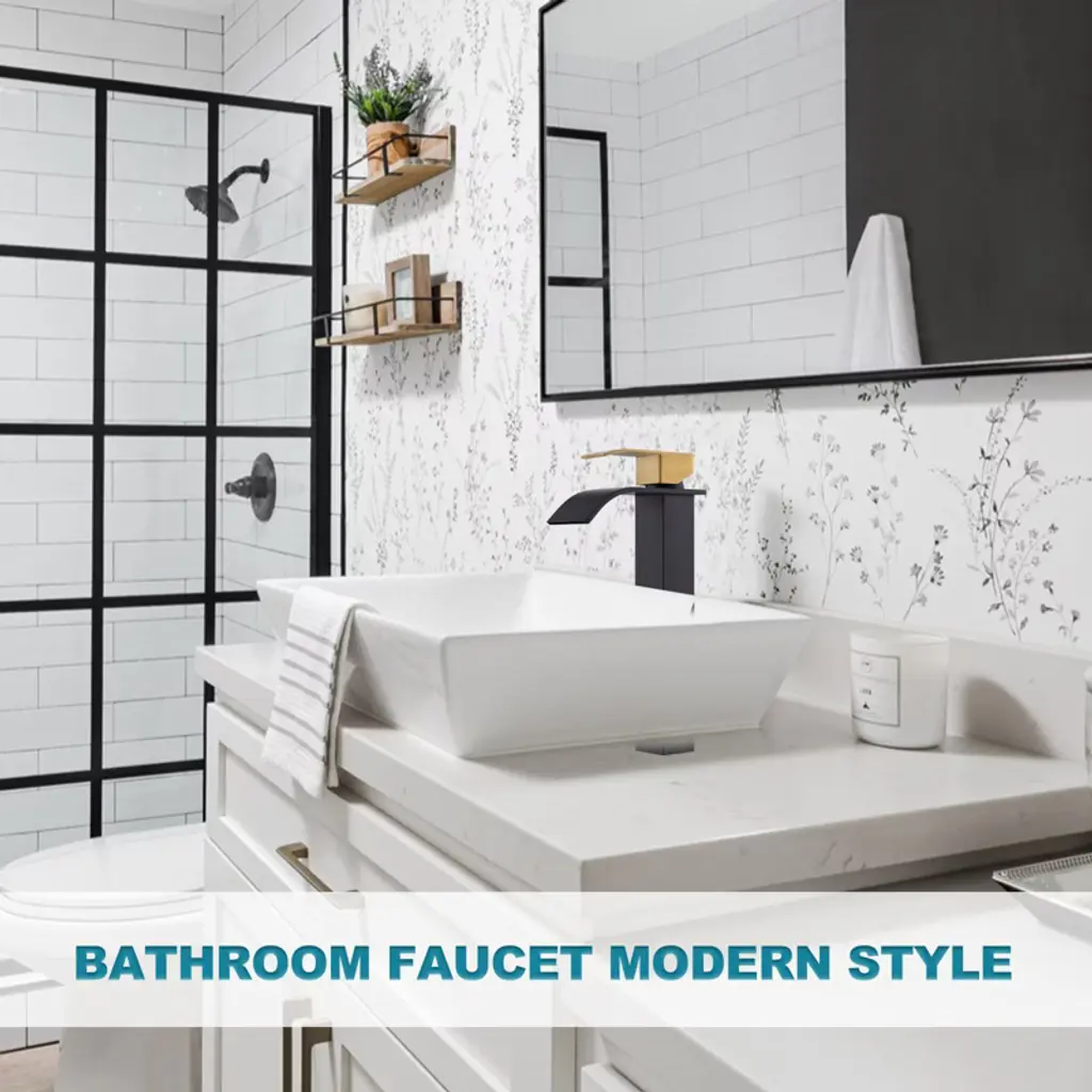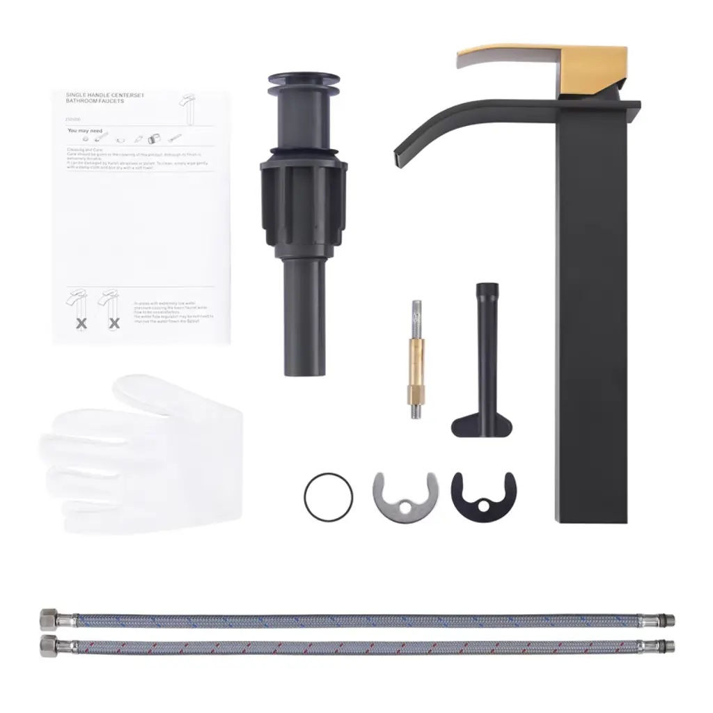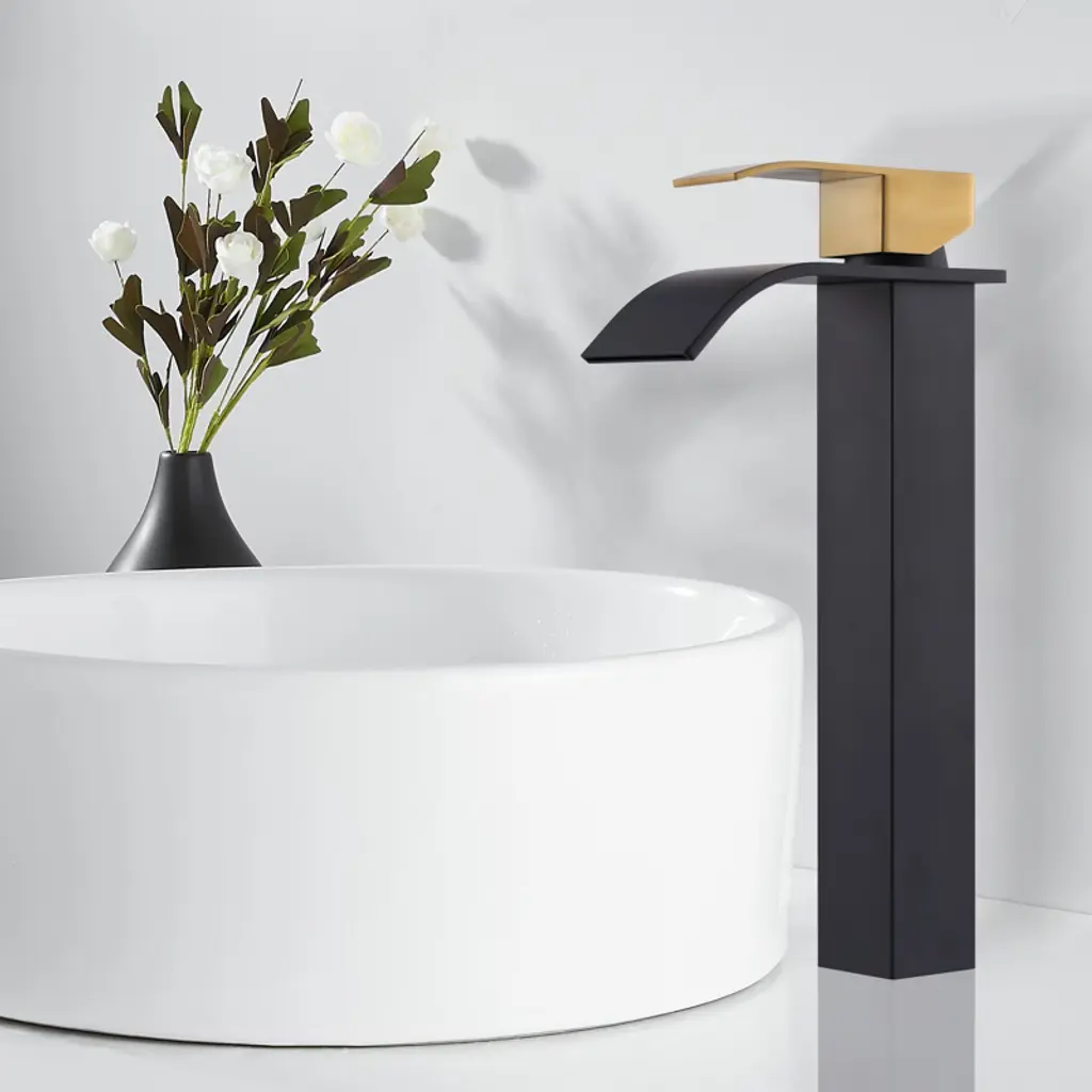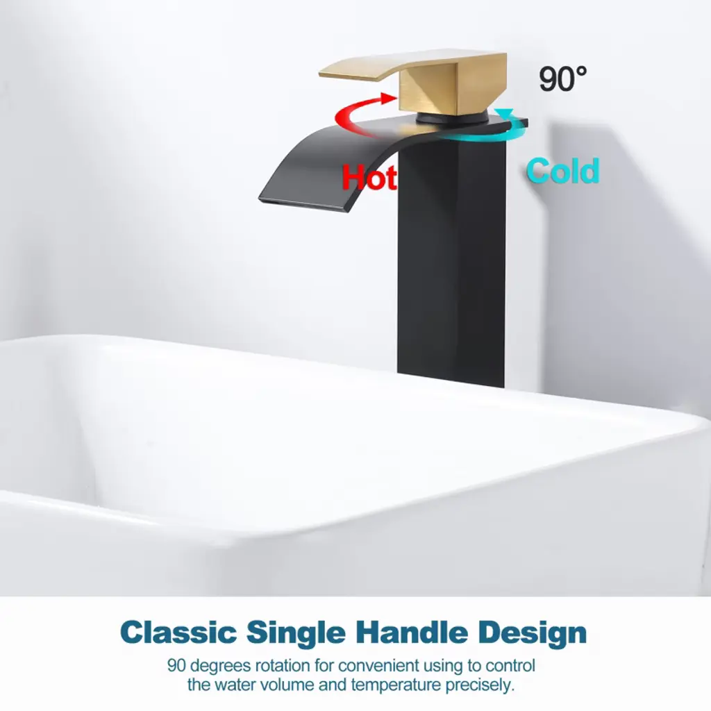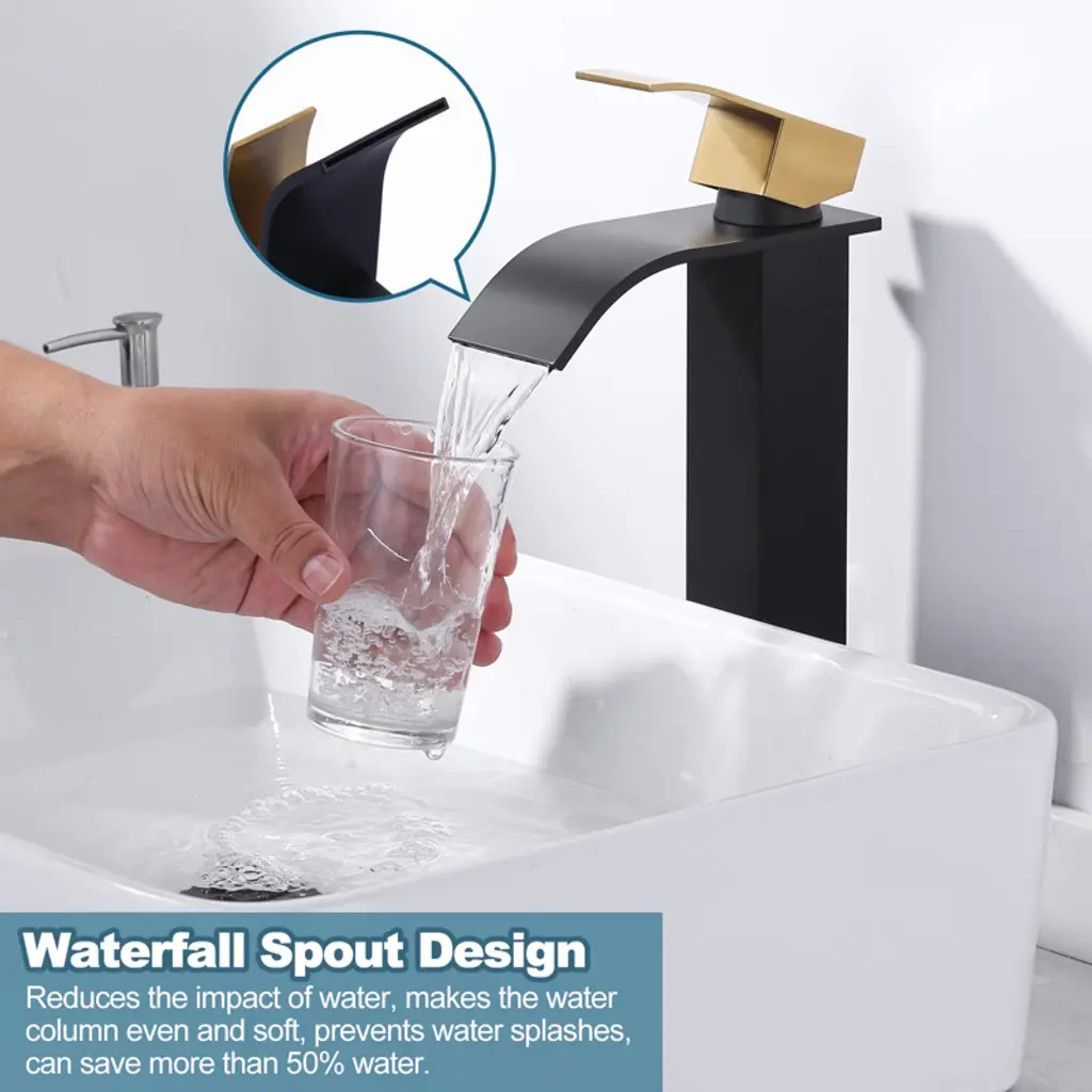 Wowow Single Handle Single Hole Waterfall Bathroom Faucet With Drain Kit Included In Gold And Black
