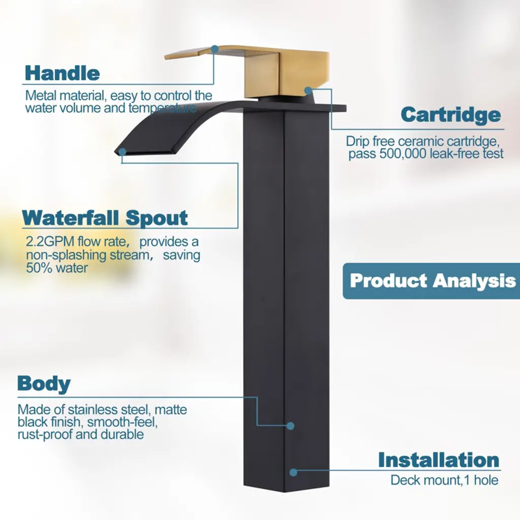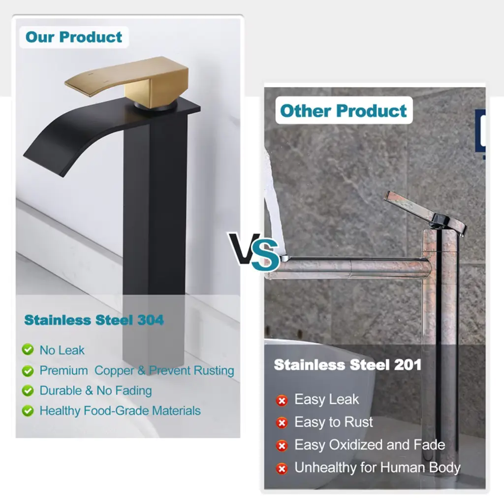 Waterfall flow, indulge in a luxurious bathing experience. This faucet features a waterfall-style spout design, with a 2.4-inch wide spout delivering an impressive waterfall effect. It is made of 304 stainless steel with a wear-resistant layer, ensuring durability. The tall faucet pairs beautifully with a vessel sink, becoming a striking highlight in the bathroom. The single-hole, single-handle design is minimalistic yet elegant, offering you an exceptional and convenient water-use experience.