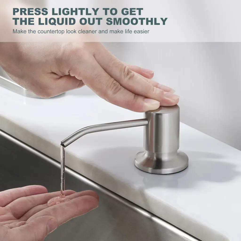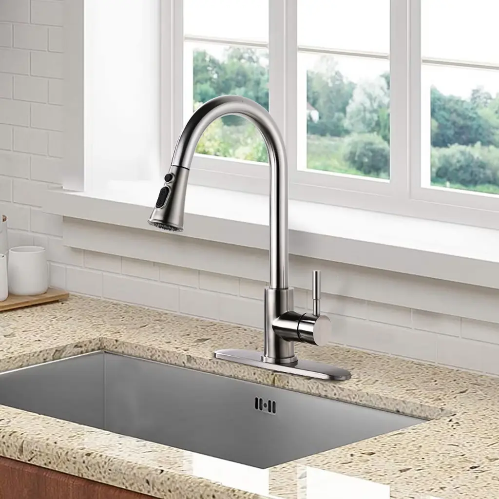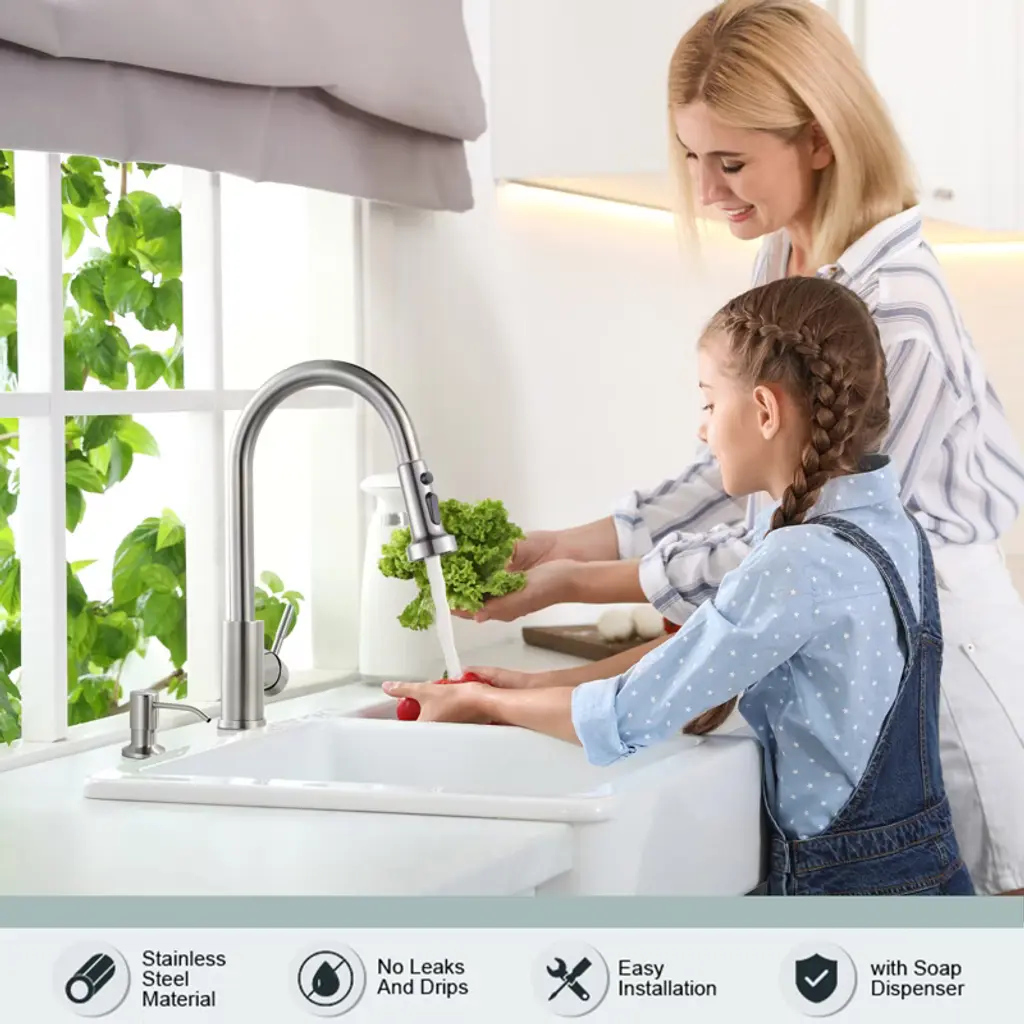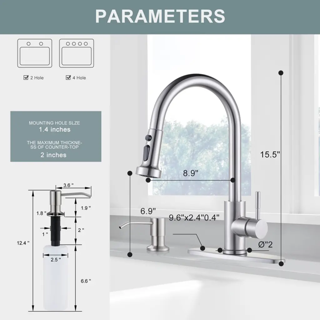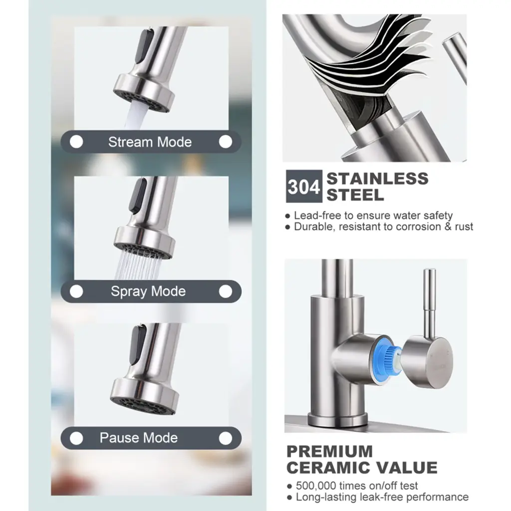Designed for busy households, this kitchen faucet features a 15.5-inch high-arc spout to easily rinse large pots. The 304 stainless steel finish resists fingerprints and wipes clean effortlessly. Three spray modes adapt to every task—use the stream mode for quick filling, the spray mode for full sink coverage, and the pause mode for convenient using. The ceramic disc cartridge passed 20,000-cycle tests to ensure zero leaks. The 500mL built-in soap dispenser delivers precise detergent doses with one push, eliminating countertop clutter. Compatible with most sink configurations, install in 15 minutes and transform your kitchen instantly!