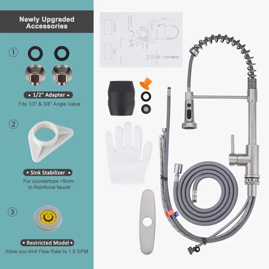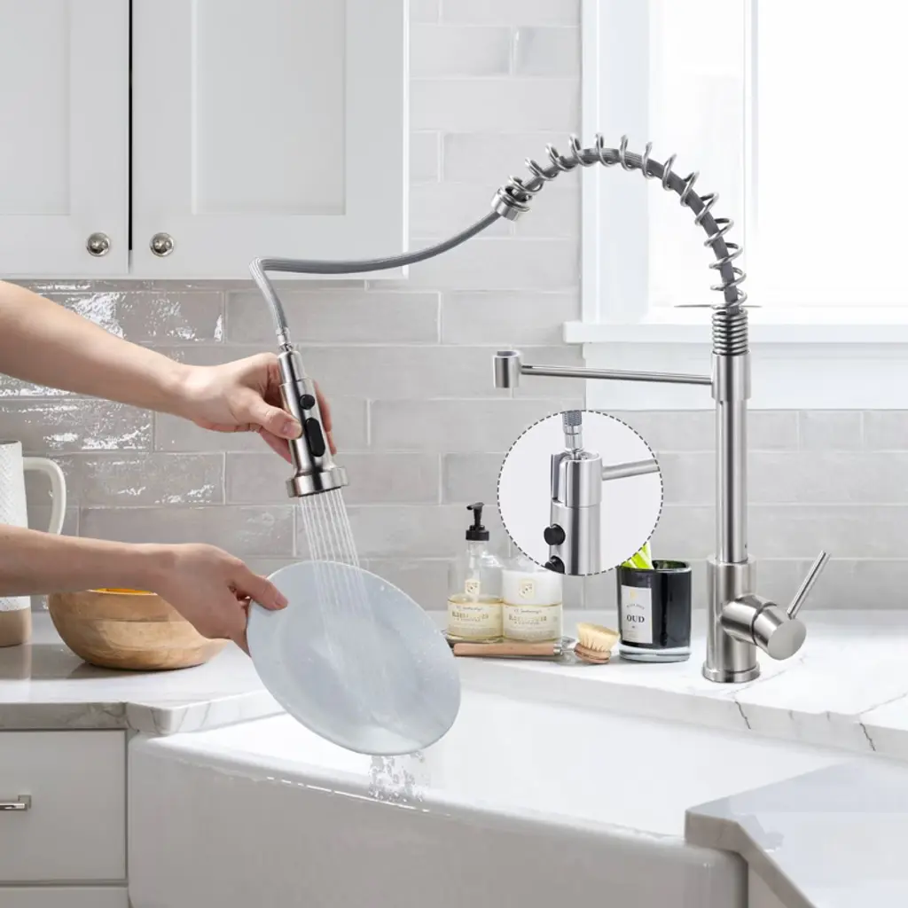Are you still looking for a durable faucet this stainless-steel spring faucet is the perfect choice for you. Designed with a single handle and 9.6 in. panel, this faucet is suitable for both single and 3-hole installations. It has a clean and elegant look that matches the modern home style and will fit perfectly into your kitchen. The high-quality stainless-steel construction, multi-functional spray head, adjustable flow rate and solid installation will add more convenience and comfort to your life.