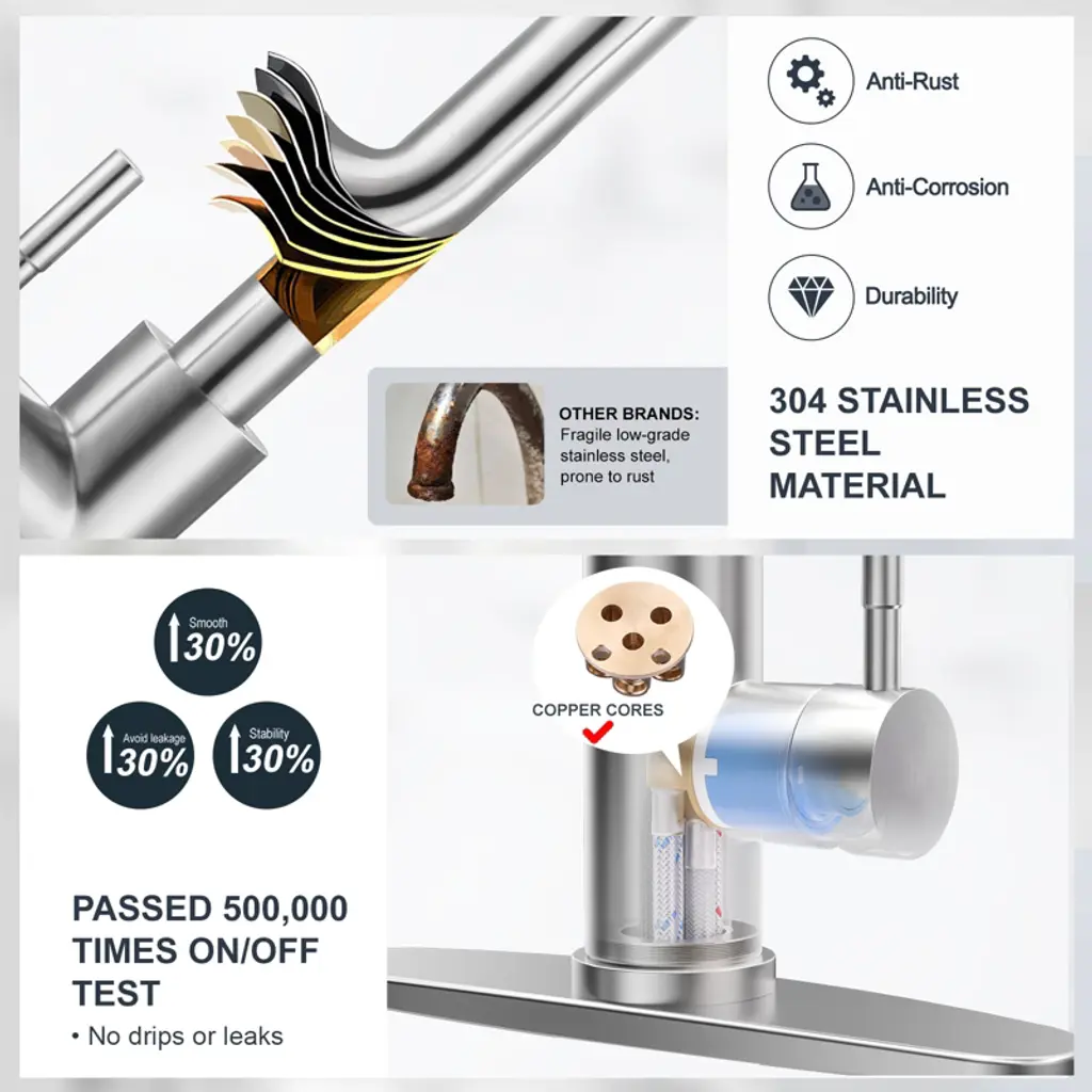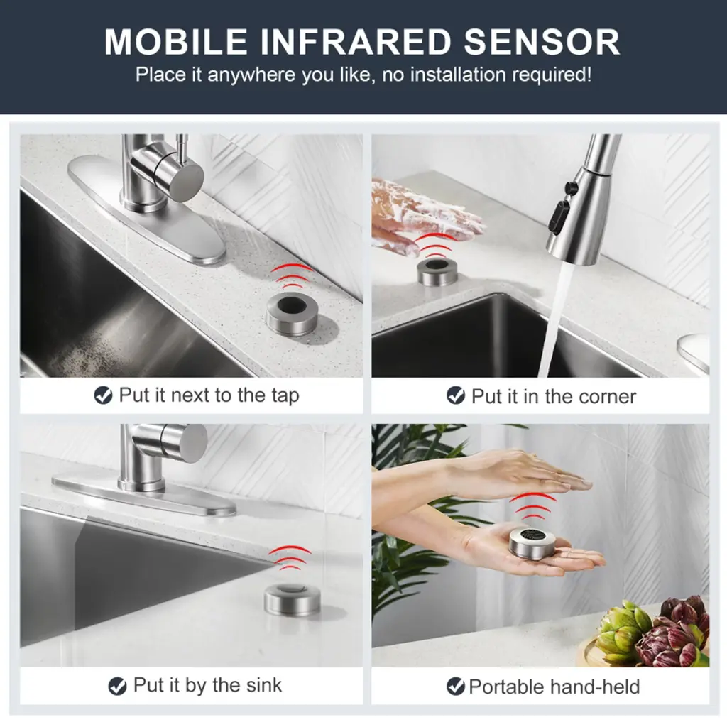 If you want a hands-free experience but are limited by difficult installation environments such as cramped or strong direct Sunlight interference, then it will also open up more possibilities for you. This touchless kitchen faucet is a great addition to any modern kitchen. This faucet stands out by a portable sensor, which can be placed wherever you like for a better experience. It is made of high quality stainless steel that will resist rust and corrosion. The faucet is easy to install and it comes with all the necessary hardware and instructions.