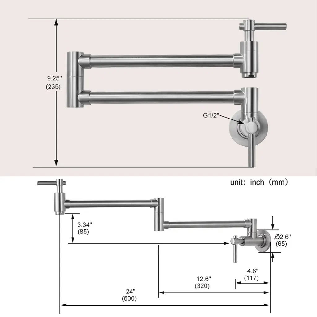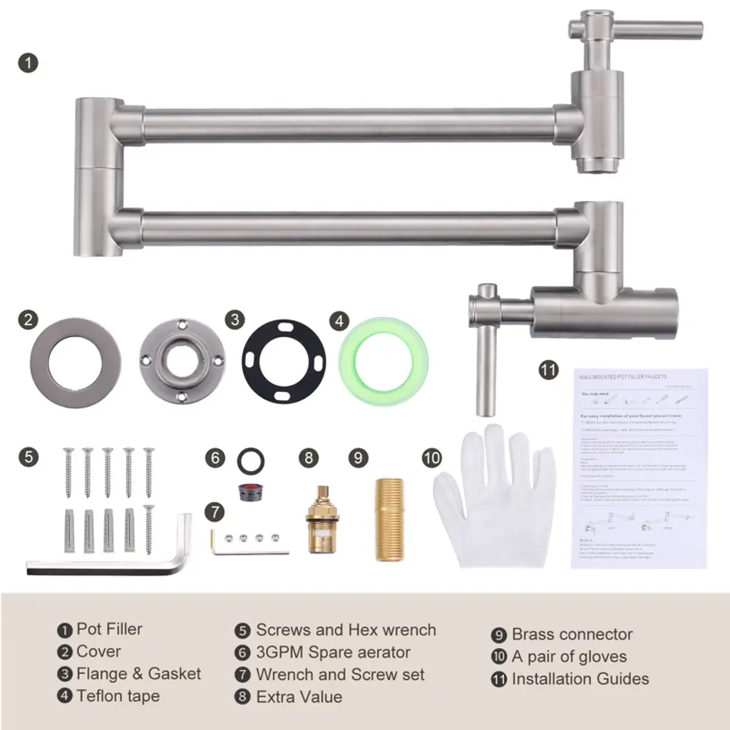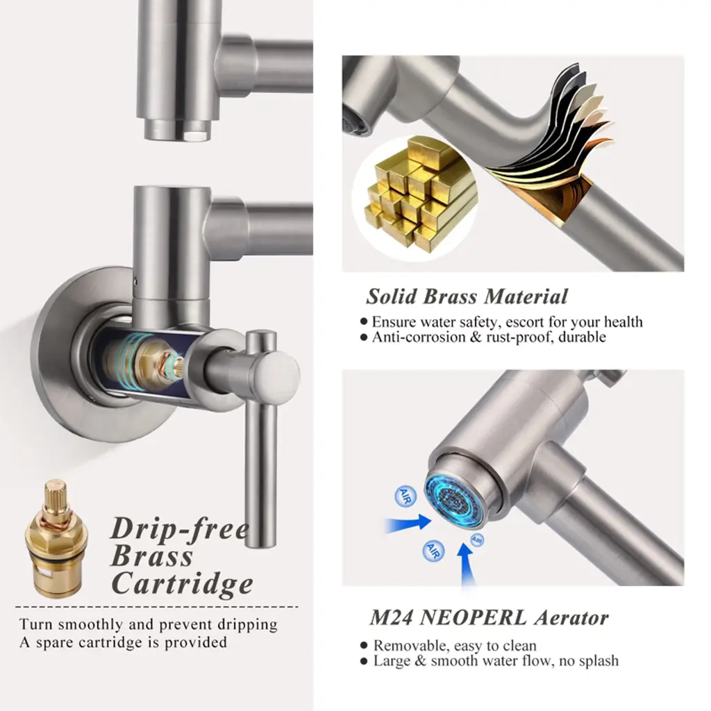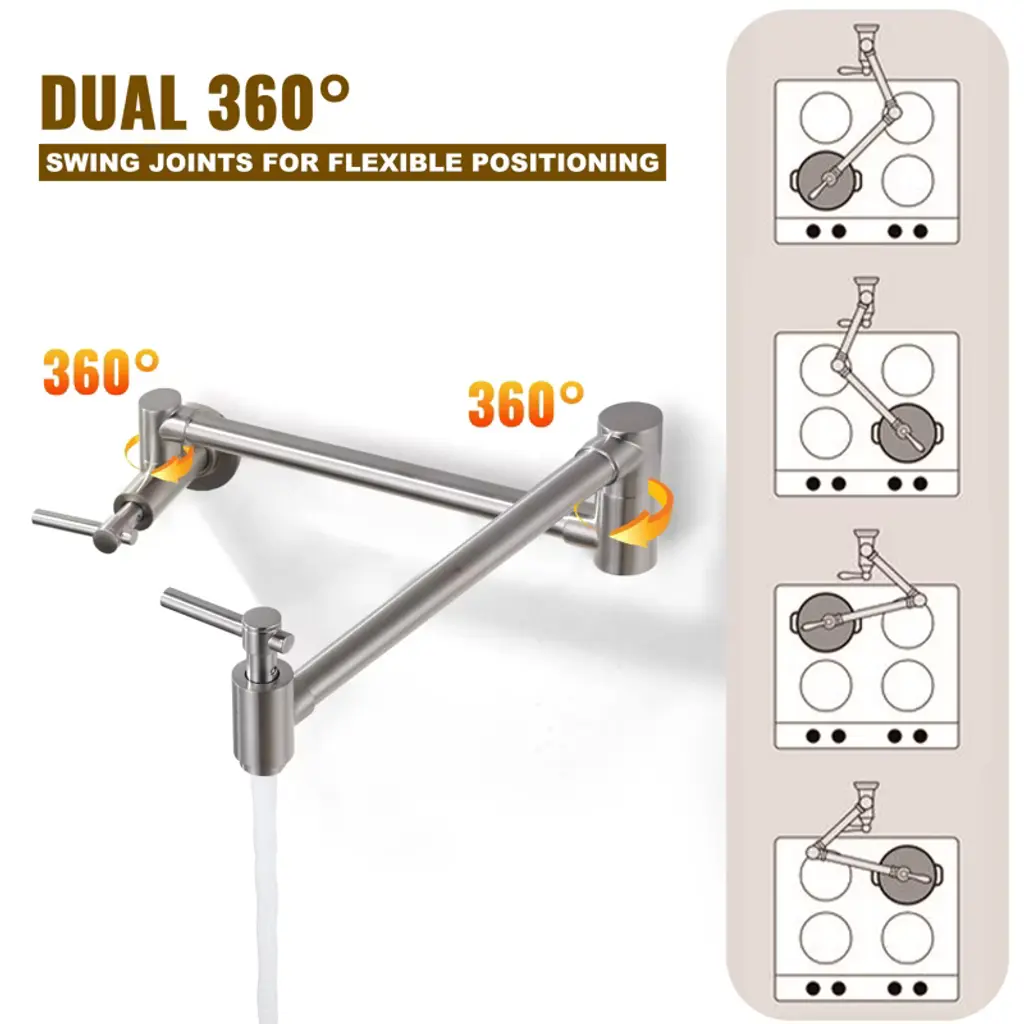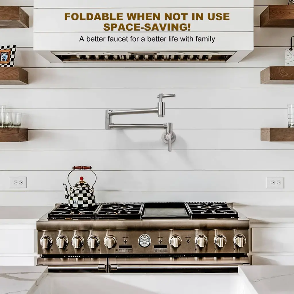 Adding a stove faucet to get water directly for the cookware, you'll never have to laboriously lift a pot full of water from the sink to the stove! This wall-mounted kitchen pot filler faucet made of solid brass material, it's heavy-duty and sturdy, rust-free and corrosion-resistant. Dual handles provide smooth turning for easy on/easy off and prevent drips. Designed to retract and swivel above your stove, this product makes cooking tasks efficient and creates a clean environment. This wall-mounted folding pot filler is the convenience you need for your kitchen. The folding faucet can be retracted effortlessly, making adding water to a pot easy. The wall-mounted design saves space, keeping your kitchen tidy.